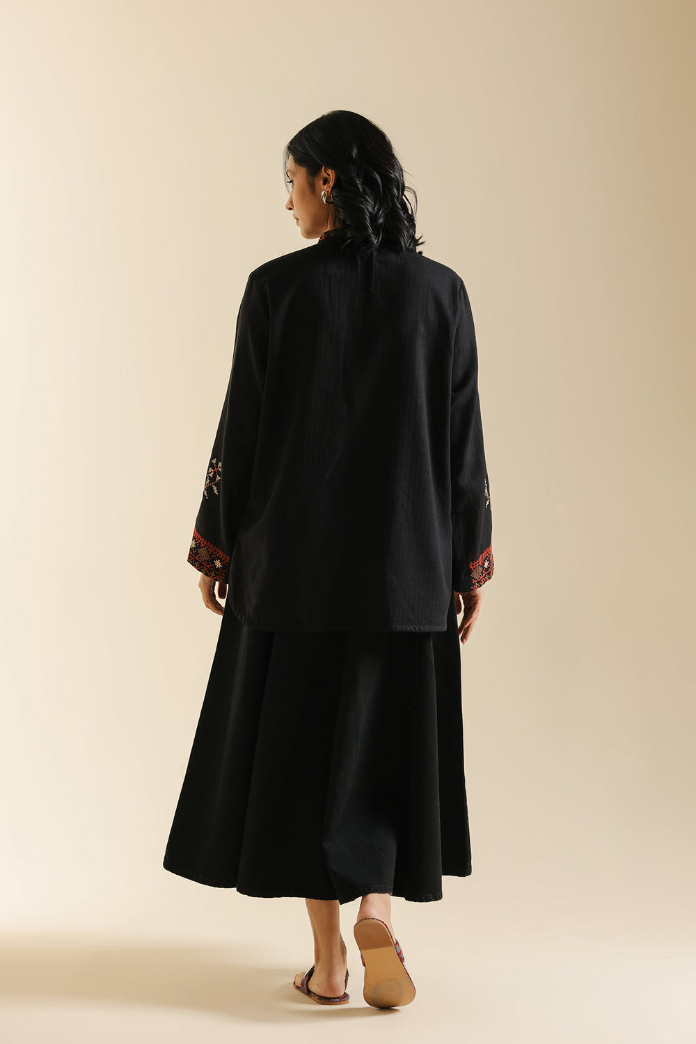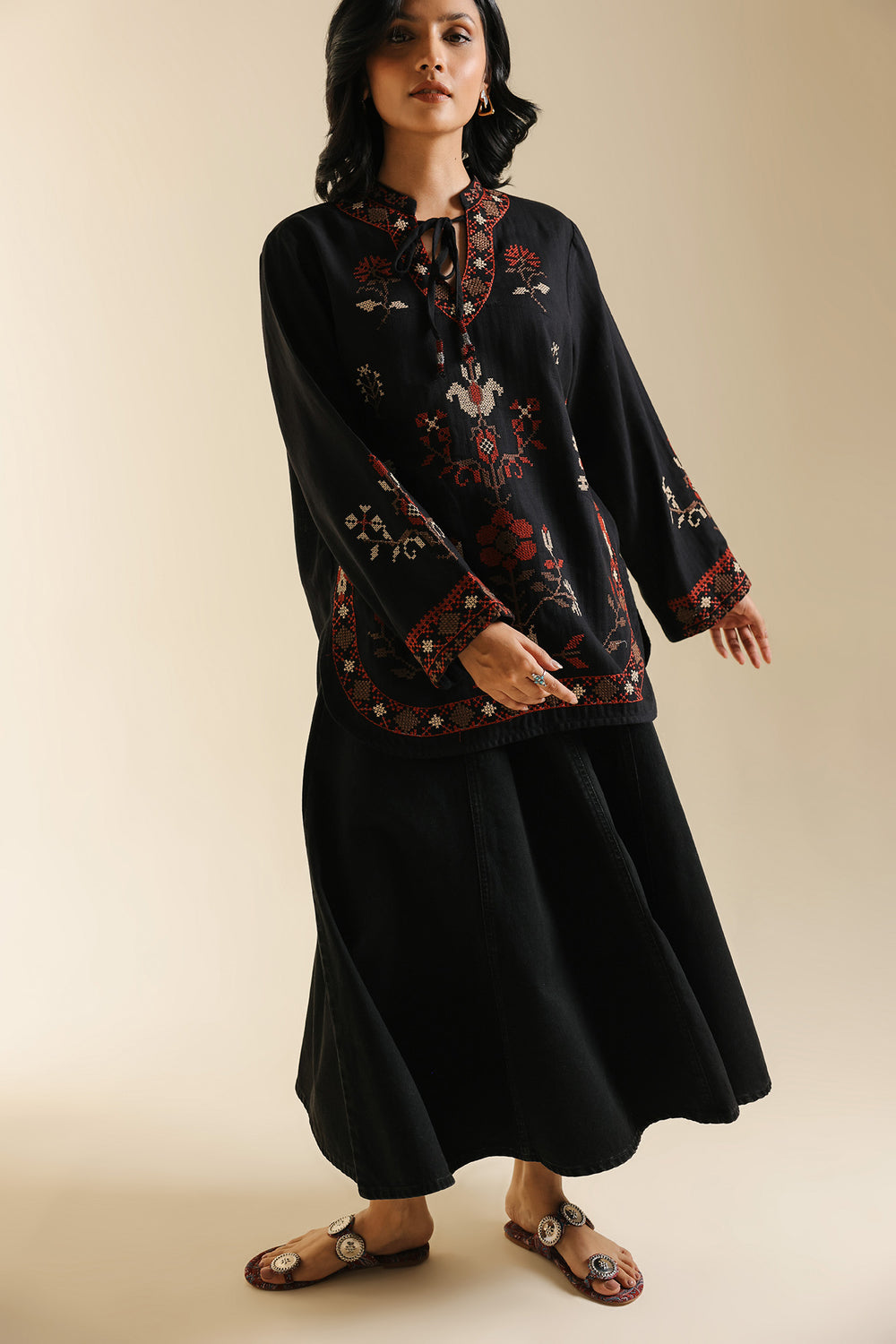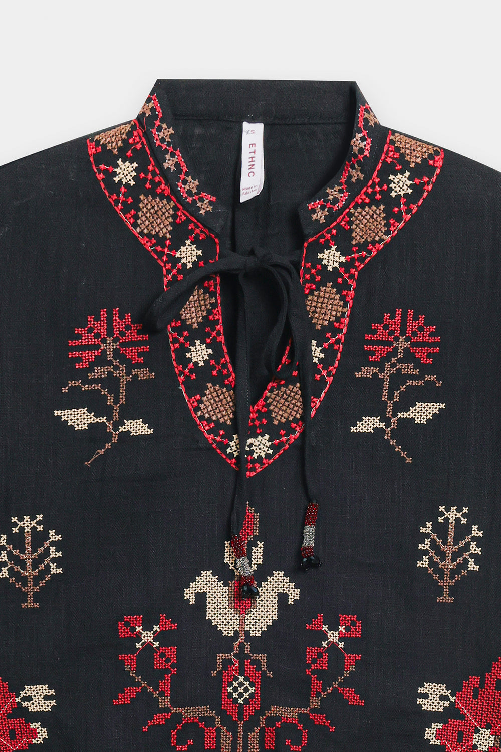 Showcase the richness of traditional artistry with this captivating black embroidered top. This exquisite piece is crafted from a sophisticated black fabric, offering a beautiful canvas for the detailed embellishment. The top is generously adorned with intricate red, black, and earthy-toned floral and geometric embroidery that covers the front yoke, extending down the chest and cuffs. Featuring a relaxed, slightly long-line silhouette, a ban neck with a delicate tie closure, and comfortable full-length sleeves, this top beautifully merges comfort with a highly detailed, celebratory aesthetic, making it an ideal choice for pairing with a solid skirt or trousers.
