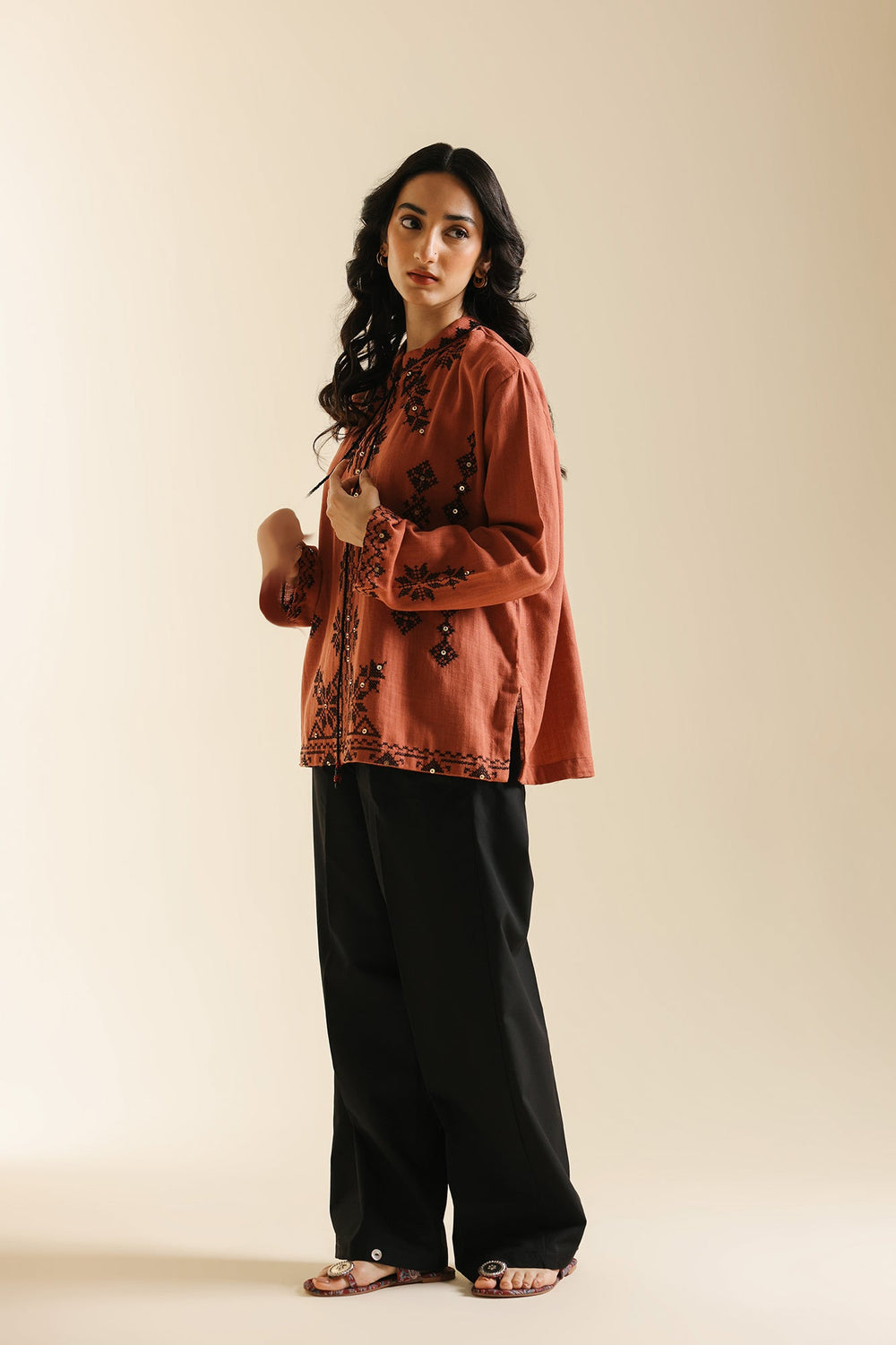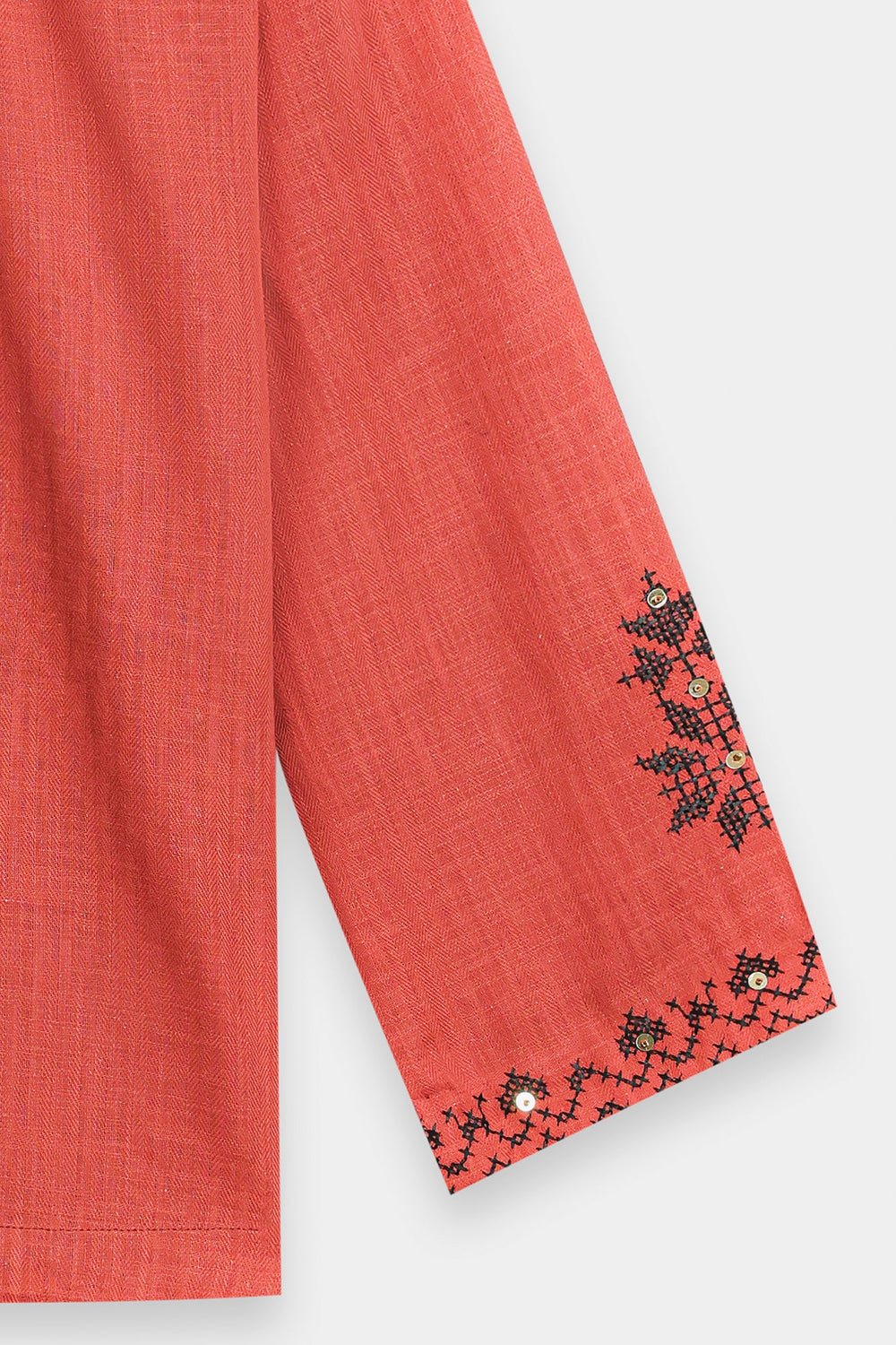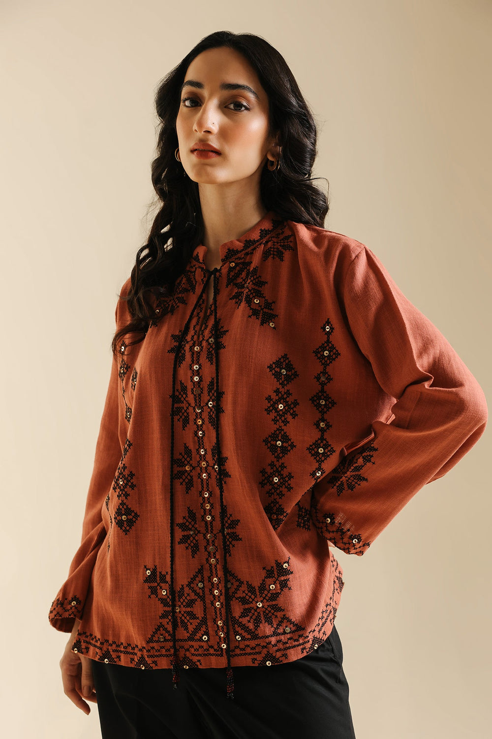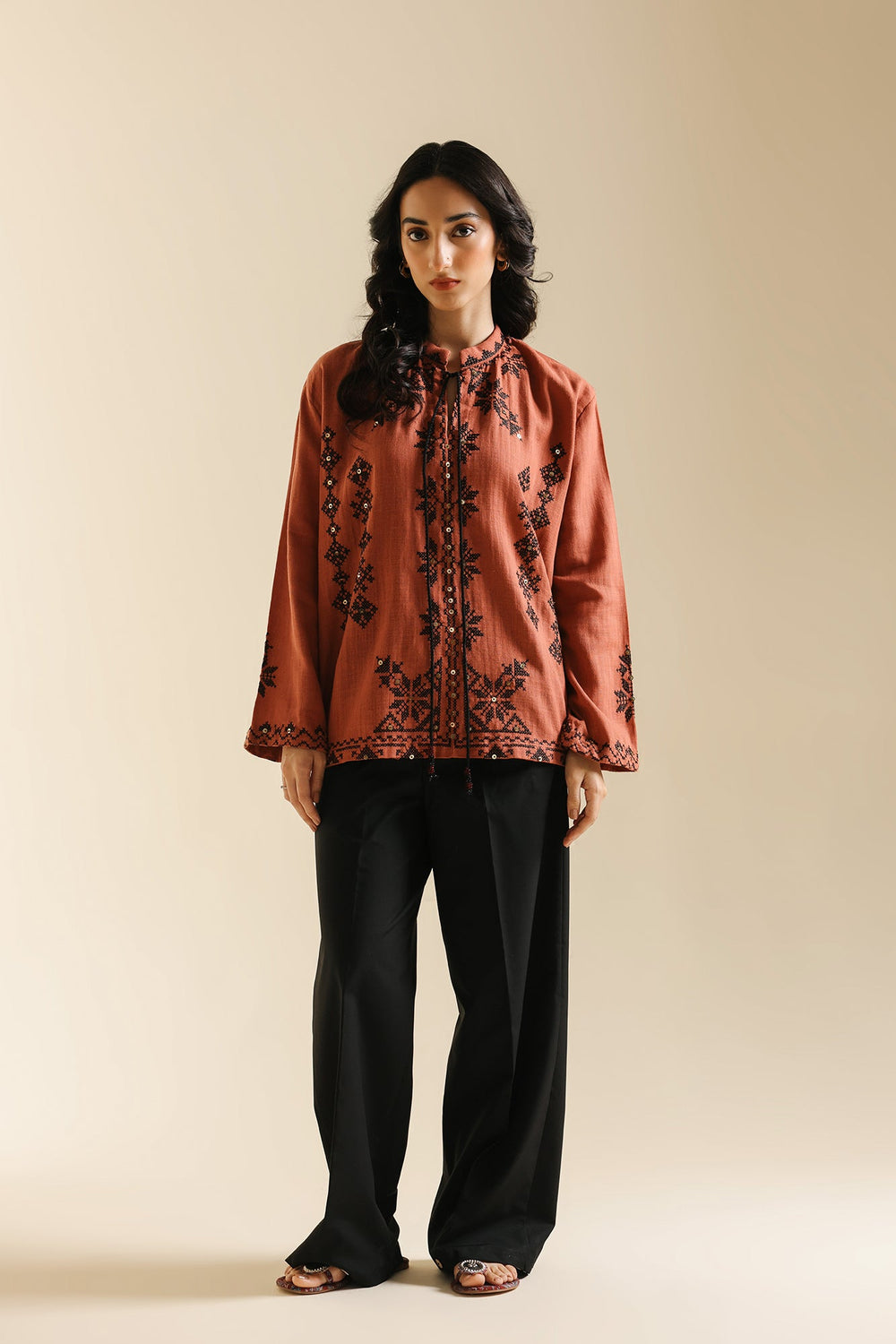 Add vibrant color and artisanal texture to your wardrobe with this stylish top. Crafted in a warm rust hue, this straight-fit shirt is adorned with intricate black embroidery, creating dense geometric patterns across the front. It features an open front with a subtle tie closure and wide, relaxed sleeves for effortless comfort. This beautifully embroidered piece brings a chic, bohemian touch to any pairing.