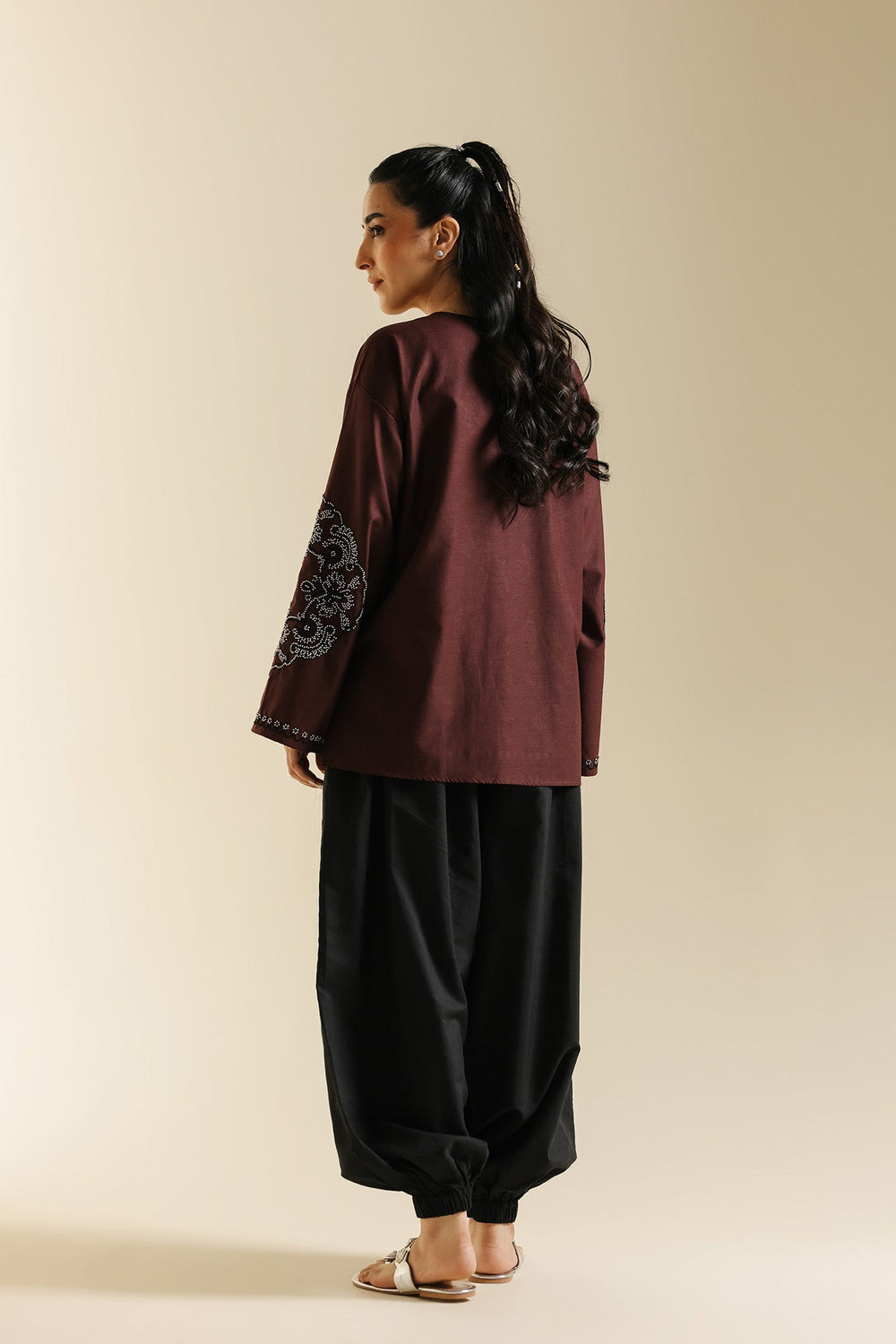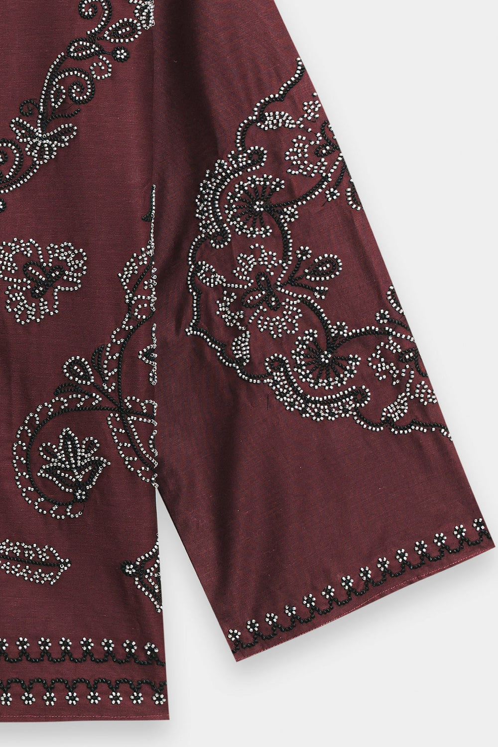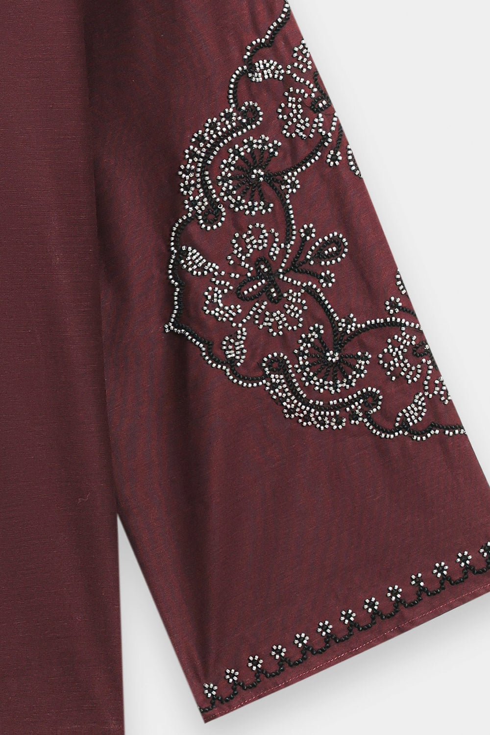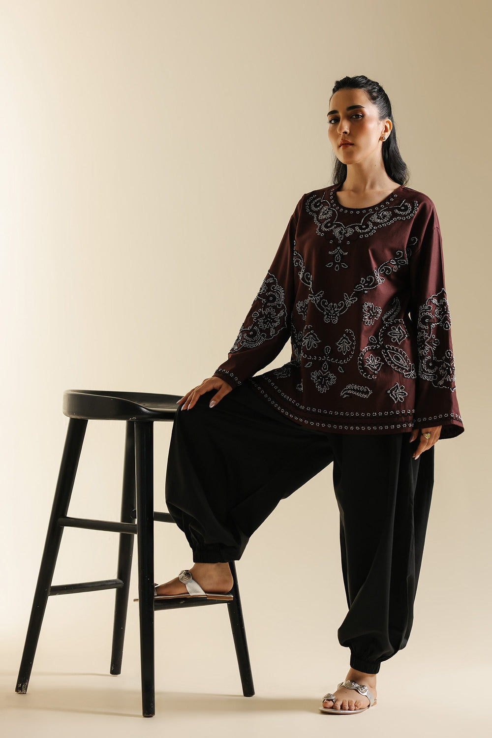 A rich maroon long-sleeve top featuring intricate black and white embroidered motifs across the front, sleeves, and hemline. The design showcases a blend of floral and ornamental patterns, giving the piece a refined, artisanal aesthetic. The relaxed silhouette and soft fabric offer a comfortable yet elevated look, perfect for casual chic or semi-formal styling. The model pairs it with dark bottoms for a balanced and sophisticated appearance.