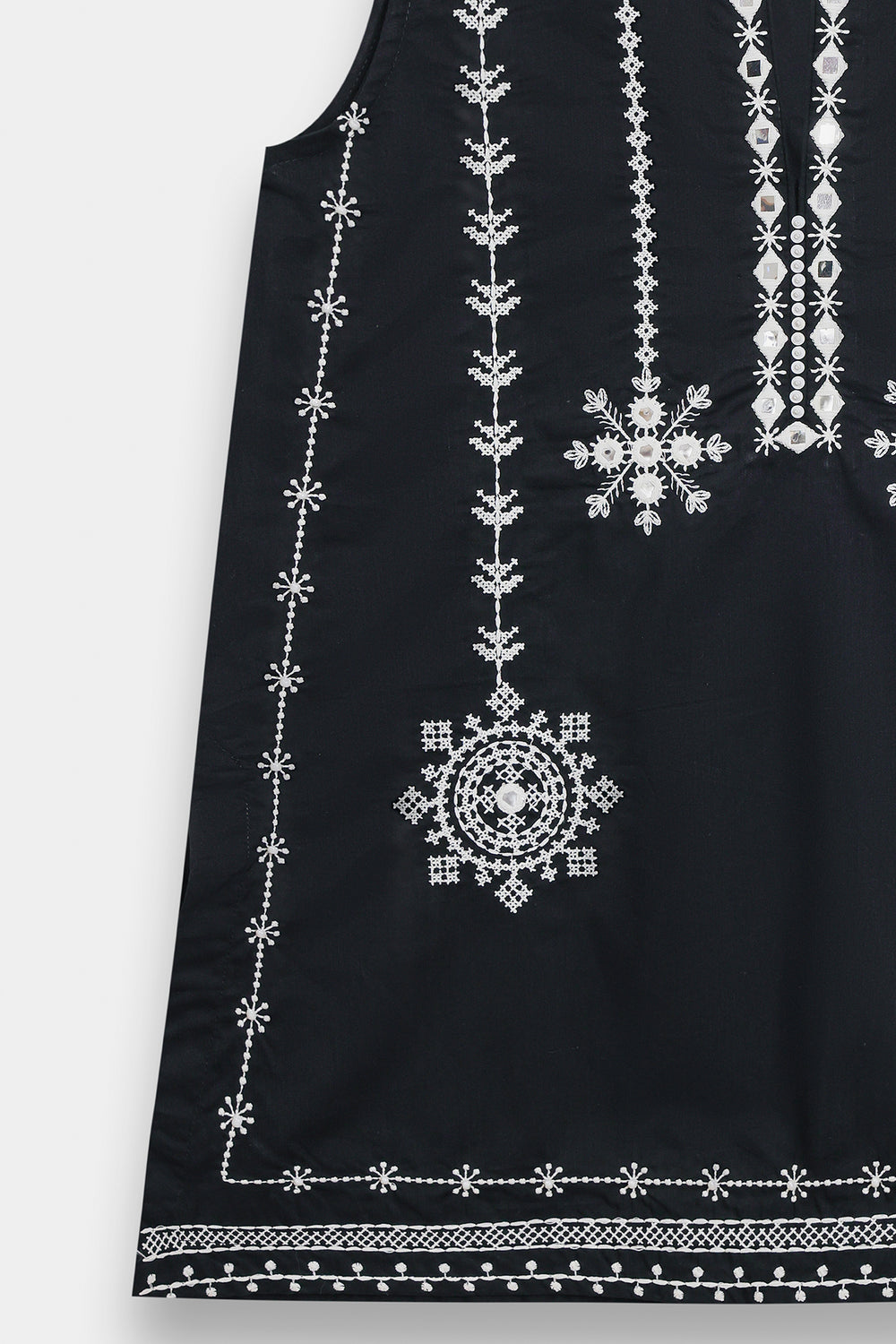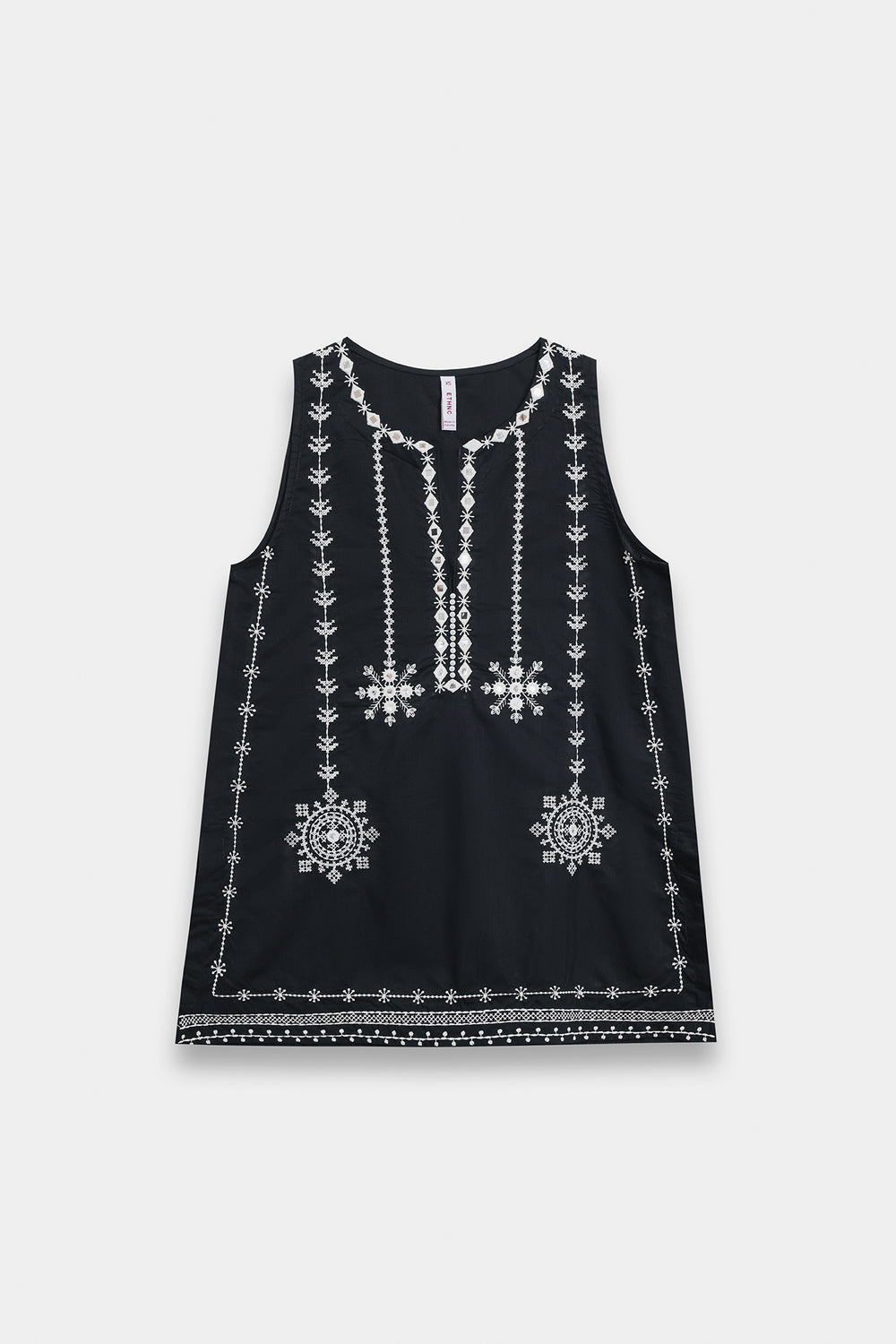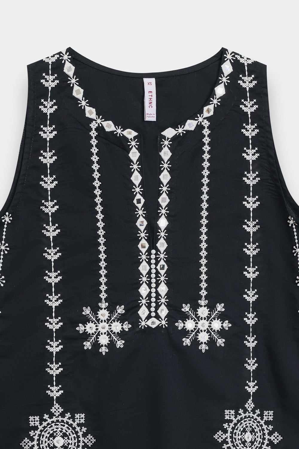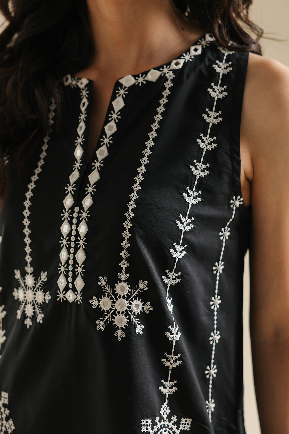 Embrace a sleek and modern ethnic aesthetic with this sleeveless black kurti, designed with a clean, straight silhouette. The piece features a contemporary split neckline and is beautifully accented with crisp white geometric embroidery that creates a striking contrast. Intricate star-burst and circular motifs are artfully arranged along the neckline and across the front, while a delicate embroidered border finishes the hemline. This kurti offers a sophisticated and breezy look for any daytime occasion.