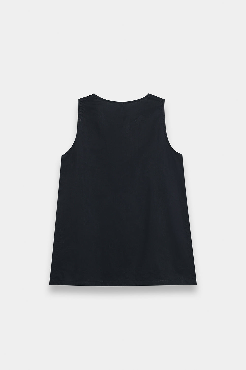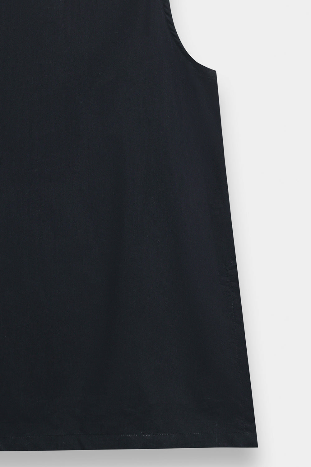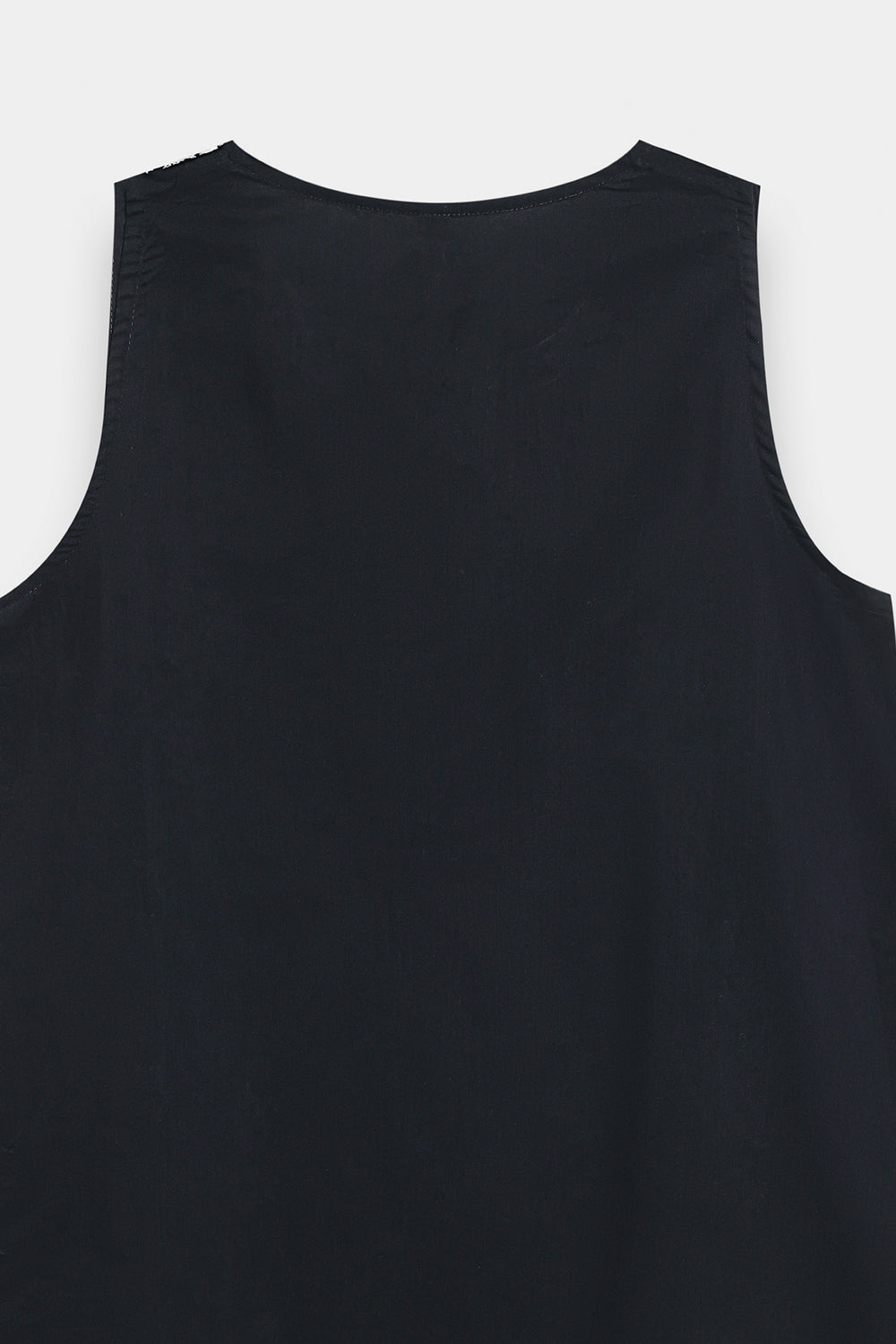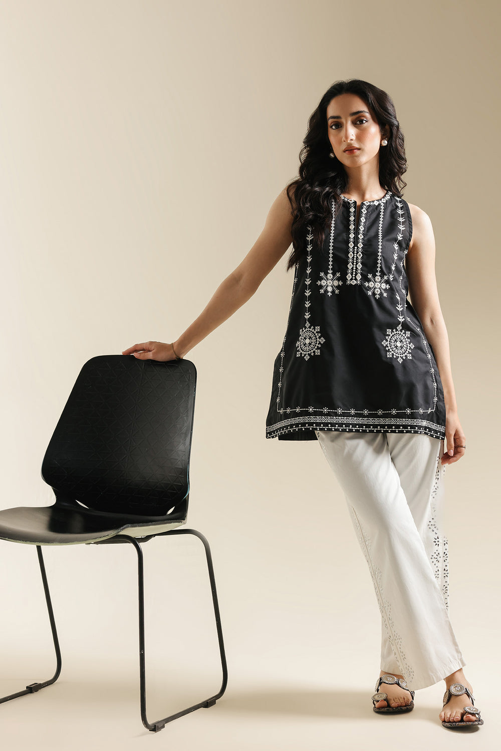 Embrace a sleek and modern ethnic aesthetic with this sleeveless black kurti, designed with a clean, straight silhouette. The piece features a contemporary split neckline and is beautifully accented with crisp white geometric embroidery that creates a striking contrast. Intricate star-burst and circular motifs are artfully arranged along the neckline and across the front, while a delicate embroidered border finishes the hemline. This kurti offers a sophisticated and breezy look for any daytime occasion.