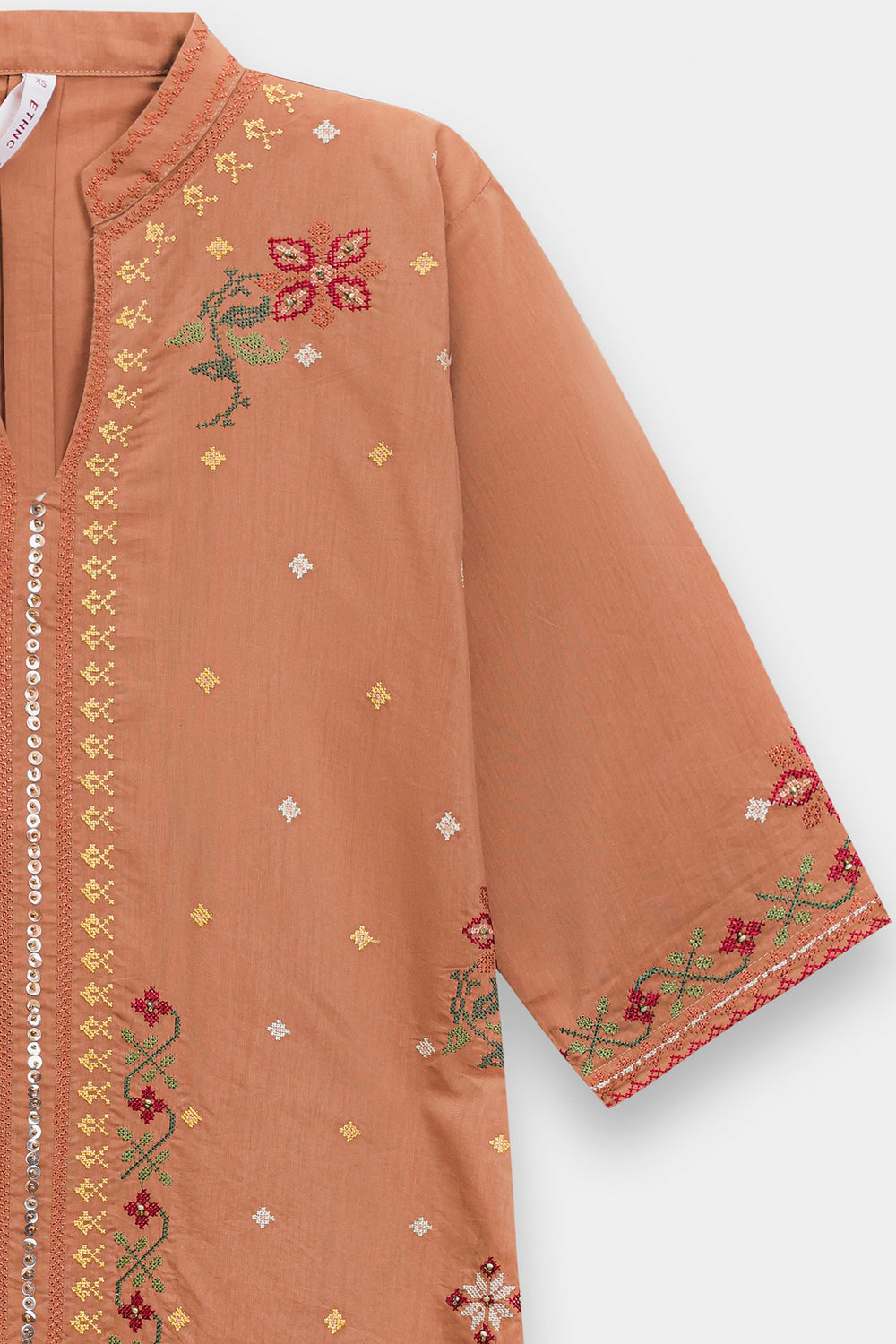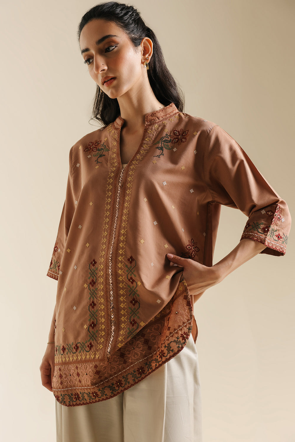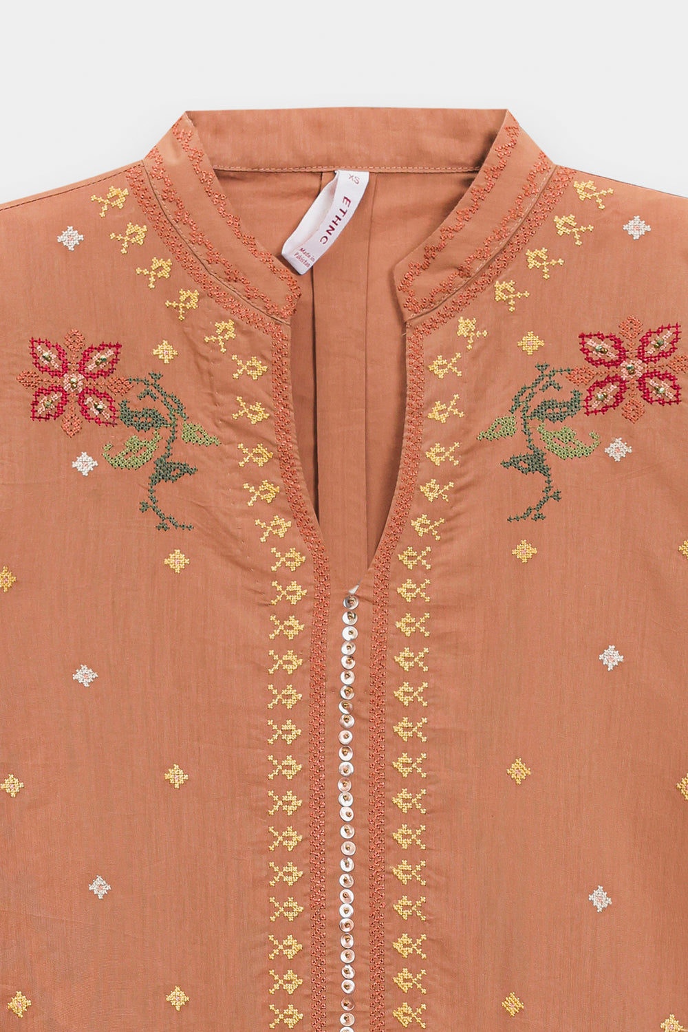 Embrace a look of understated warmth in this earth-toned brown top, featuring a contemporary straight silhouette. The design is characterized by a sophisticated split neckline that leads into a central vertical panel of delicate geometric embroidery. Ornate floral sprays in shades of deep red and forest green are artfully placed on the shoulders and across the front, while a rich, decorative border anchors the hem and mid-length sleeves.
