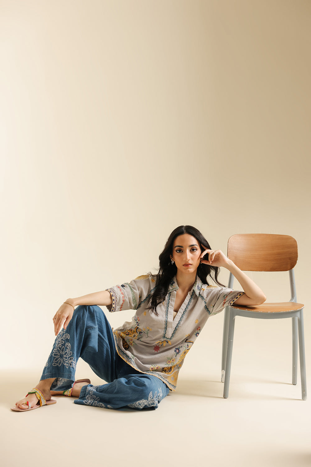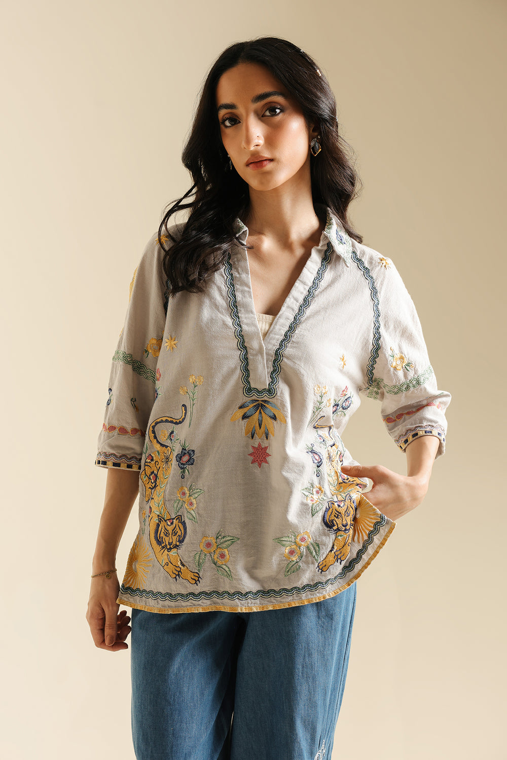 Make a statement in this exquisite embroidered top. The light grey shirt features intricate and colorful embroidery, with a striking design of two tigers on the front, surrounded by a delicate floral and sun motif. The detailed stitching extends to the collar and sleeves, creating a unique and artistic look. With its relaxed fit and vibrant pattern, this top is a standout piece that adds a touch of bohemian flair to any outfit.
