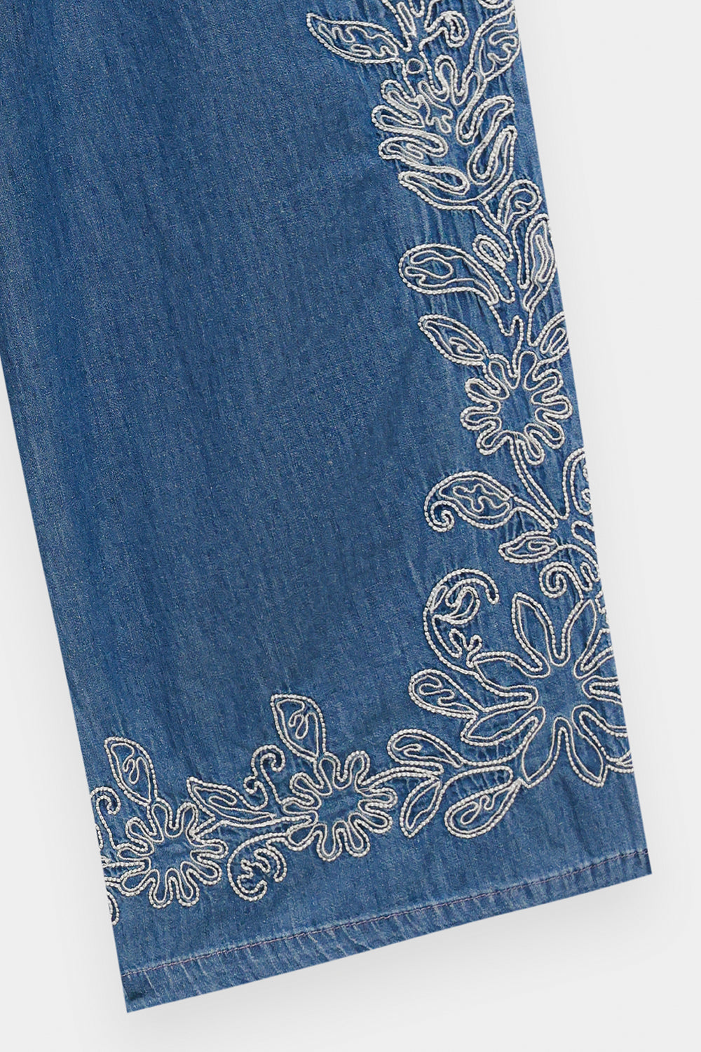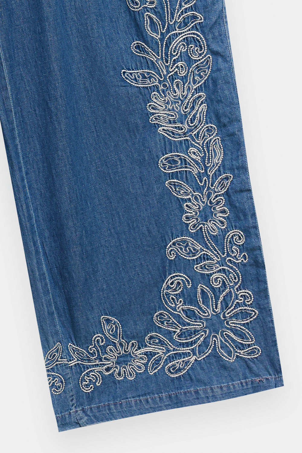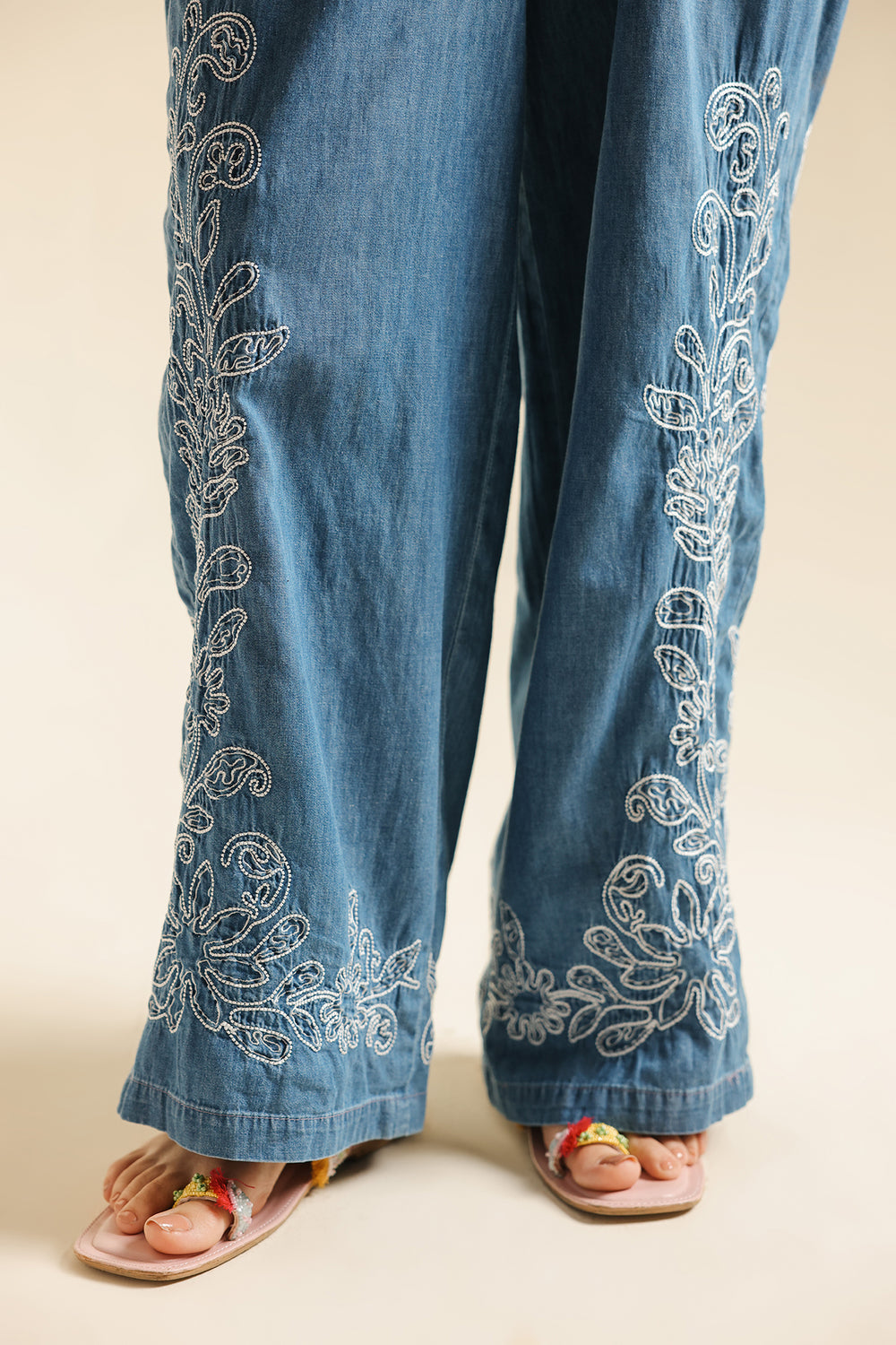 Accent your summer look with these beautiful, breezy embroidered trouser. This stylish wide-leg baggy trouser is crafted from a comfortable, light denim-blue fabric. It features stunning white thread embroidery in an intricate floral and scroll motif, concentrated dramatically around the hemline. Perfect for adding a folk-chic touch to kurtis or short shirts, this trouser create a bold, flowing silhouette.