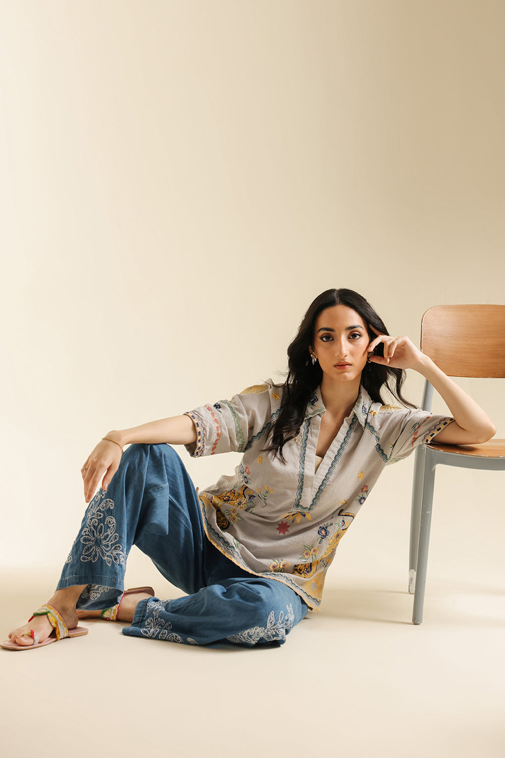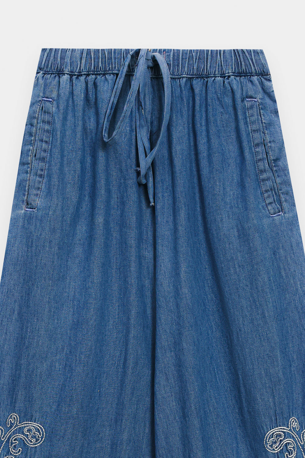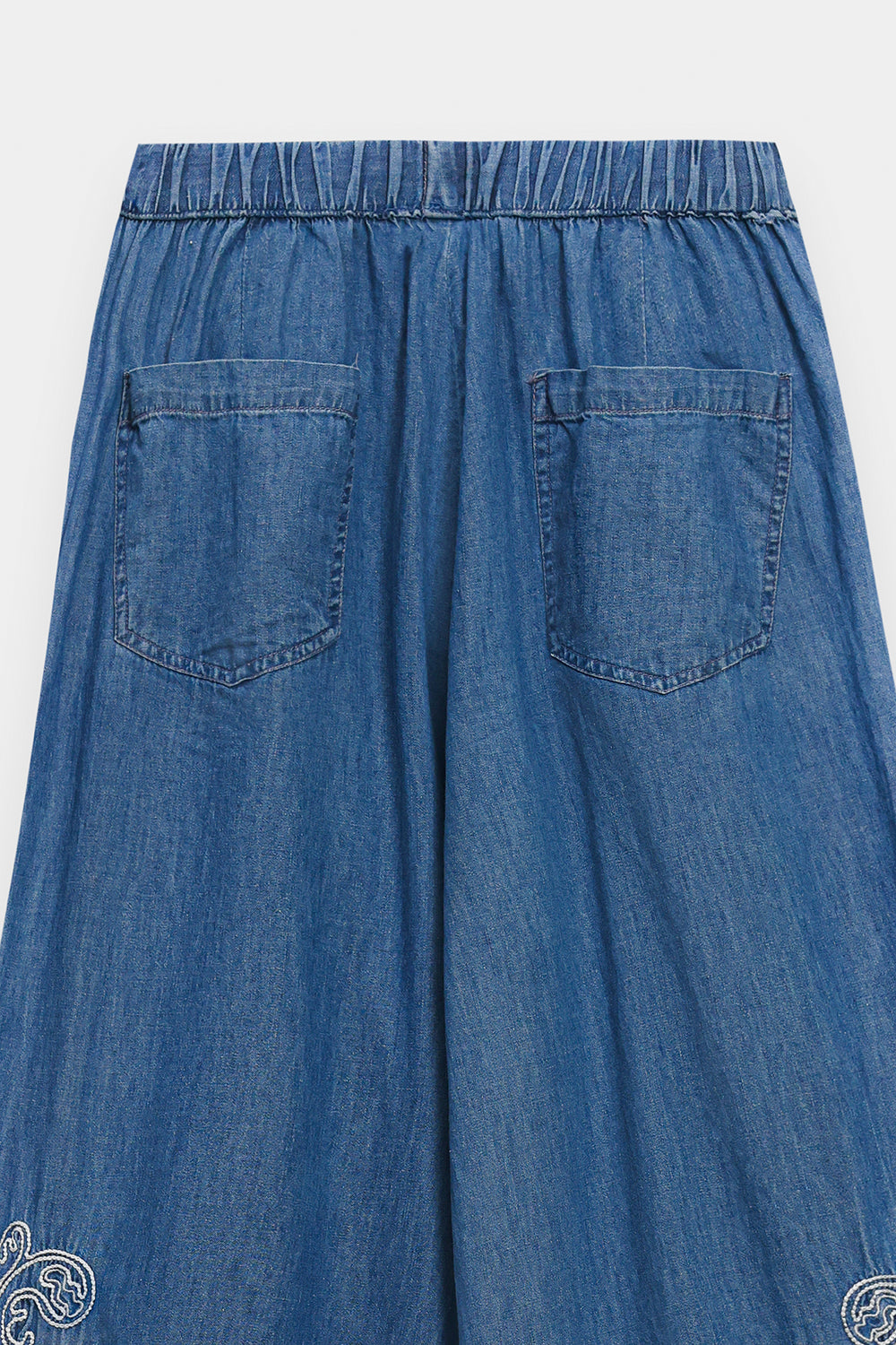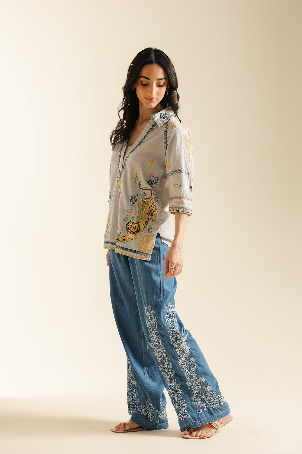 Accent your summer look with these beautiful, breezy embroidered trouser. This stylish wide-leg baggy trouser is crafted from a comfortable, light denim-blue fabric. It features stunning white thread embroidery in an intricate floral and scroll motif, concentrated dramatically around the hemline. Perfect for adding a folk-chic touch to kurtis or short shirts, this trouser create a bold, flowing silhouette.
