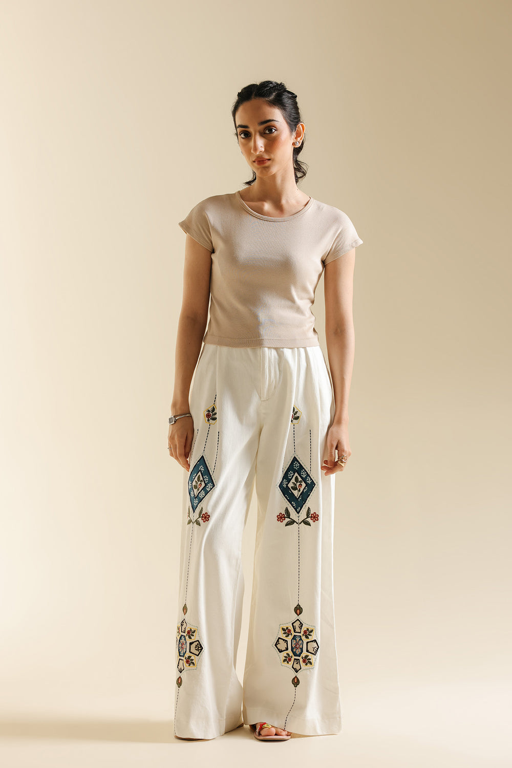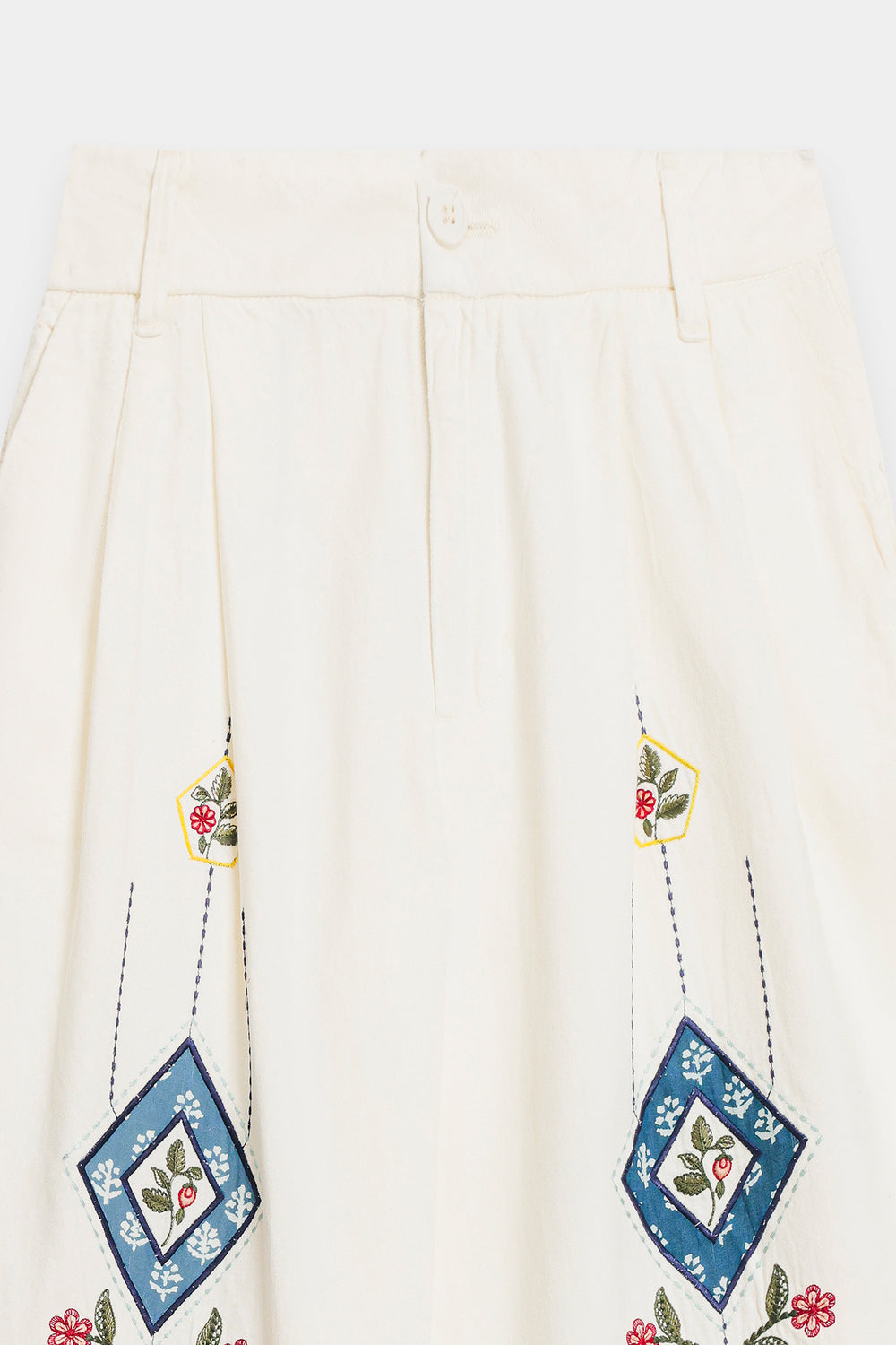 Capture attention with these unique white embroidered trousers. These wide-leg trousers are crafted from a crisp white fabric, offering a comfortable and flowing silhouette. The highlight is the striking, vertically placed multi-colored embroidery on both legs, featuring detailed diamond and floral motifs in shades of blue, red, and yellow. These decorative trousers are perfect for pairing with a simple, solid-colored top to create a stylish, statement-making outfit.