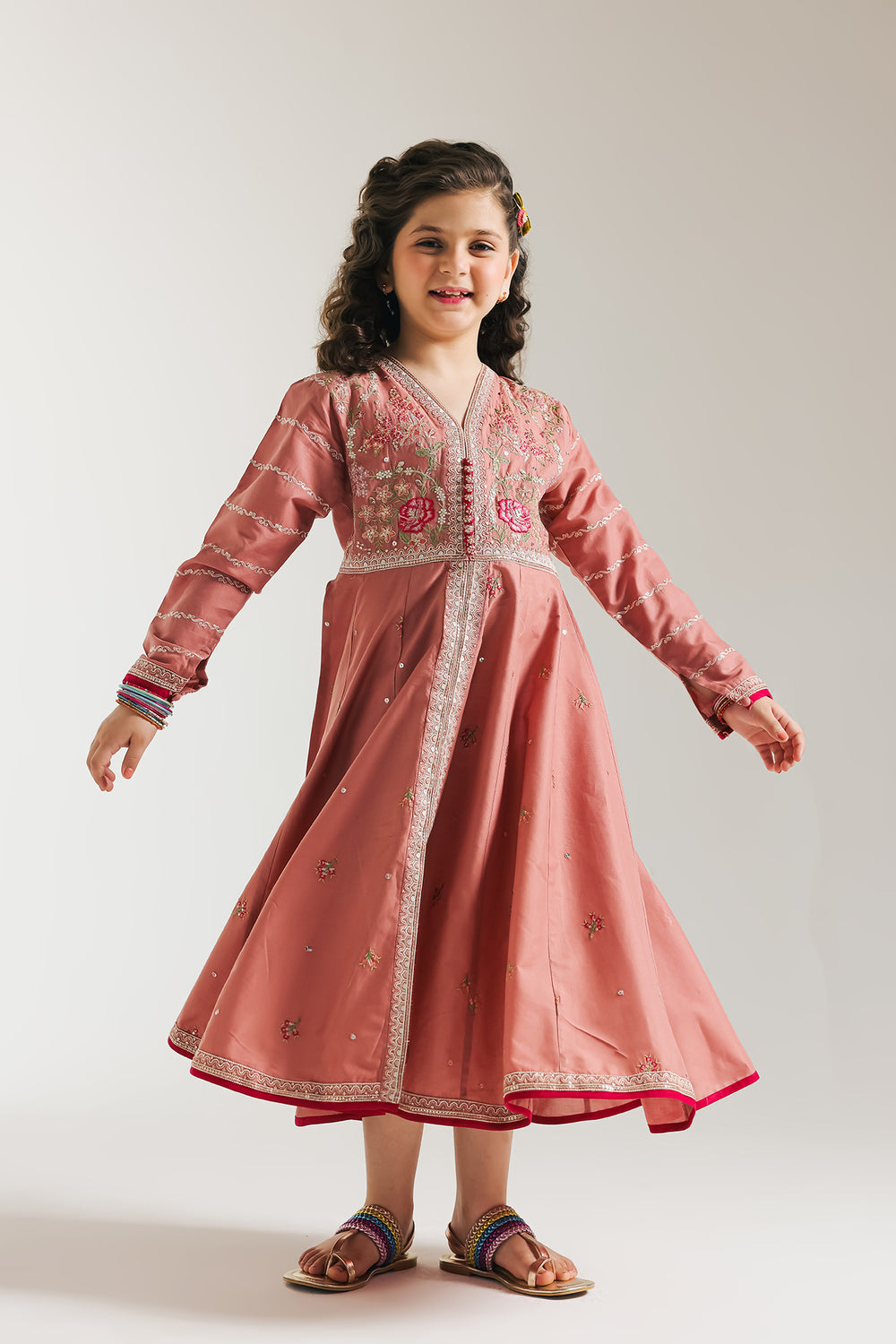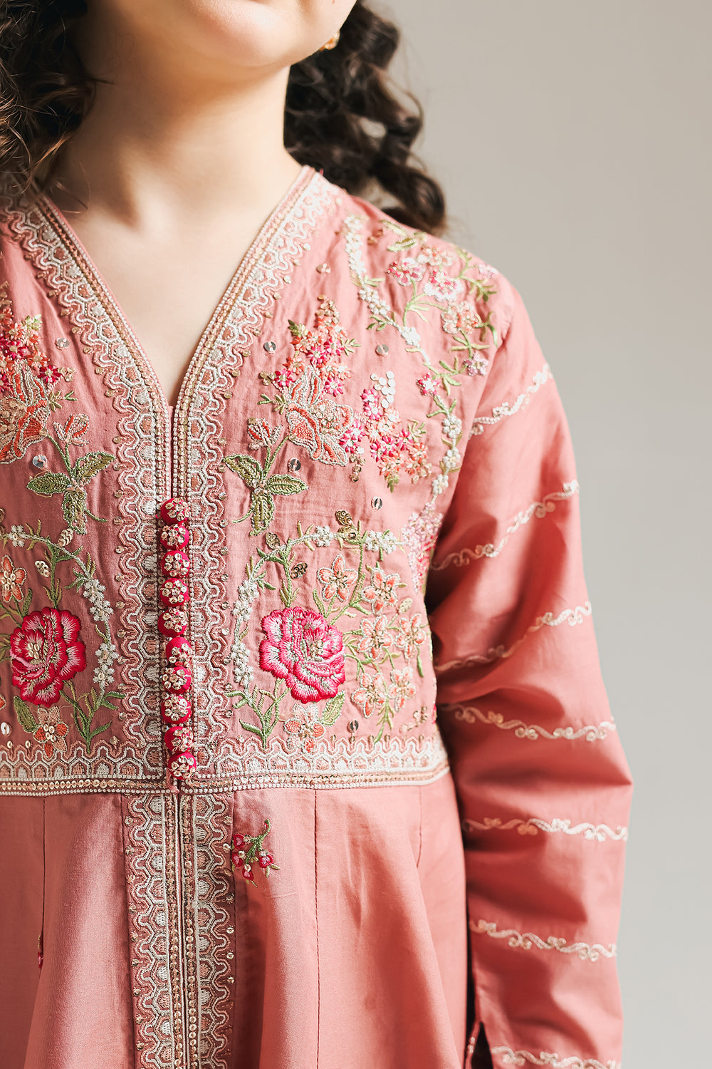 This stunning pishwas features a refined and sophisticated design, with layers and a classy silhouette. The garment seamlessly incorporates elegant floral embroidery with scintillating details and gathers below the yoke, making it a must-have for any girl looking to elevate her style this festive season.