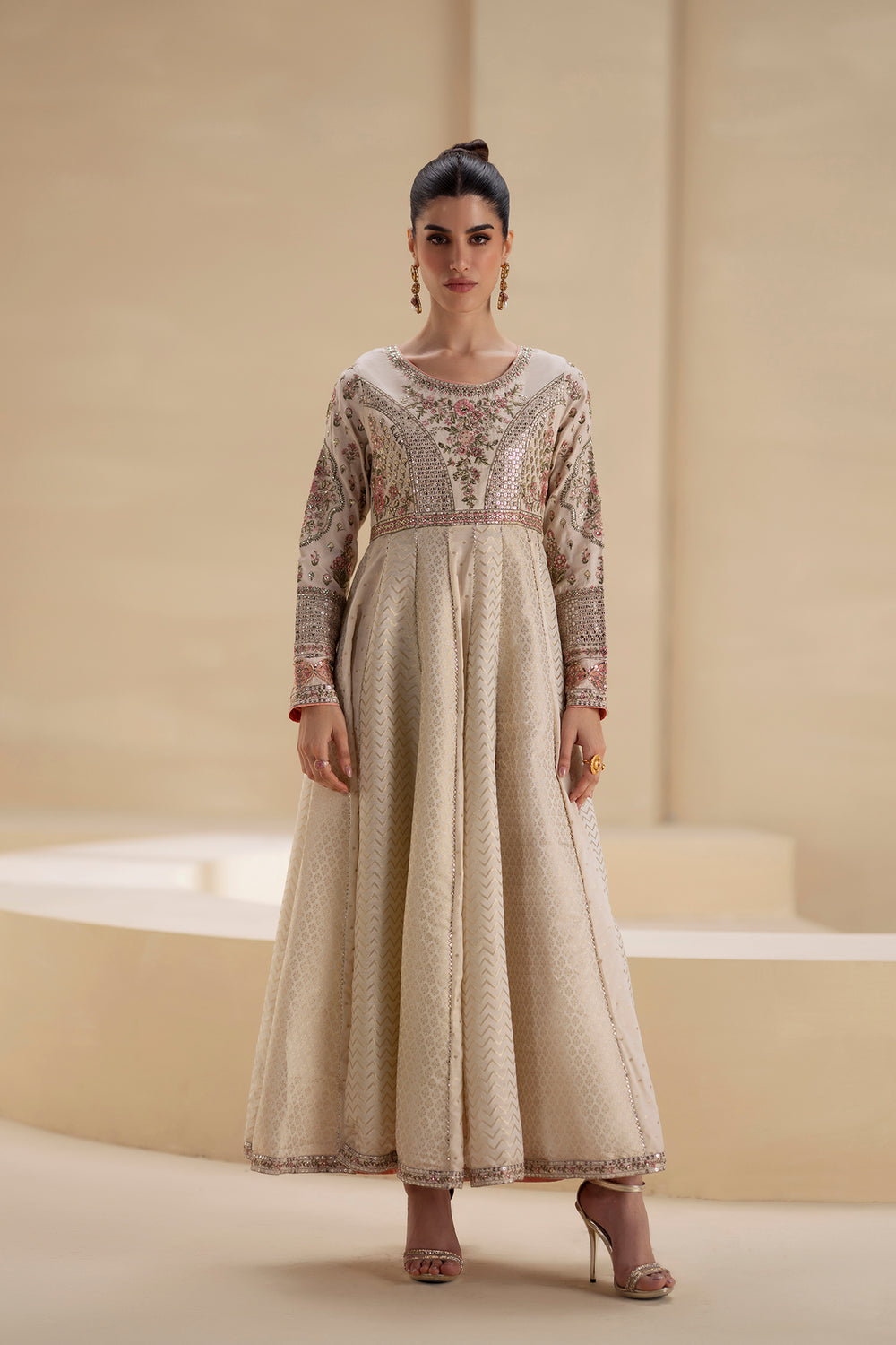 Command attention with this absolutely breathtaking ivory embroidered dress. This floor-length gown features a voluminous, floor-sweeping silhouette, crafted from raw silk fabric with a subtle overall gold-toned pattern that catches the light. The fitted bodice and sleeves are lavishly embellished with dense pink, silver, and gold thread embroidery, featuring delicate floral motifs and traditional patterns that exude majestic grandeur. Perfect for a formal evening or wedding reception, this dress is a true masterpiece of textile artistry.