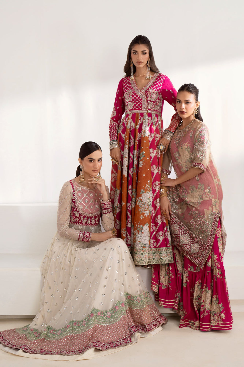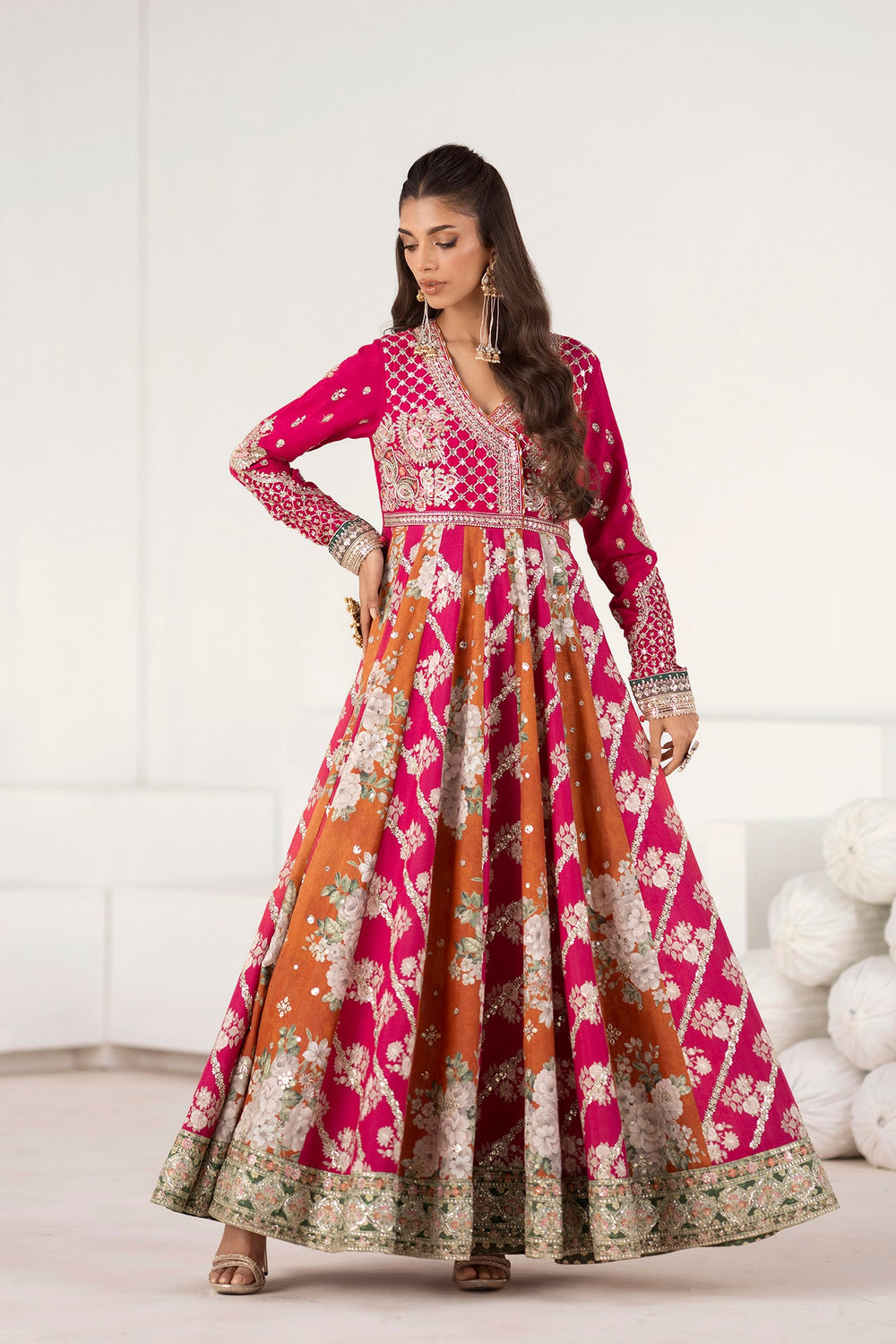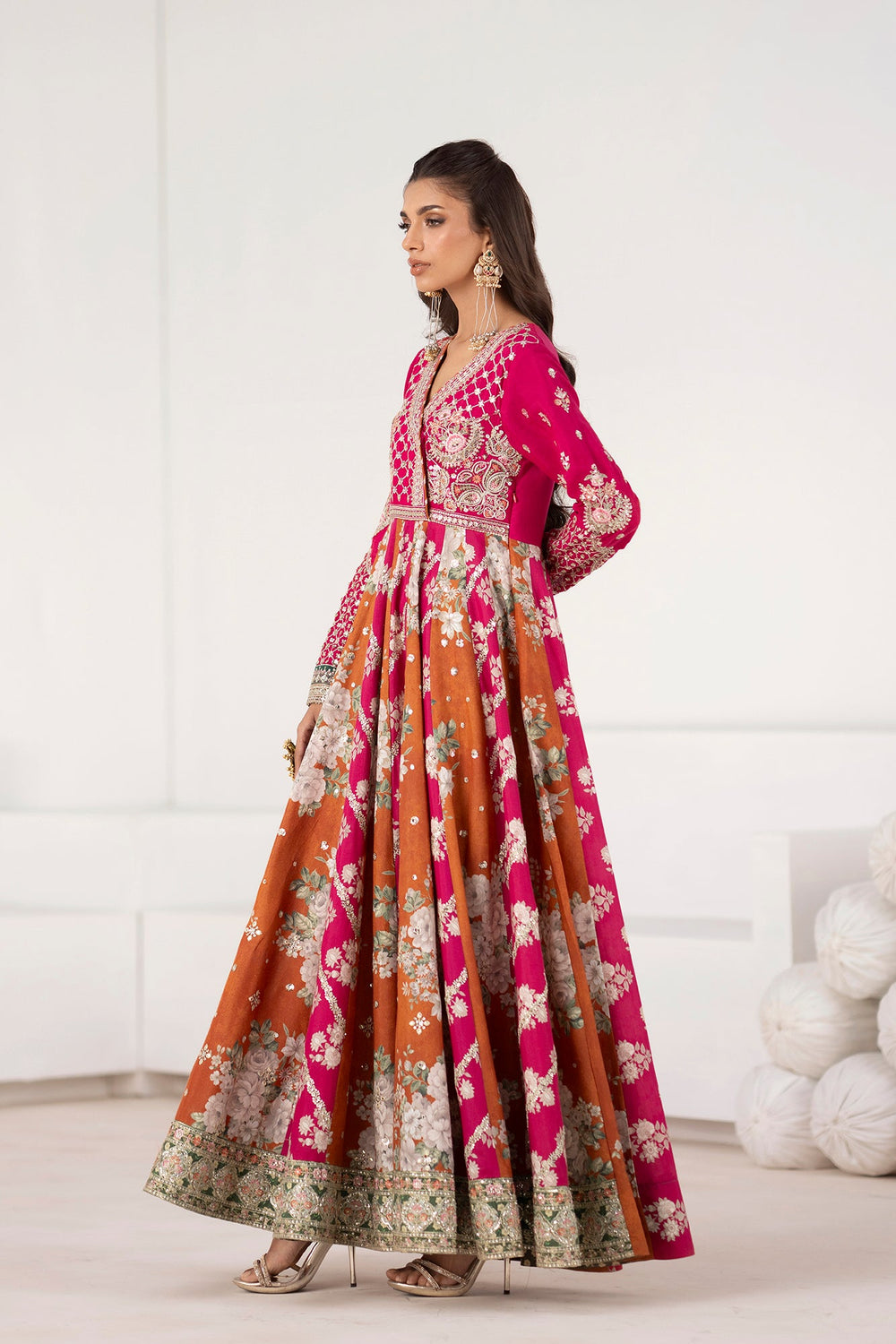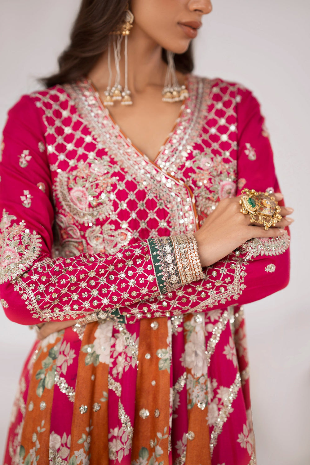 Command attention in this breathtaking embroidered angrakha pishwas, a masterpiece of vibrant color and traditional elegance. The bodice, in a rich fuchsia, is a canvas for elaborate embroidery in shades of pink, gold, and green, creating a stunning and festive look. The beautiful, long sleeves are also richly adorned with intricate patterns. The flowing skirt features a striking two-toned design, with alternating panels of warm rust and bright fuchsia, each embellished with beautiful floral prints and an intricate embroidered border. This piece is the perfect choice for a grand celebration, offering a magnificent and timeless silhouette.