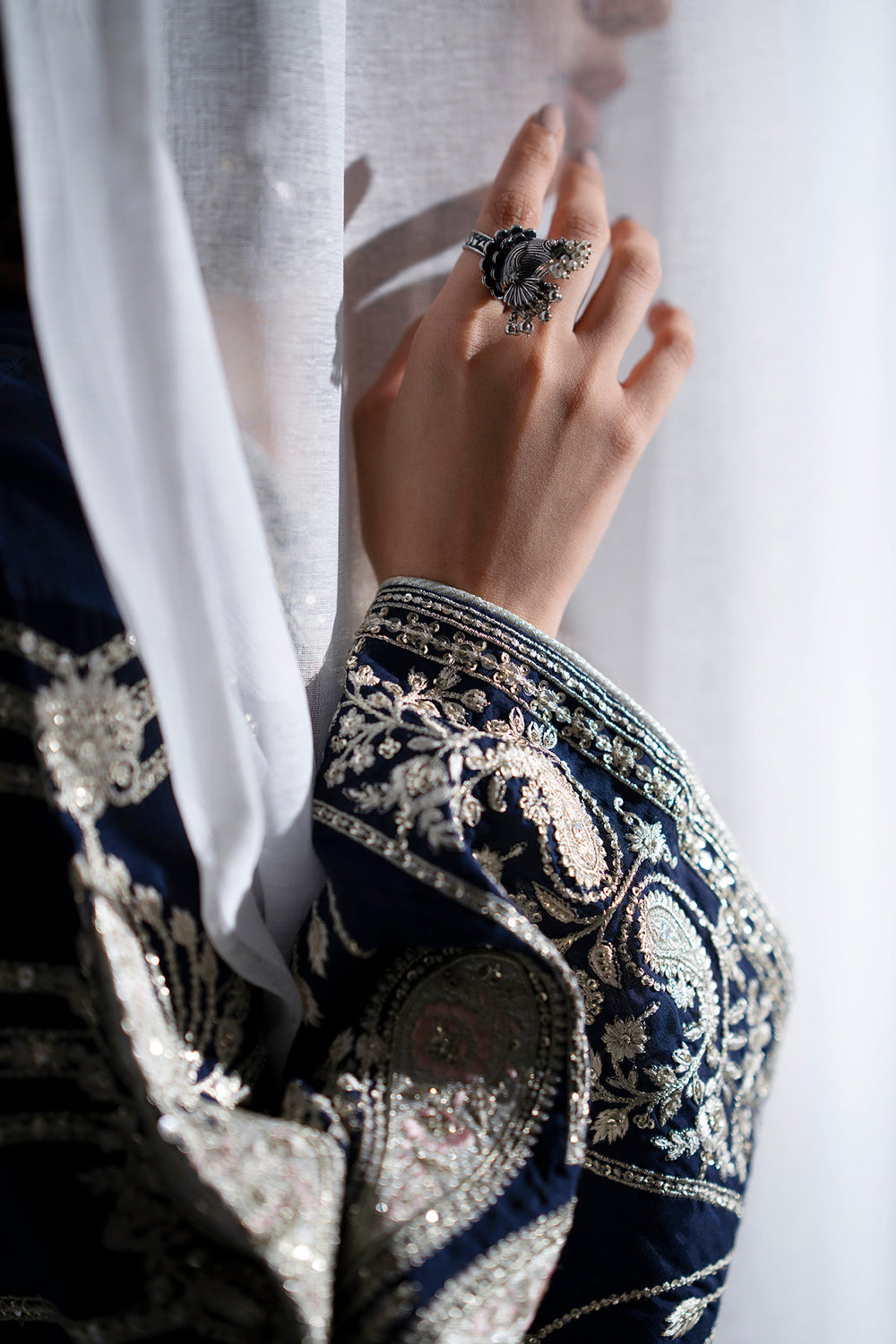 This exquisite kaftan-inspired shirt exudes modern elegance with its elongated silhouette and rich navy blue hue. The design is lavishly adorned with heavy thread and sequin embroidery, creating a striking display of artistry across the neckline, sleeves, and hem. Intricate floral and paisley motifs add depth and dimension, while shimmering embellishments bring a radiant, festive glow. A perfect choice for making a refined and memorable statement at any special occasion this season.