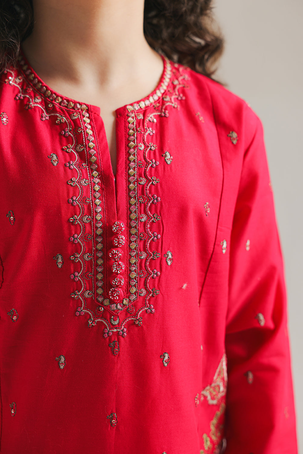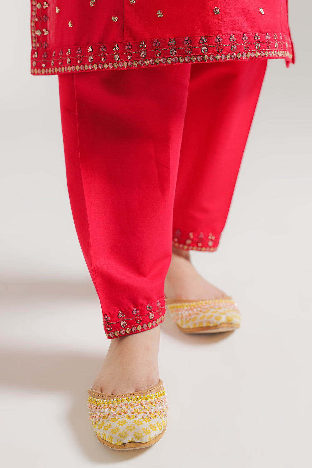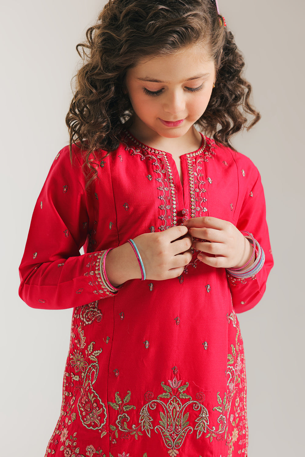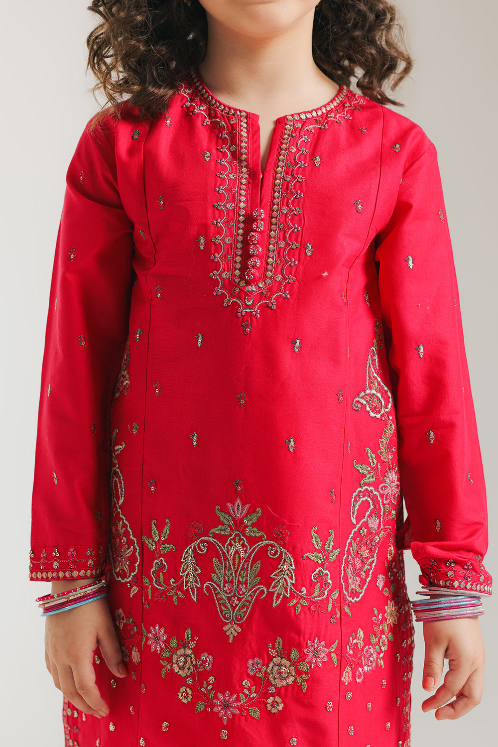 Introducing this graceful outfit, a perfect blend of traditional and modern styles. Featuring exquisite floral embroidery and sparkling embellishments, this outfit is sure to turn heads. The set includes a stylish shirt and embroidered shalwar, making it a must-have for any special occasion. Elevate your girls' wardrobe with this stunning piece.