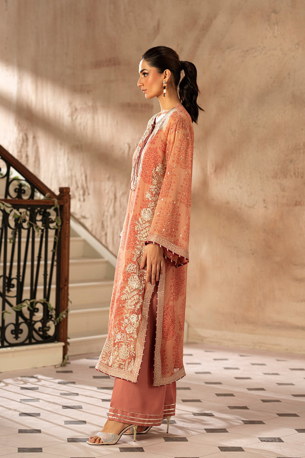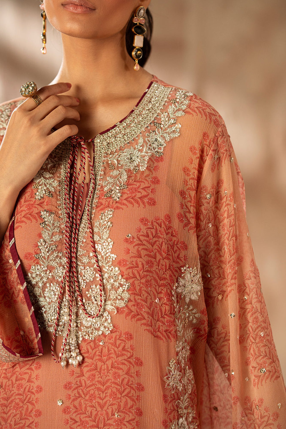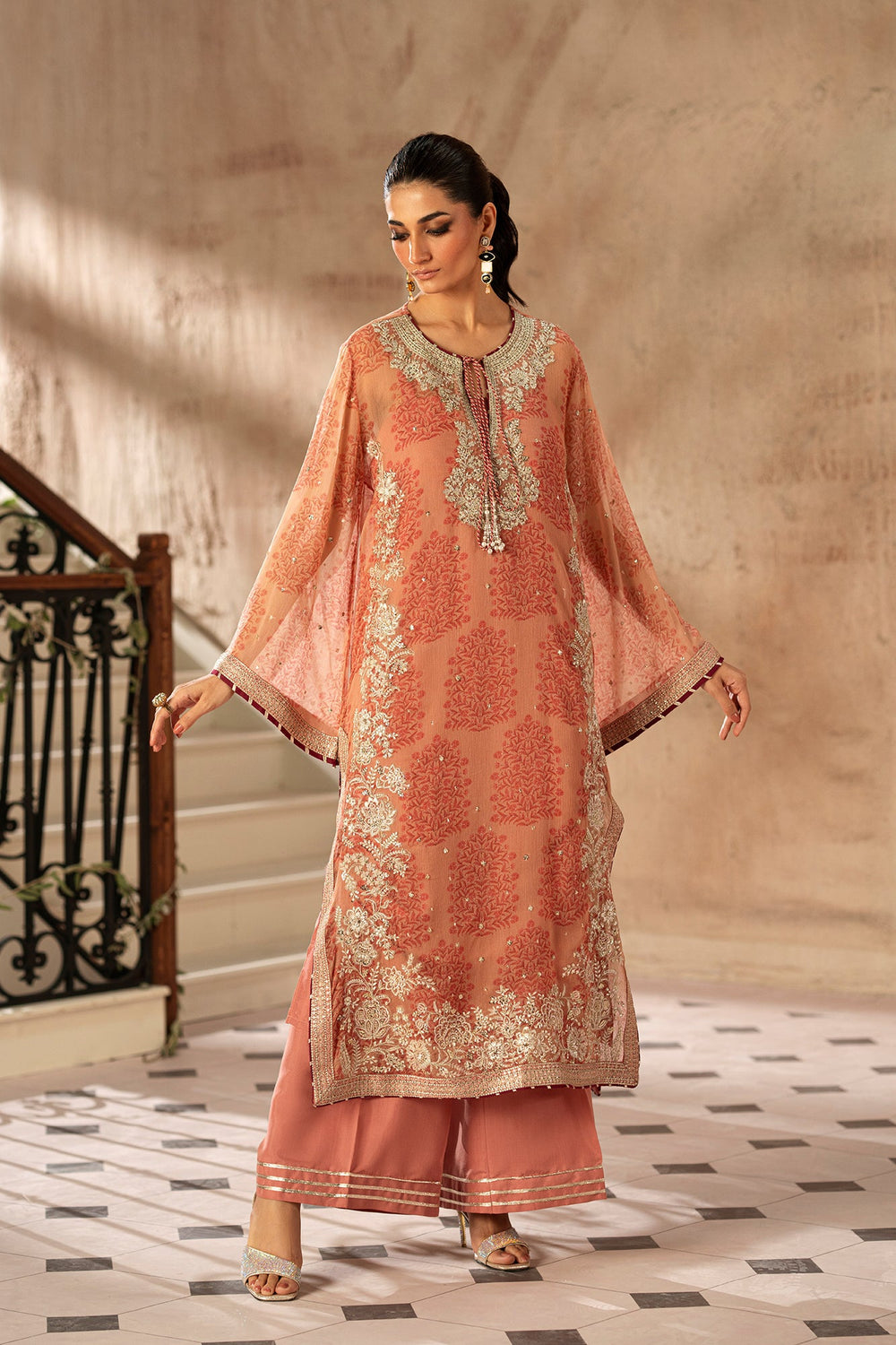 Elevate your style with classy yet graceful outfit. The salmon pink chiffon shirt, adorned with enchanting floral embroidery in scintillating colors layered on a beautifully printed canvas. Completed with an inner slip and a contemporary culotte trouser adorned with gotta lace at bottom, this chic outfit exudes grace and elegance, perfect for the festive season.