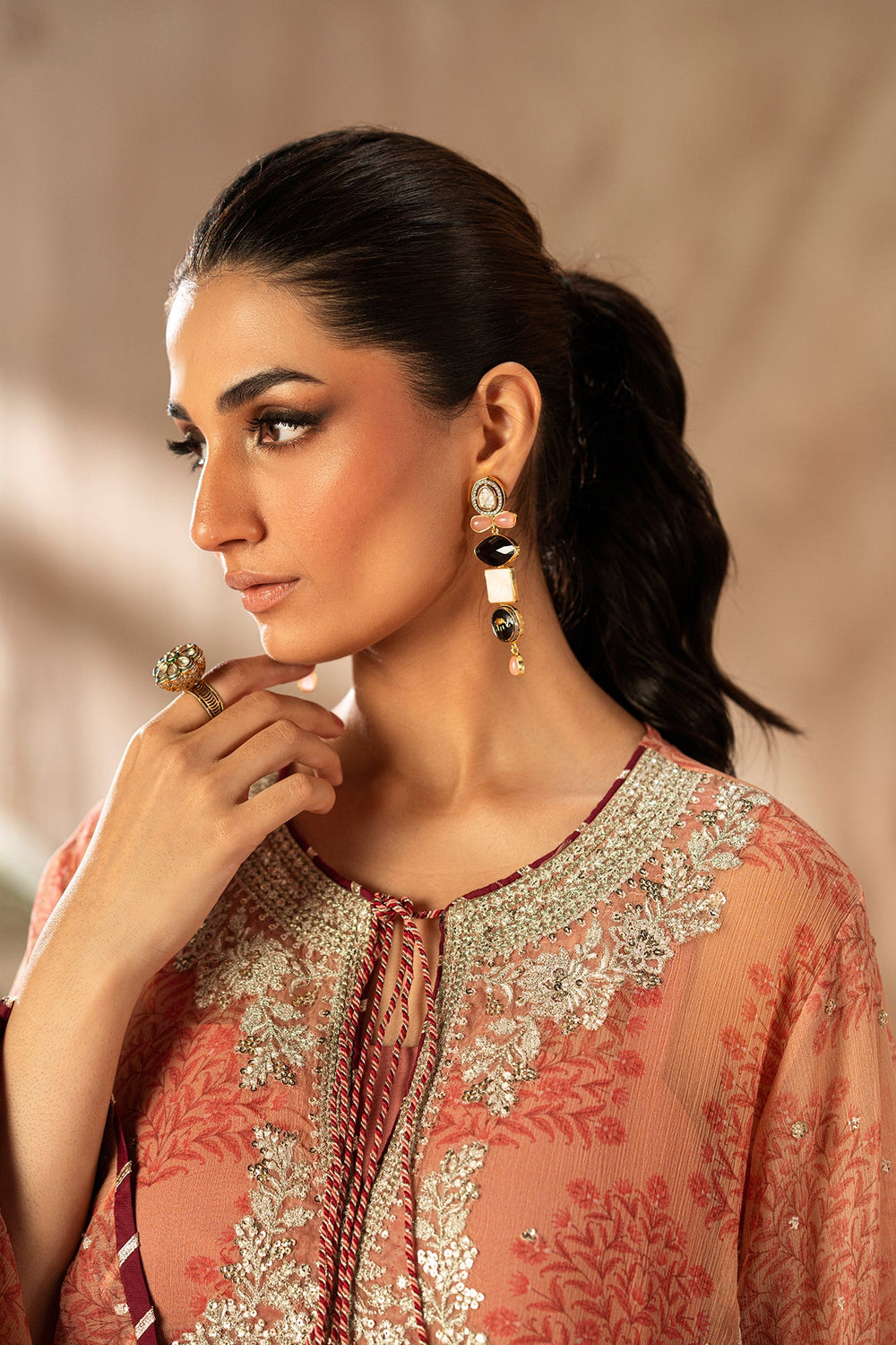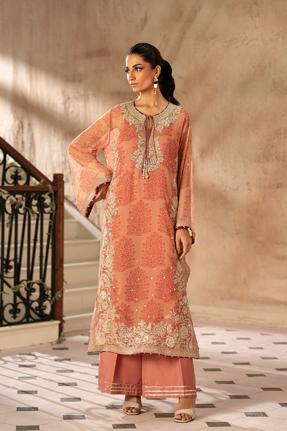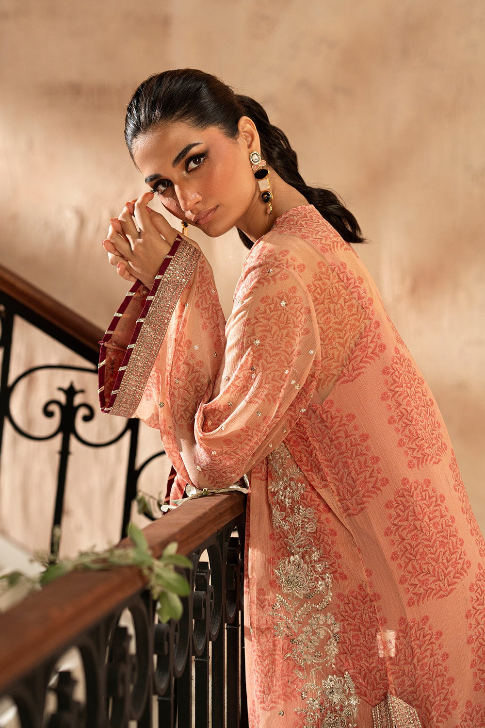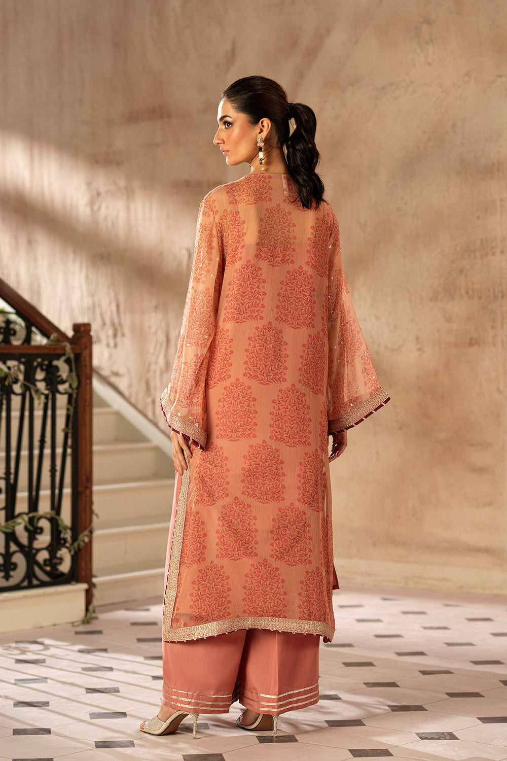 Elevate your style with classy yet graceful outfit. The salmon pink chiffon shirt, adorned with enchanting floral embroidery in scintillating colors layered on a beautifully printed canvas. Completed with an inner slip and a contemporary culotte trouser adorned with gotta lace at bottom, this chic outfit exudes grace and elegance, perfect for the festive season.