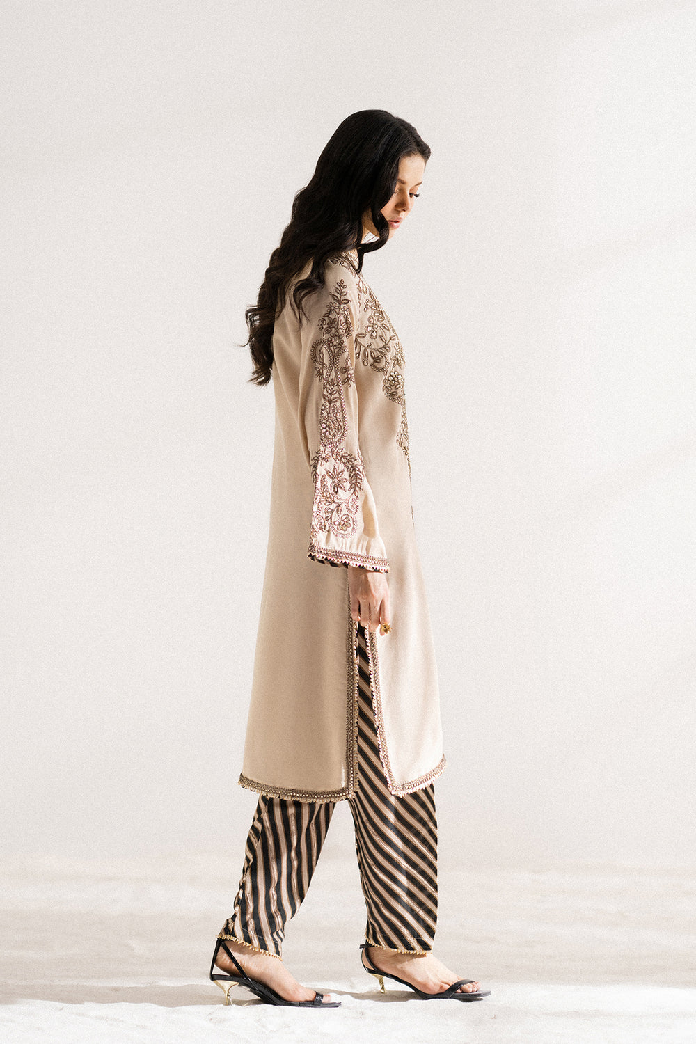 Command attention with this exquisitely crafted two-piece ensemble, blending traditional artistry with striking modern design. The sophisticated beige kurta is richly adorned with intricate, tone-on-tone embroidery featuring elaborate floral and medallion motifs that cascade across the front and sleeves. Paired with chic striped shalwar showcasing a bold, contrasting dark brown and beige pattern, this outfit creates a distinctive and stylish silhouette. Perfect for making an unforgettable statement at festive occasions, formal gatherings, or sophisticated events.