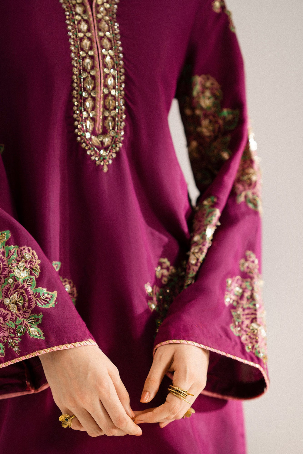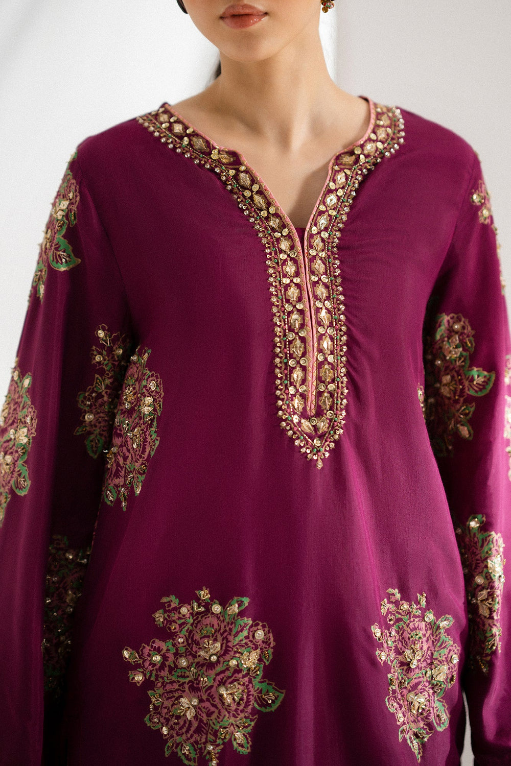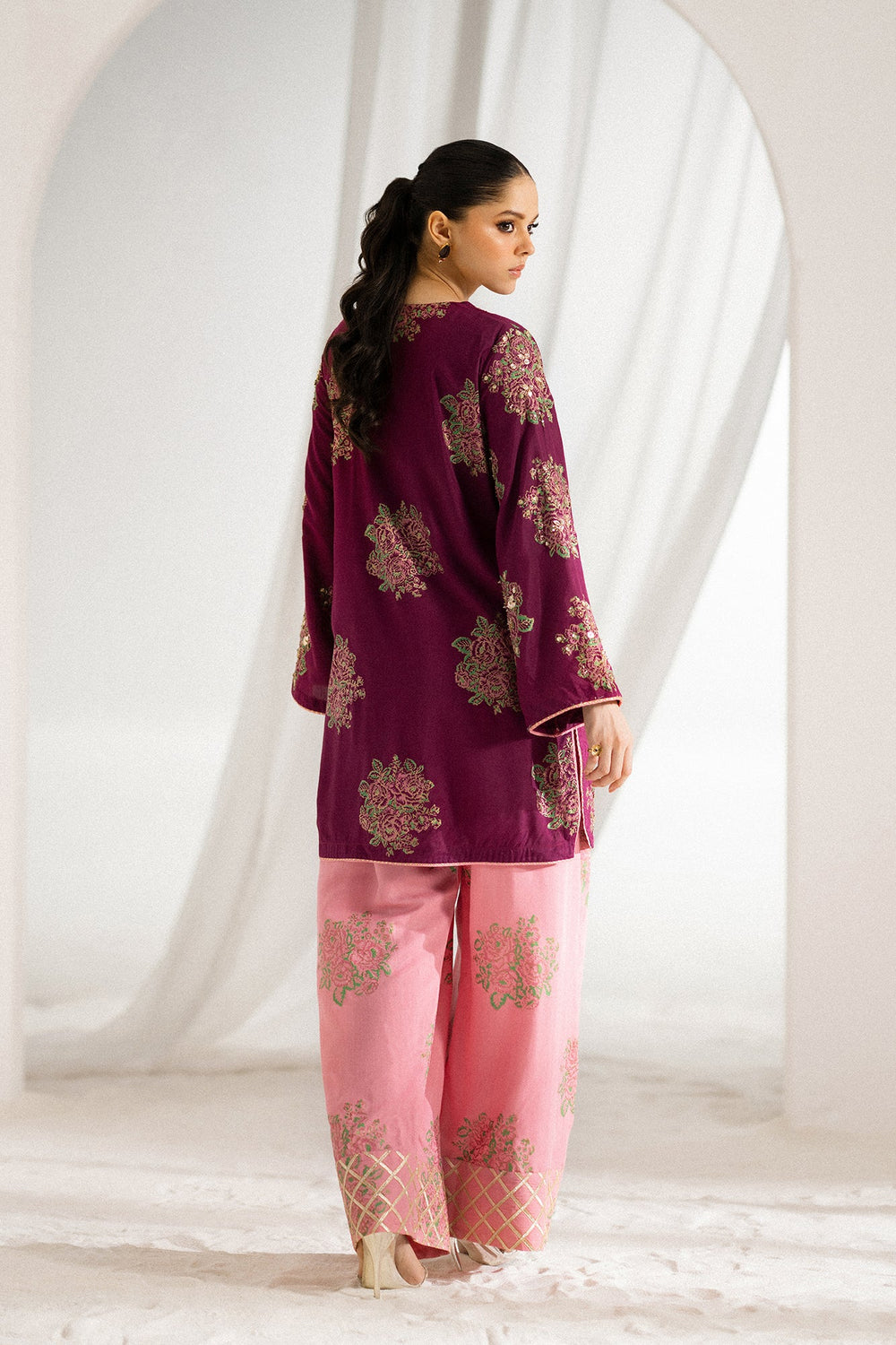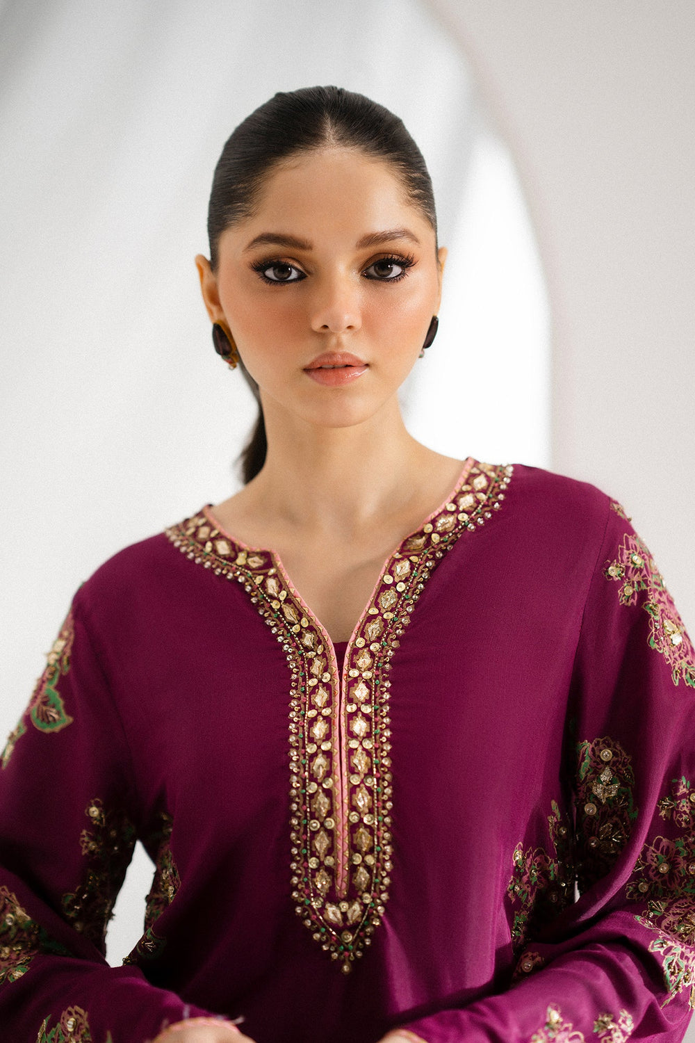 Command attention with this stunning two-piece ensemble, a masterful blend of rich color and intricate artistry. The opulent magenta kurta is lavishly adorned with exquisite floral embroidery in shades of green and gold, cascading beautifully across the neckline, sleeves, and body. Paired with elegant wide-leg shalwar featuring complementary floral patterns and delicate golden accents, this outfit creates a truly majestic silhouette. Perfect for grand celebrations, festive occasions, or making an unforgettable statement.