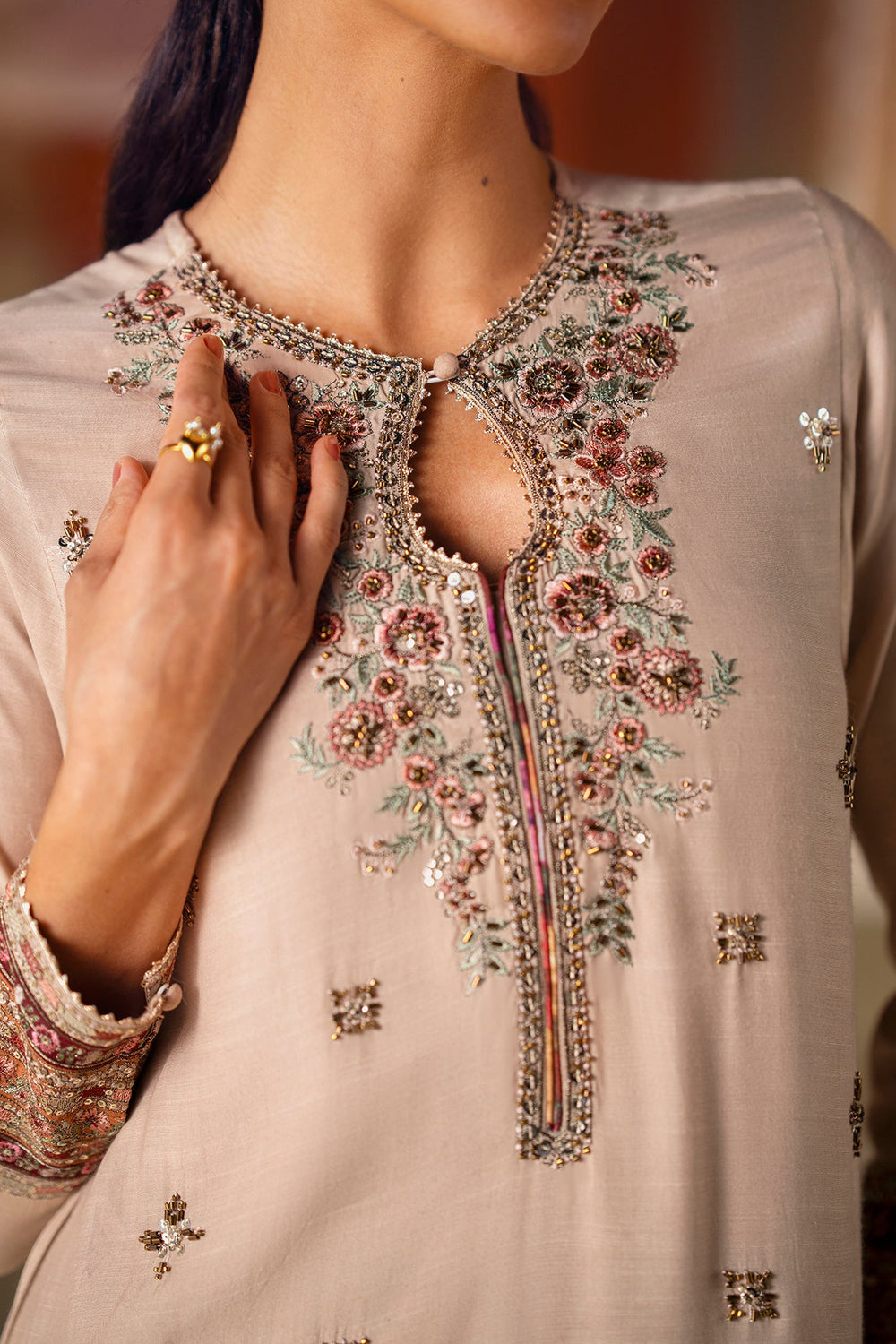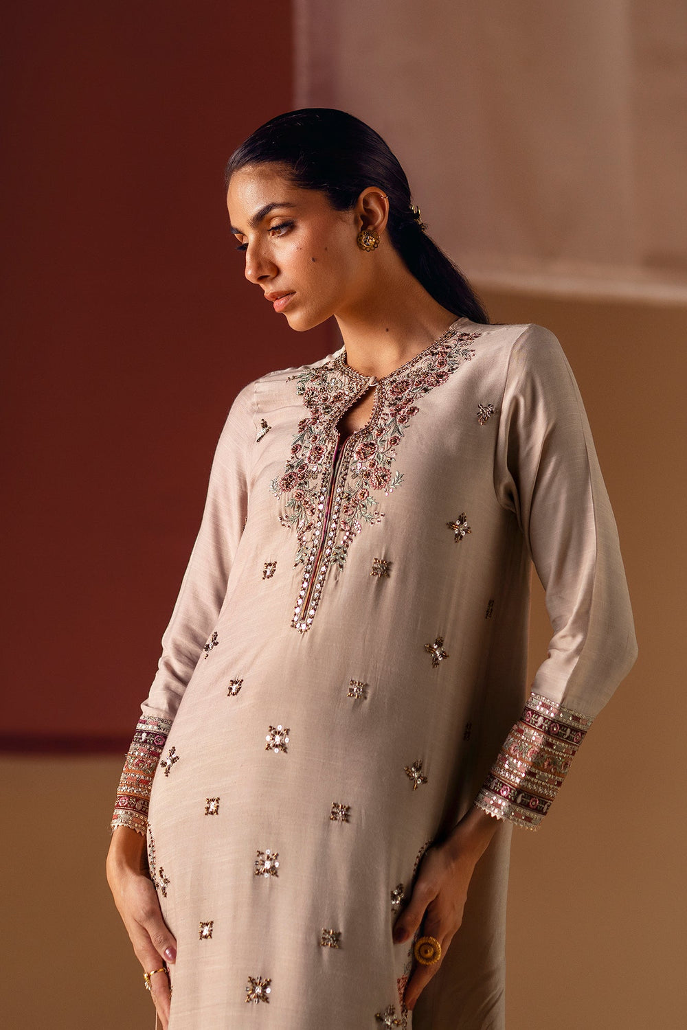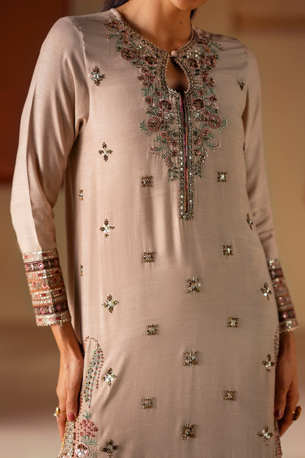 Experience the captivating fusion of rustic elegance and artistic detail. This stunning embroidered suit features a light, beige shirt adorned with intricate floral embroidery and shimmering sequin details on the front. The look is completed with wide-leg trousers that showcase a bold, colorful print in deep maroon and terracotta hues. This ensemble is a perfect blend of modern sophistication and timeless artistry, making it a truly unique statement piece.