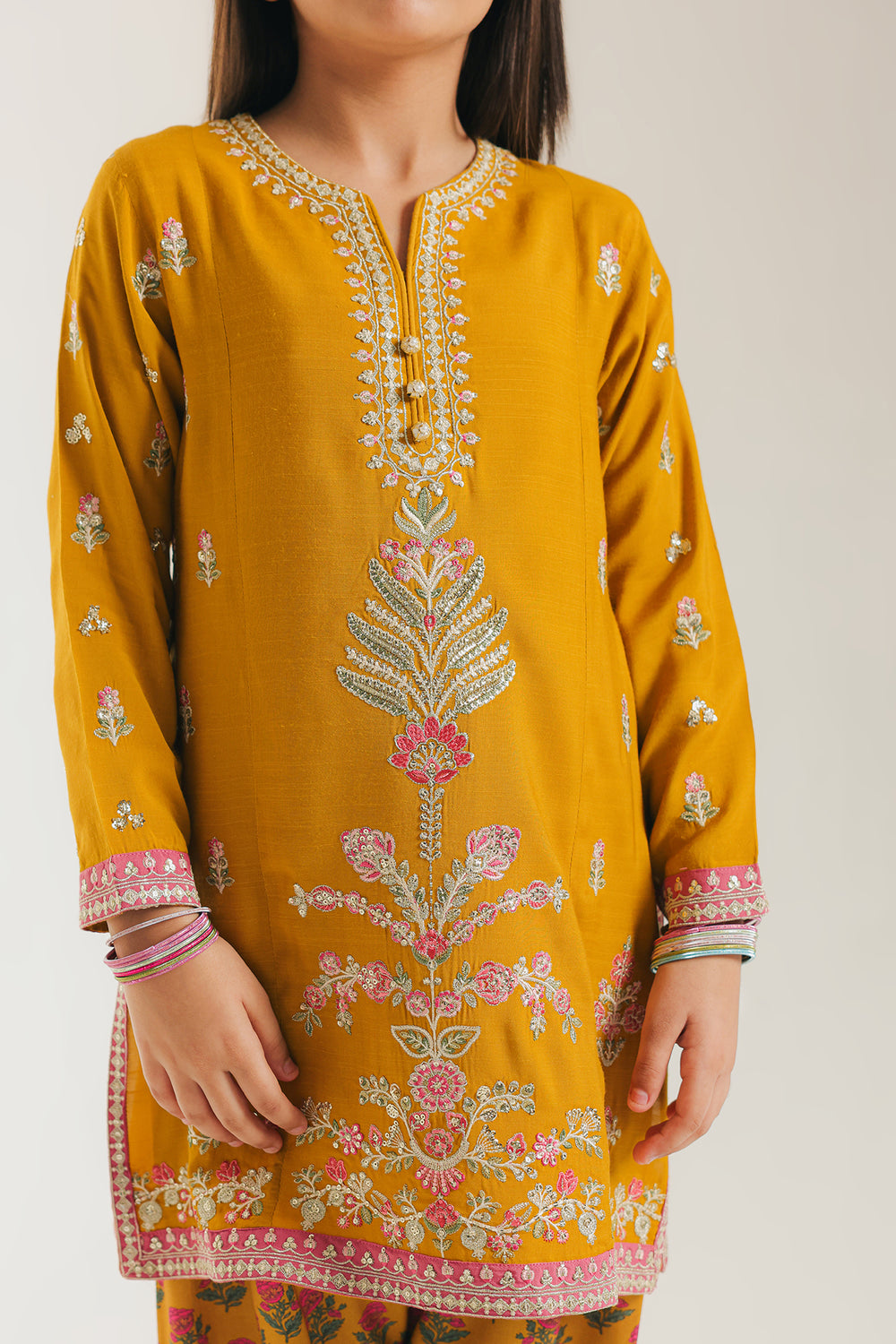 Celebrate bright style in this festive mustard-yellow embroidered suit. The short, straight-cut kurta is crafted from a rich, gold-toned mustard fabric. It is beautifully embellished with detailed thread embroidery in white, pink, and green, forming elegant floral vines across the yoke and hem. The V-slit neckline features delicate button accents. The ensemble is completed by coordinating shalwar. The shalwar feature a striking all-over floral print in shades of gold and pink, creating a charming and playfully coordinated look.