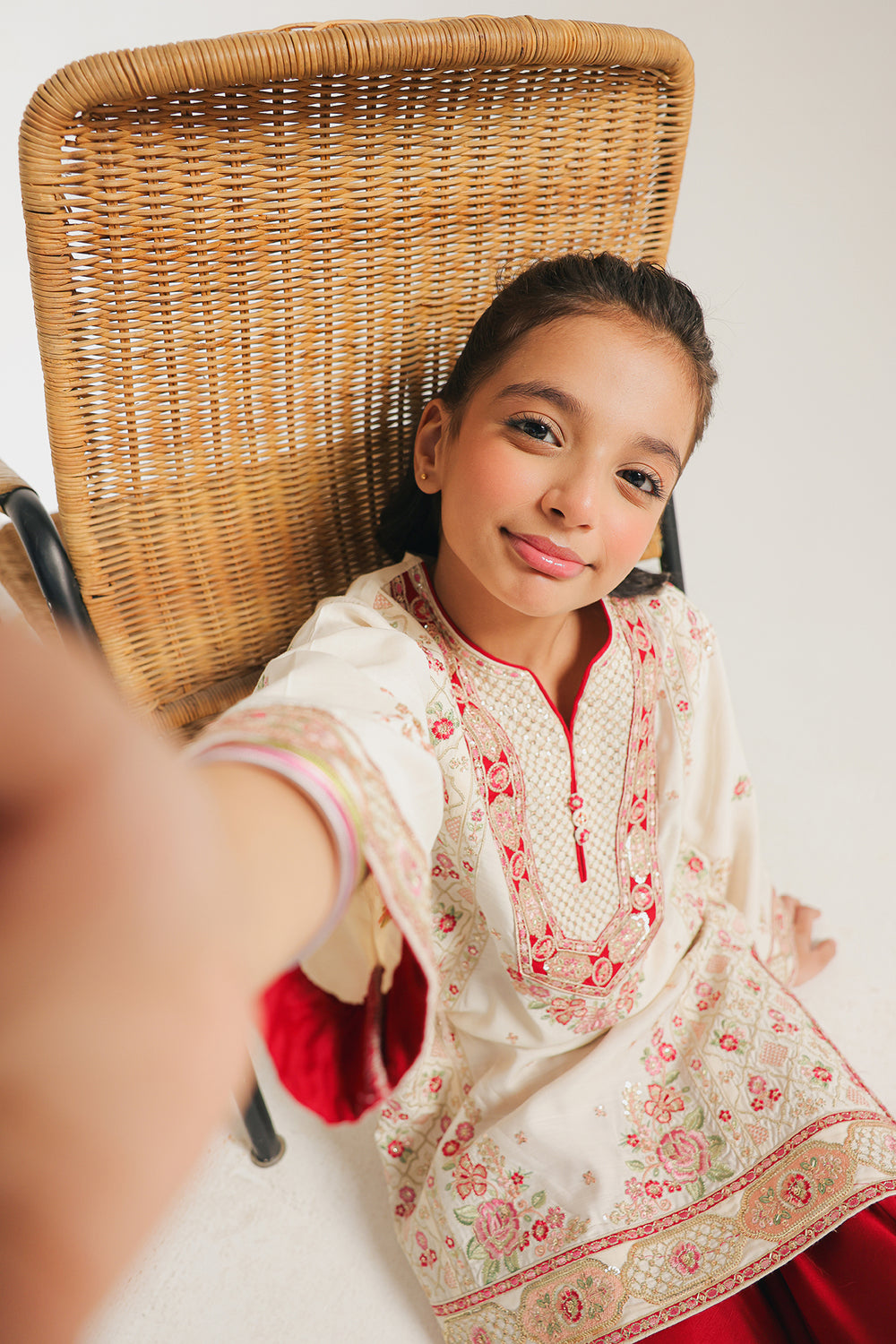 Ignite her style with this striking embroidered suit. The off-white kurta is a canvas of intricate beauty, adorned with delicate floral and vine embroidery in vibrant red and soft green hues that cascade elegantly down the front and sleeves. It is perfectly complemented by a bold red shalwar, creating a beautiful contrast that is both traditional and captivating. This suit is a stunning choice for any festive occasion.