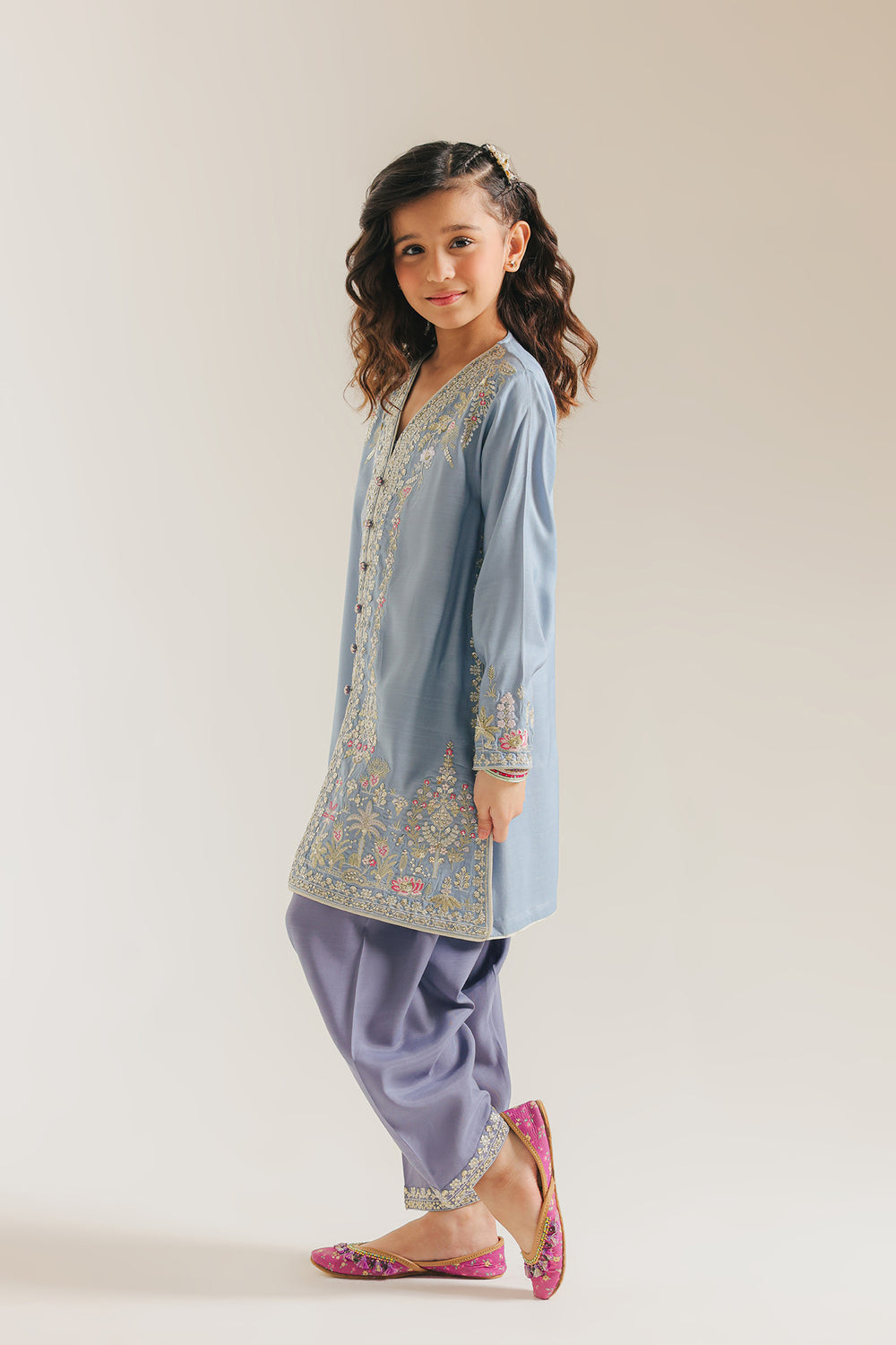 Dress your child in timeless elegance with this expertly crafted embroidered suit. The classy soft blue shirt showcases meticulous needlework featuring ornate floral motifs in scintillating colors, while a refined V neckline adds sophisticated detail. Paired with a tailored straight-fit shalwar in contrasted deep blue shade enriched with embroidered border at the hem, this ensemble delivers a harmonious balance of vibrant color and traditional craftsmanship. Ideal for festive occasions, it combines contemporary style with classic design for a memorable celebration look.