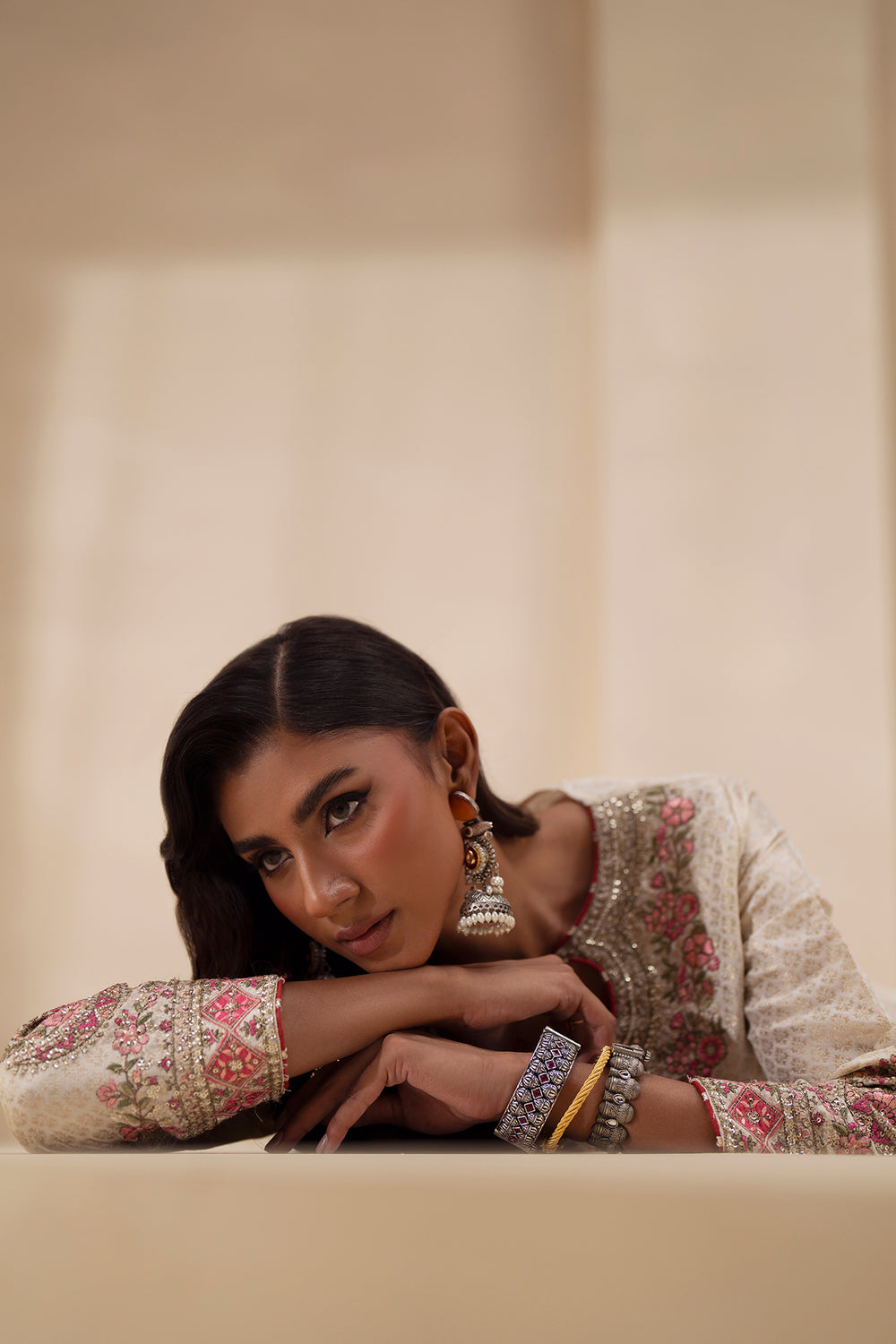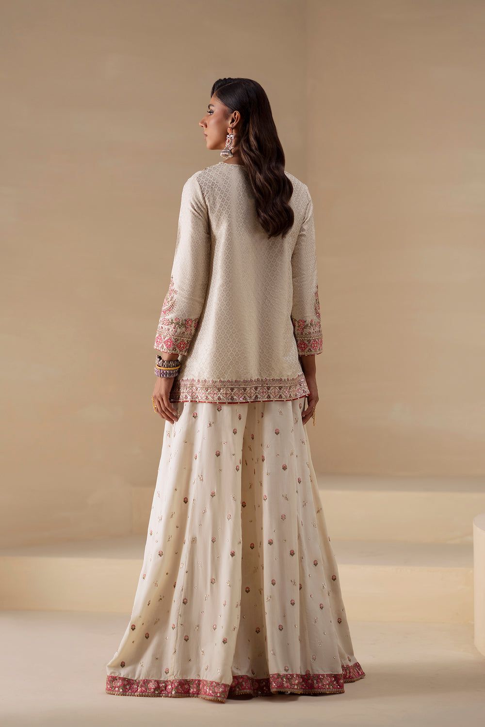 Channel breathtaking, festive romance with this exquisite embroidered suit, featuring a short shirt and a wide flapper. The short-length shirt is crafted from an off-white textured fabric and is heavily embellished with elaborate pink and gold-toned thread embroidery. The embroidery forms a rich tapestry of floral and geometric motifs across the yoke and borders, with elegant detailing on the long sleeves. The dramatic flapper (wide-leg trousers) perfectly complements the shirt, featuring the same off-white base with scattered embroidery throughout. The flapper culminates in a magnificent, dense border of pink and gold embroidery, creating a voluminous and show-stopping silhouette that is ideal for wedding events and grand celebrations.