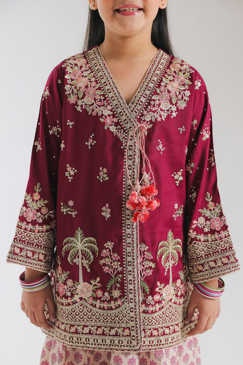 This beautifully crafted kids’ ensemble makes a striking festive statement with its rich magenta shirt paired with a soft blush-pink lehenga. The shirt is adorned with ornate gold embroidery concentrated around the neckline and front, enhanced with delicate tassel detailing that adds a playful yet elegant touch. Coordinated embroidered borders on the sleeves elevate the traditional aesthetic. The voluminous lehenga features an all-over geometric pattern and a finely finished hem, creating graceful movement with every step. Perfect for weddings, celebrations, and special occasions, this outfit blends vibrant color, intricate craftsmanship, and comfort to create a truly memorable festive look.