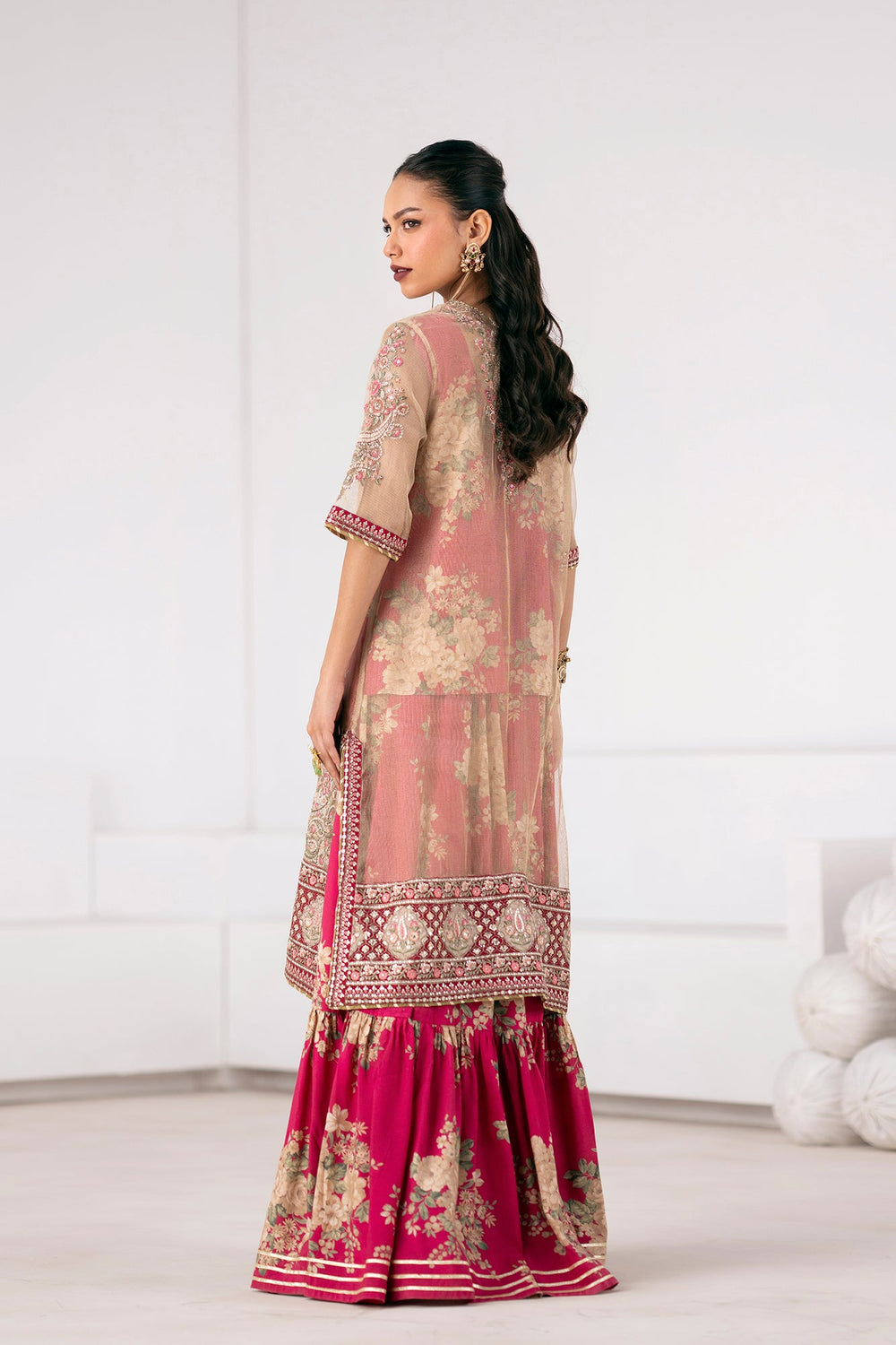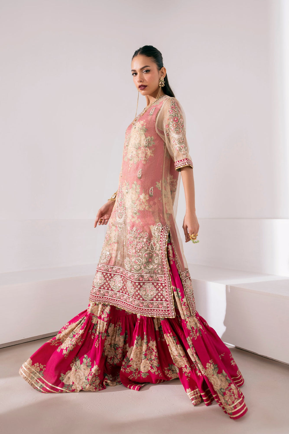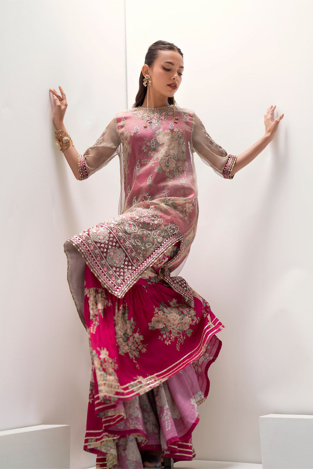 Grace yourself in this stunning embroidered suit, a masterpiece of luxurious design. The ensemble features a short, sheer organza shirt with intricate floral embroidery in a rich gold and silver. It is layered over a beautiful fuschia slip that adds a pop of vibrant color. The shirt's hemline is adorned with a heavily embroidered border, adding to its regal look. The suit is completed with a tiered gharara, where the lower layers feature a beautiful floral pattern in shades of pink and green, creating a harmonious and festive look. This piece is perfect for making a sophisticated and memorable statement at any grand occasion