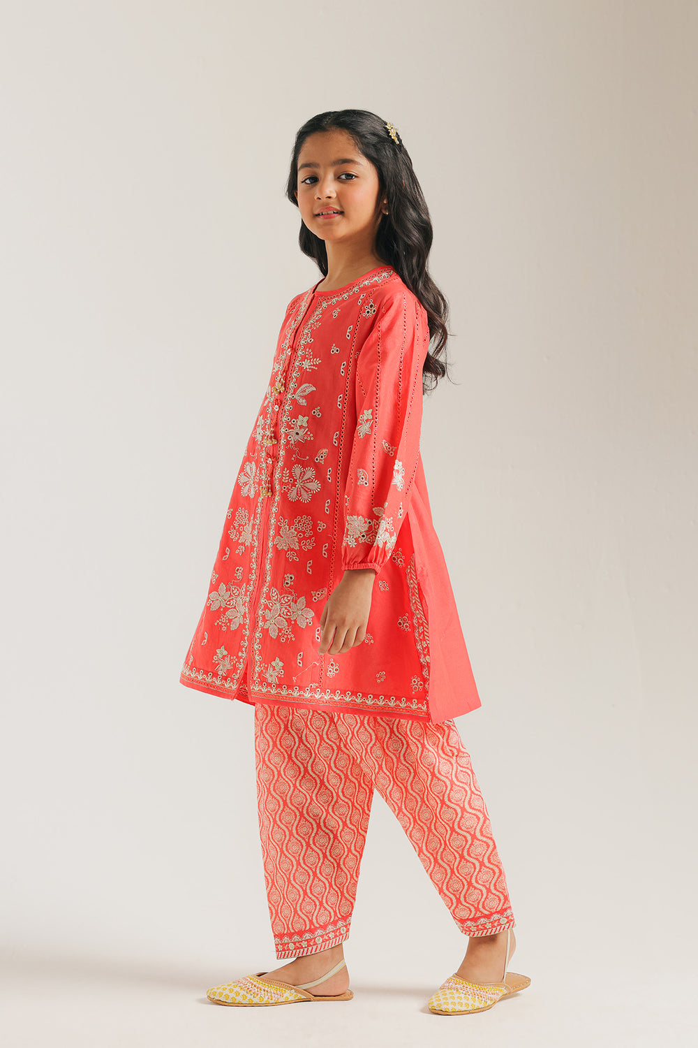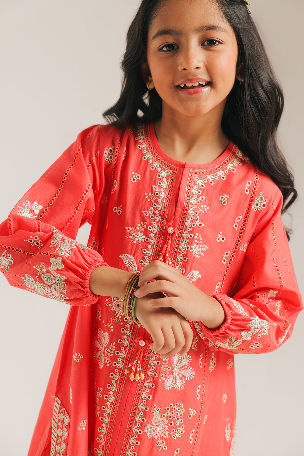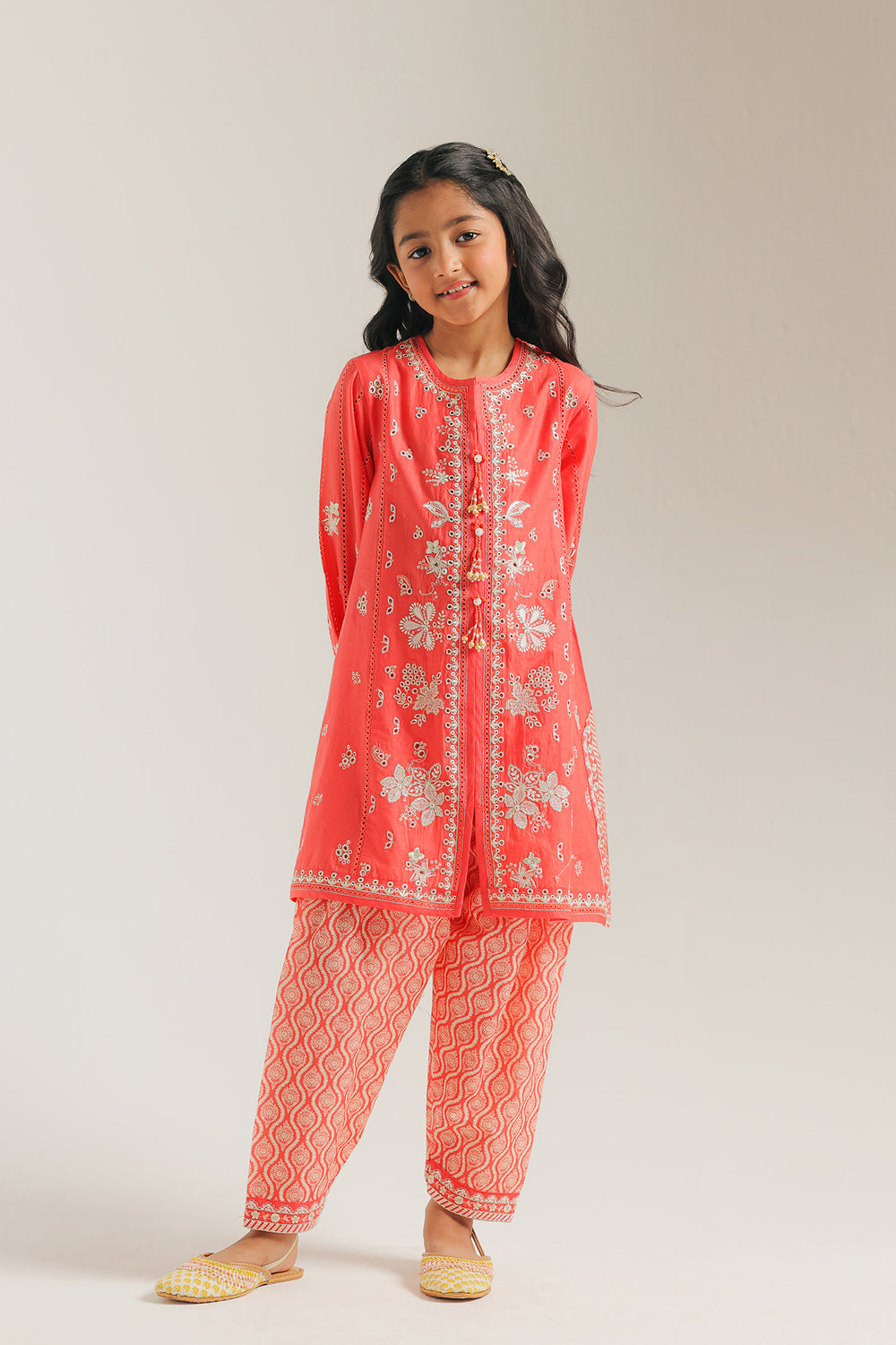 This charming suit is a vision of playful elegance. The vibrant coral tunic is a masterful canvas for the stunning white floral embroidery, which gracefully cascades across the front and sleeves. It features delicate cut-out details and a central placket adorned with charming, tasseled buttons, adding a touch of whimsy and texture. The tunic is beautifully paired with printed shalwar featuring a captivating geometric pattern that perfectly complements the intricate top. This delightful ensemble is a perfect choice for a young fashionista, designed to capture hearts and create unforgettable moments.