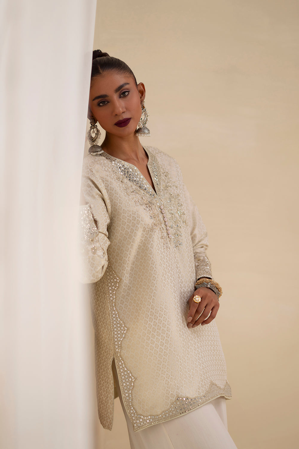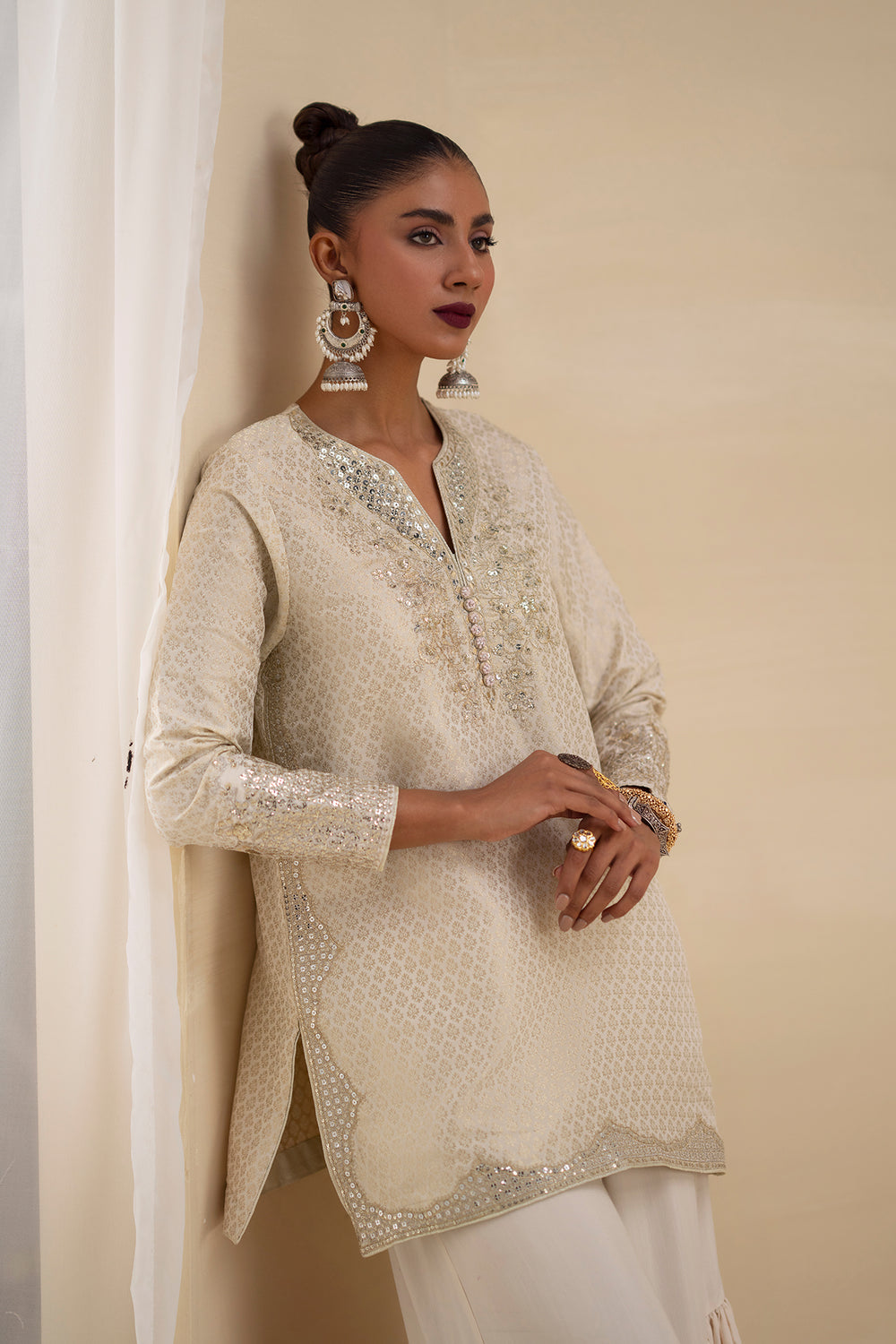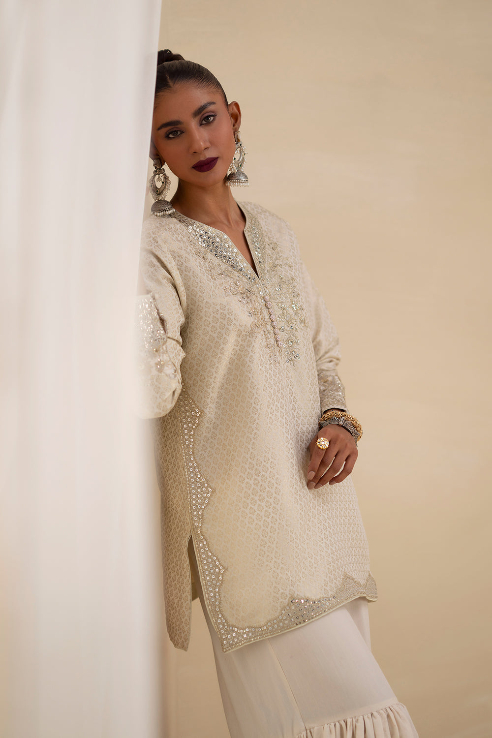 Illuminate the evening in this exquisitely detailed ivory embroidered suit, featuring a short shirt and a magnificent gharara. The straight-cut shirt is crafted from a luxurious off-white fabric with a subtle tonal woven pattern and features a deeply flattering V-neckline. The bodice and full sleeves are richly embellished with intricate gold and silver embroidery and sequin-work, giving it a luminous, festive appeal. The ensemble is completed by a voluminous gharara in a coordinating cream beige hue. The lower tier of the gharara is adorned with delicate, ornate gold thread embroidery and sequin work, creating a majestic, flared silhouette that is ideal for formal weddings or celebratory occasions.