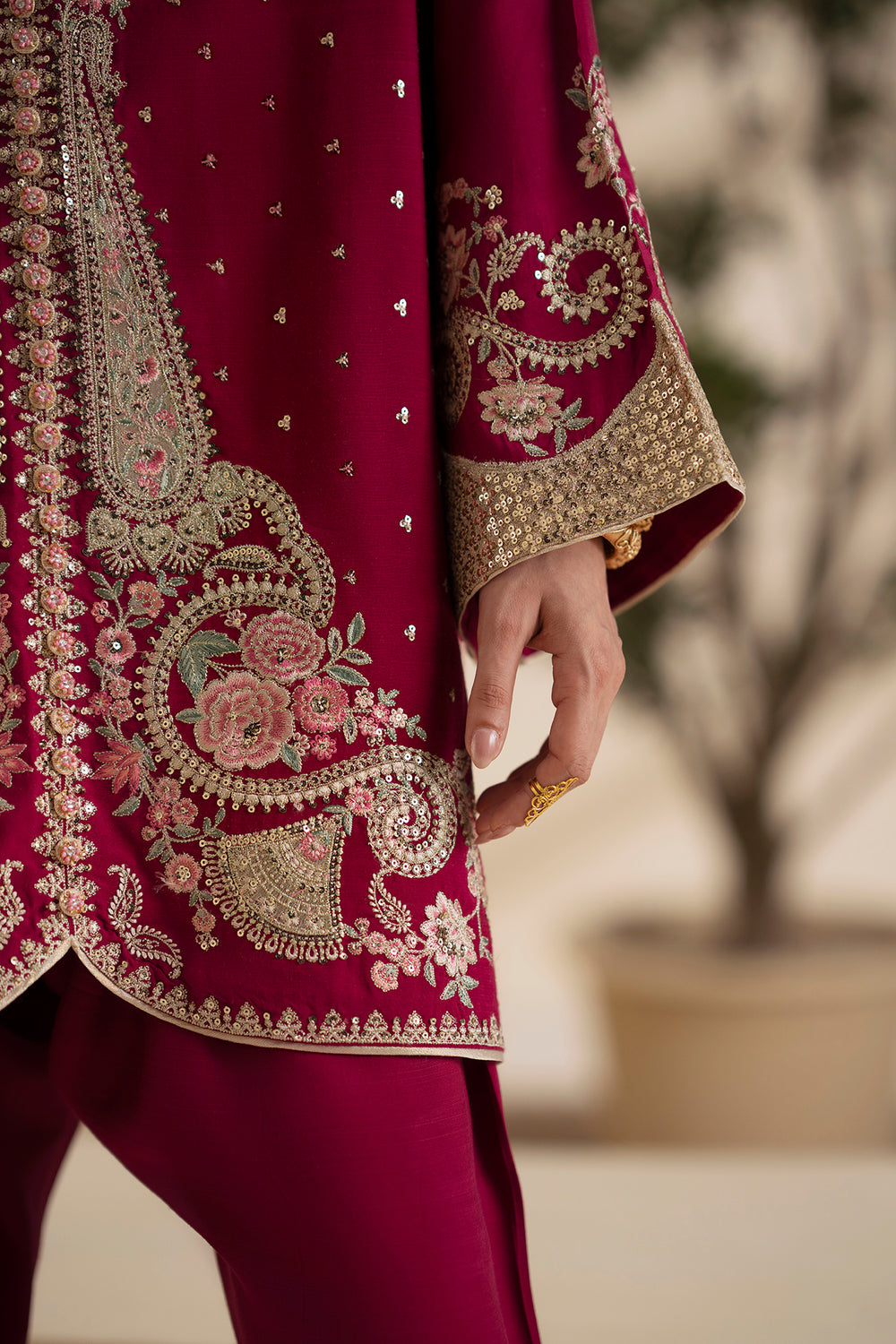 Channel timeless glamour in this breathtaking magenta embroidered suit. The relax fit kurti is crafted from a rich, deep magenta fabric and is lavishly adorned with heavy gold and silver thread embroidery. The embroidery features magnificent paisley and floral motifs running down the center front, along the hem, and gracefully decorating the sleeves. The ensemble is perfectly completed by coordinating shalwar in the same vibrant magenta hue. The hem of the shalwar boast a striking, heavily embroidered border, making this regal monochromatic look ideal for formal occasions and celebratory evenings.