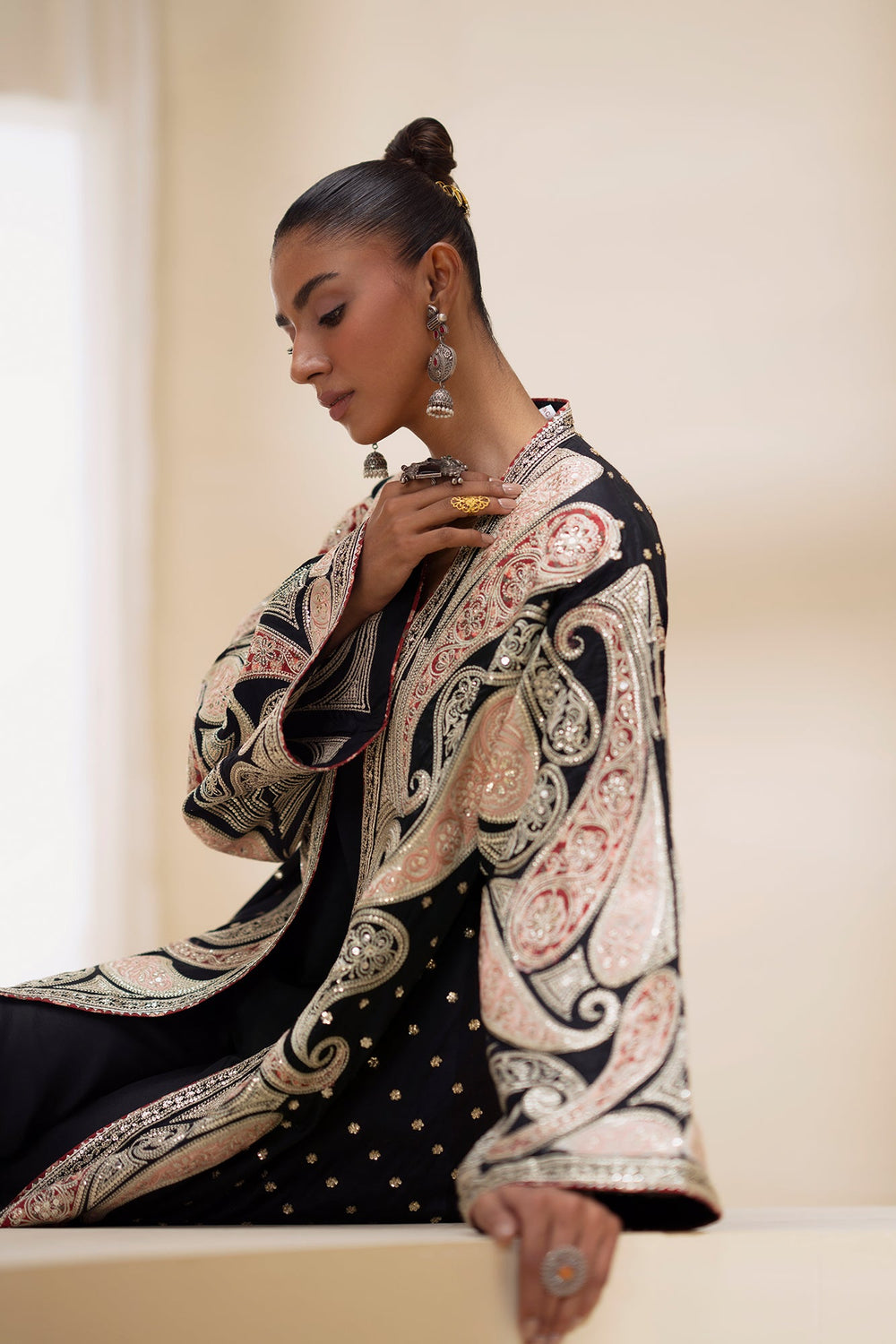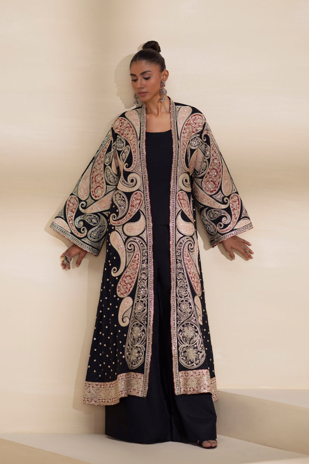 Dramatize your look with this incredibly opulent black embroidered suit, which includes a flowing gown, trousers, and a coordinating slip. The stunning open-front gown is crafted from a deep black fabric and is a masterpiece of craftsmanship. It is lavishly covered in oversized paisley motifs and intricate traditional patterns worked in shimmering gold, silver, and red thread embroidery and sequin detailing. The long, wide sleeves and full-length gown are heavily embellished, ensuring a majestic, eye-catching silhouette. Worn underneath the gown is a wide leg flapper and a slip, both in solid black, to provide a sophisticated foundation for the heavy outerwear. This set is the ultimate statement piece for a grand wedding reception or high-end evening gala.
