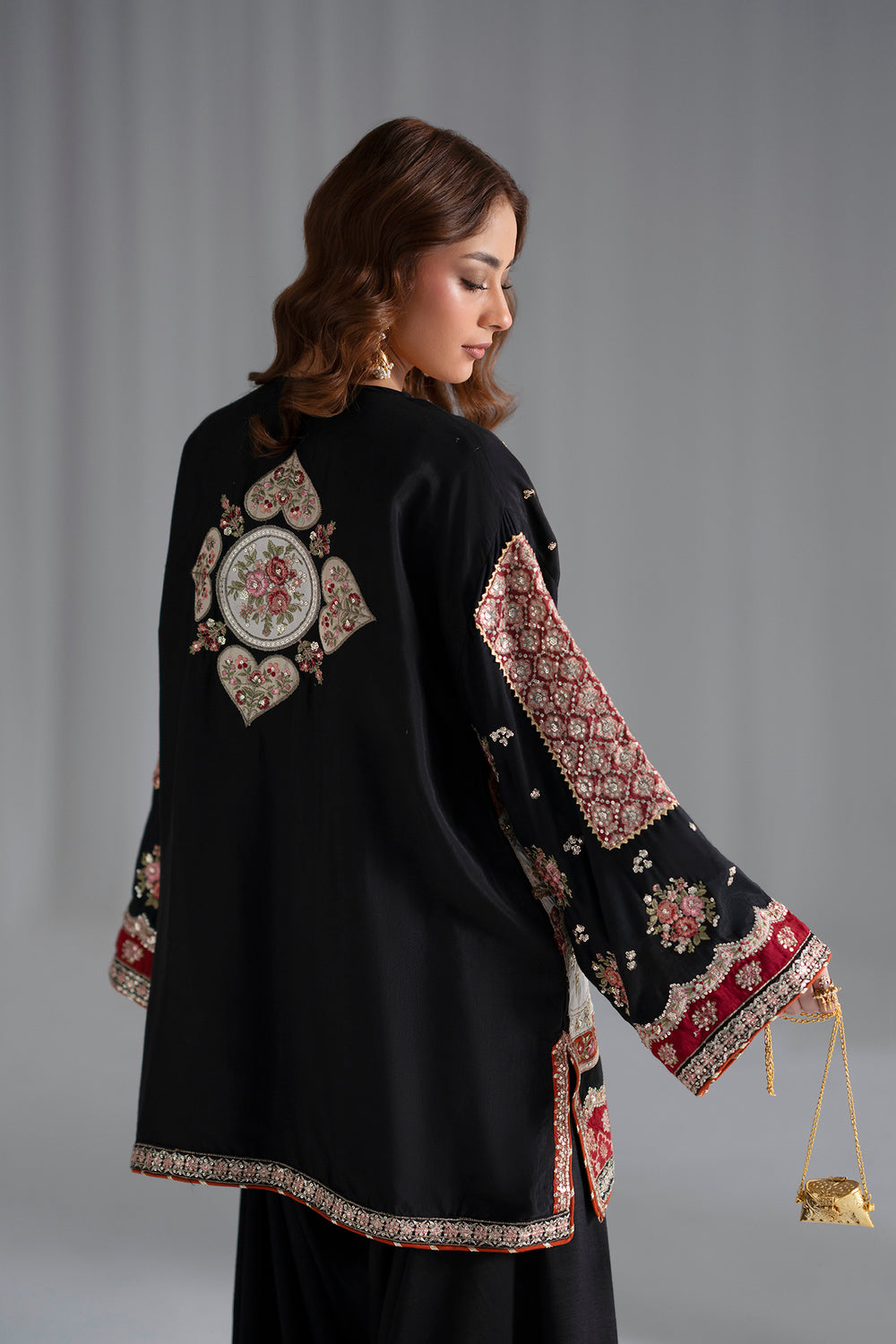 This striking black kurta commands attention with its opulent embroidery inspired by Kashmiri and Mughal heritage. Rich embroidery in vibrant red, cream, pink, and green adorns the garment with intricate floral and paisley motifs, creating a dramatic contrast against the dark base. The design concentrates along a wide vertical centre front panel, extending to the cuffs and shoulder areas, establishing a sophisticated frame. The V-neckline provides elegant definition, while voluminous long sleeves offer graceful movement and visual impact. This expertly crafted piece merges traditional artistry with contemporary silhouettes, making it an exceptional choice for formal celebrations, weddings, and occasions where bold elegance is desired.