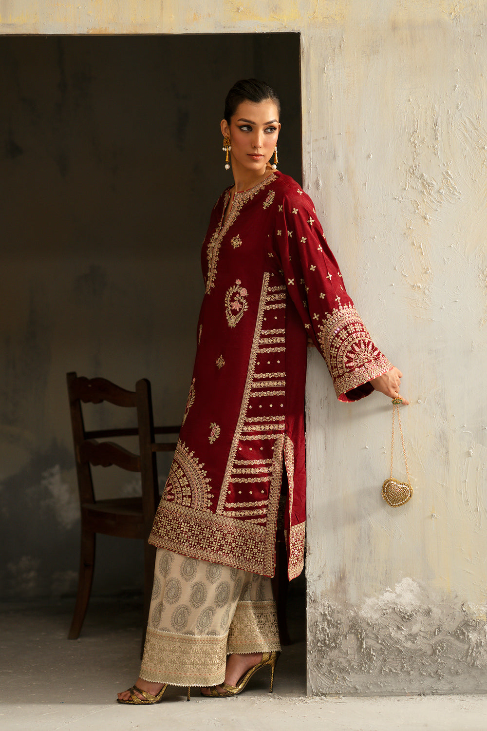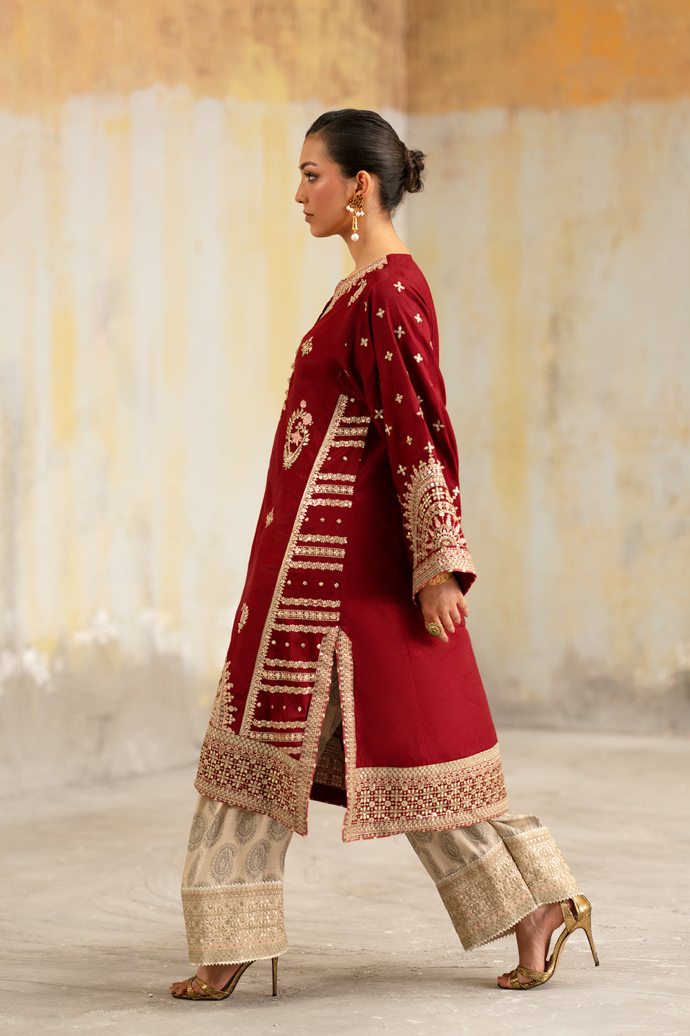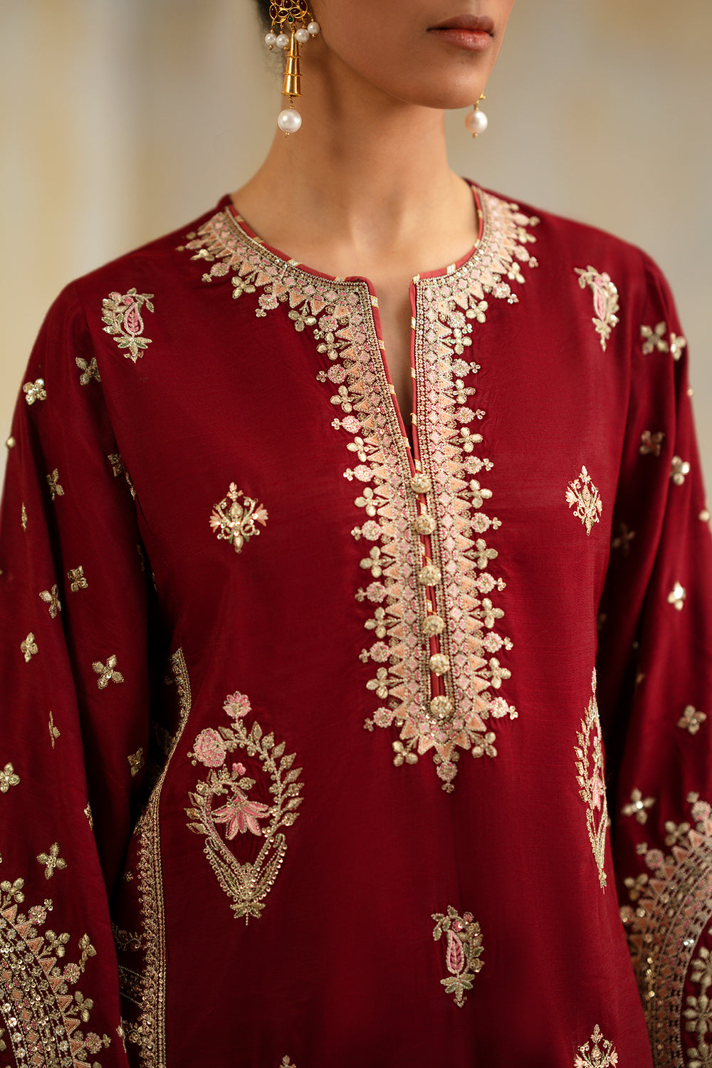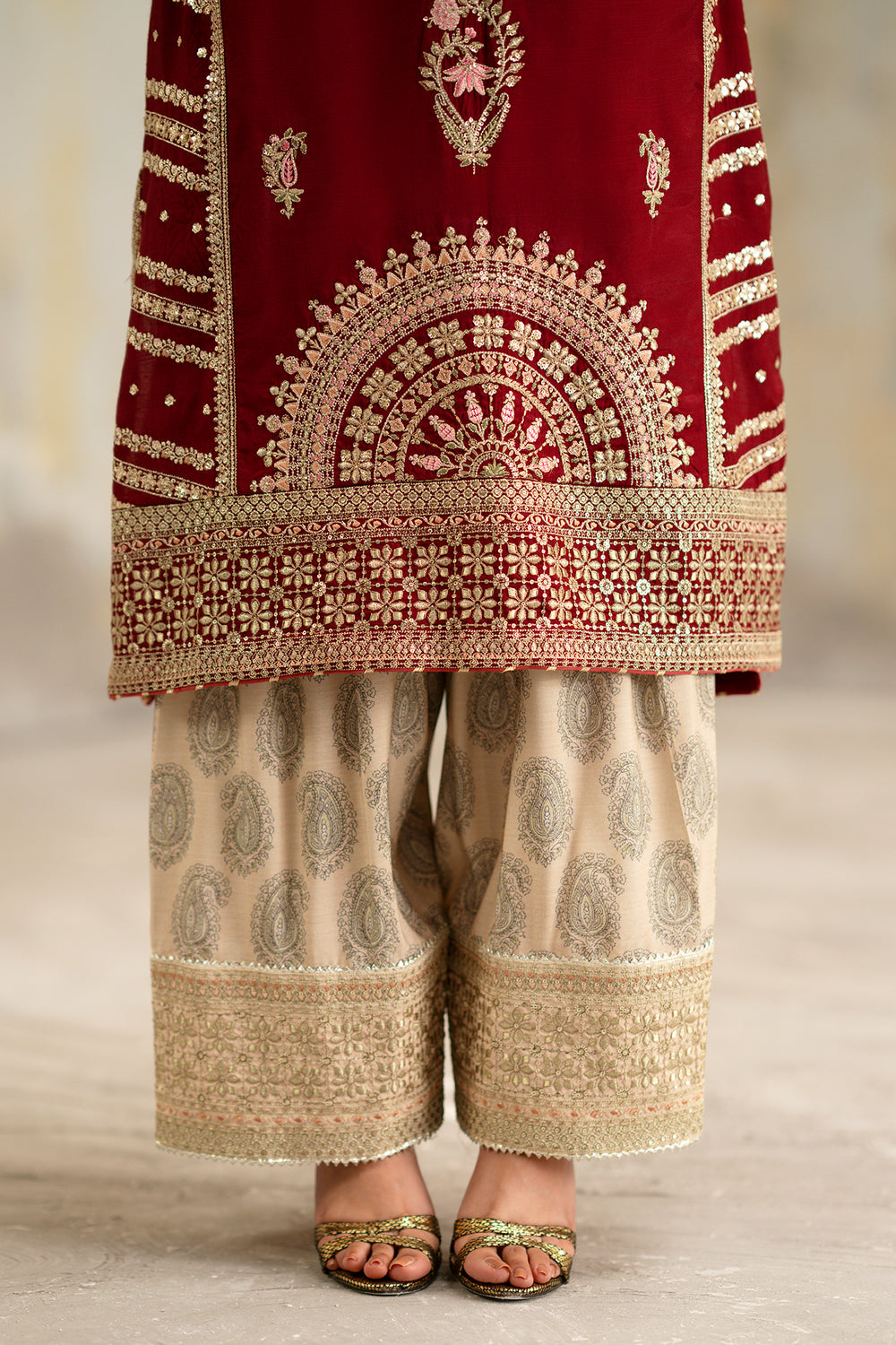 Make a grand entrance in this regal two-piece embroidered suit, featuring a rich maroon tunic that exudes timeless elegance. The shirt is masterfully adorned with intricate ivory and gold tilla work, showcasing a magnificent circular motif at the hem and delicate floral sprays across the bodice. Ornate architectural patterns define the wide sleeves, adding a touch of heritage luxury. It is perfectly paired with contrast beige wide-leg shalwar, featuring a classic tonal print and a shimmering embroidered border at the ankle. This high-fashion ensemble is the definitive choice for sophisticated evening festivities and formal celebrations.