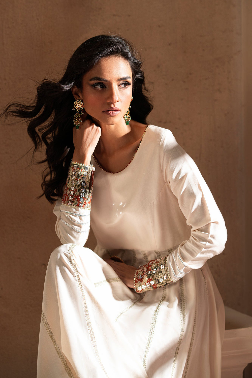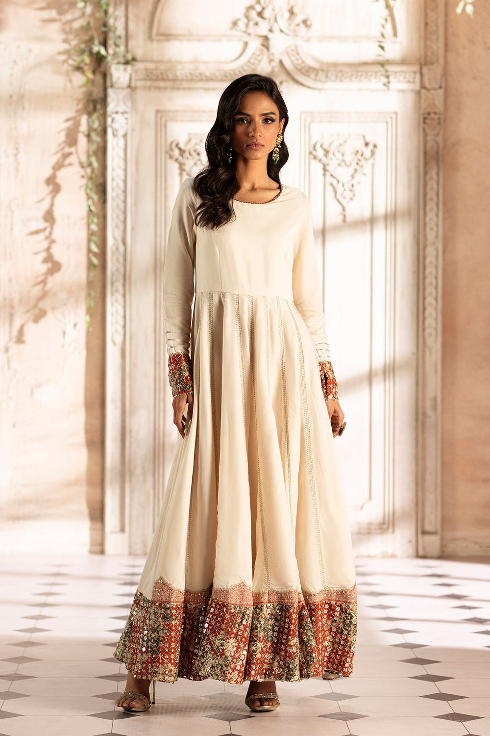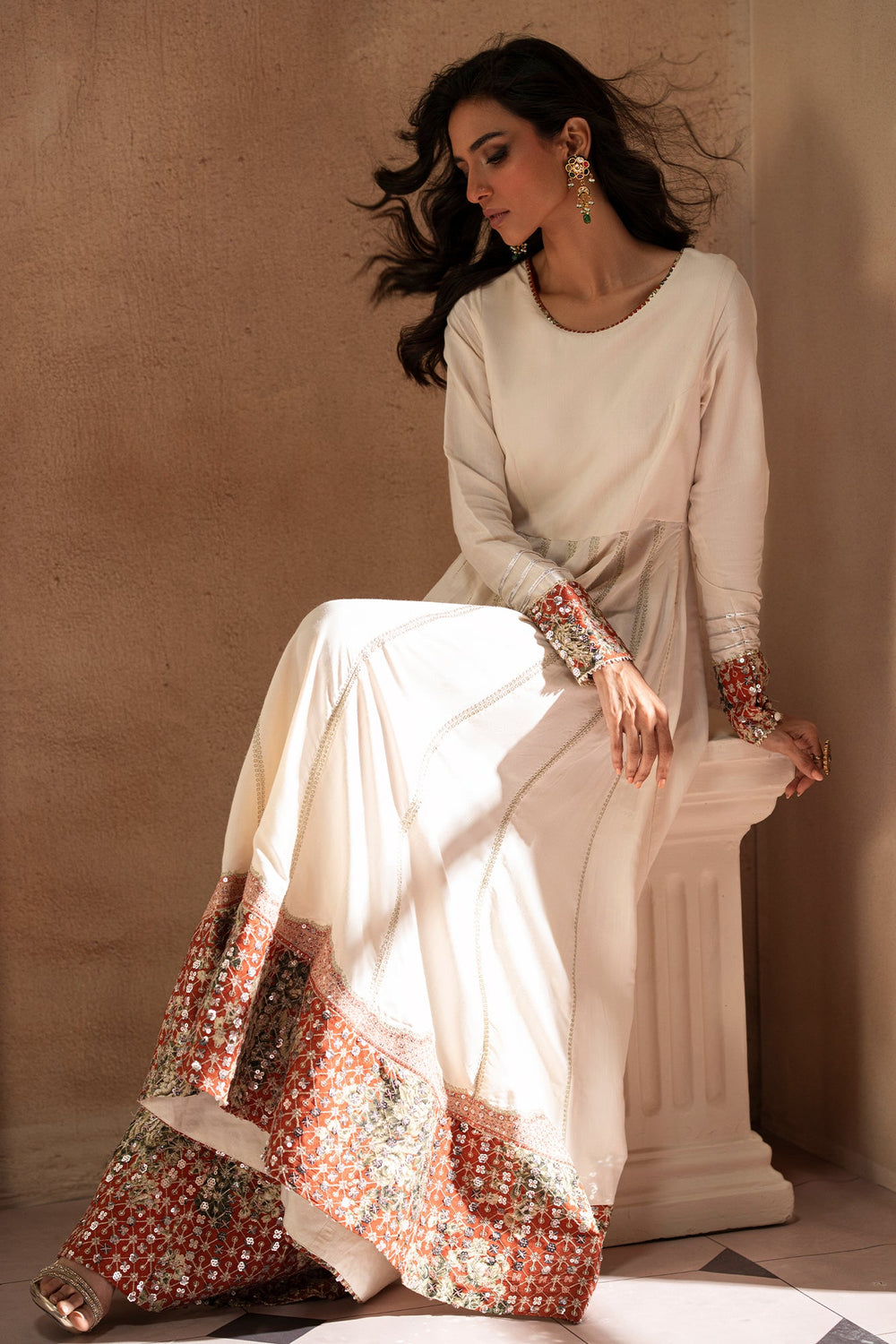This sophisticated pishwas features a modern design, with a flattering flared silhouette with panels below yoke portrayed in a creamy of white color. It is embellished with stunning floral printed border at bottom and sleeves opening in vibrant hues and enriched with scintillating embellishments, adding a touch of grace and elegance. Perfect for special occasions, this outfit is sure to make a statement with its traditionally rich design.