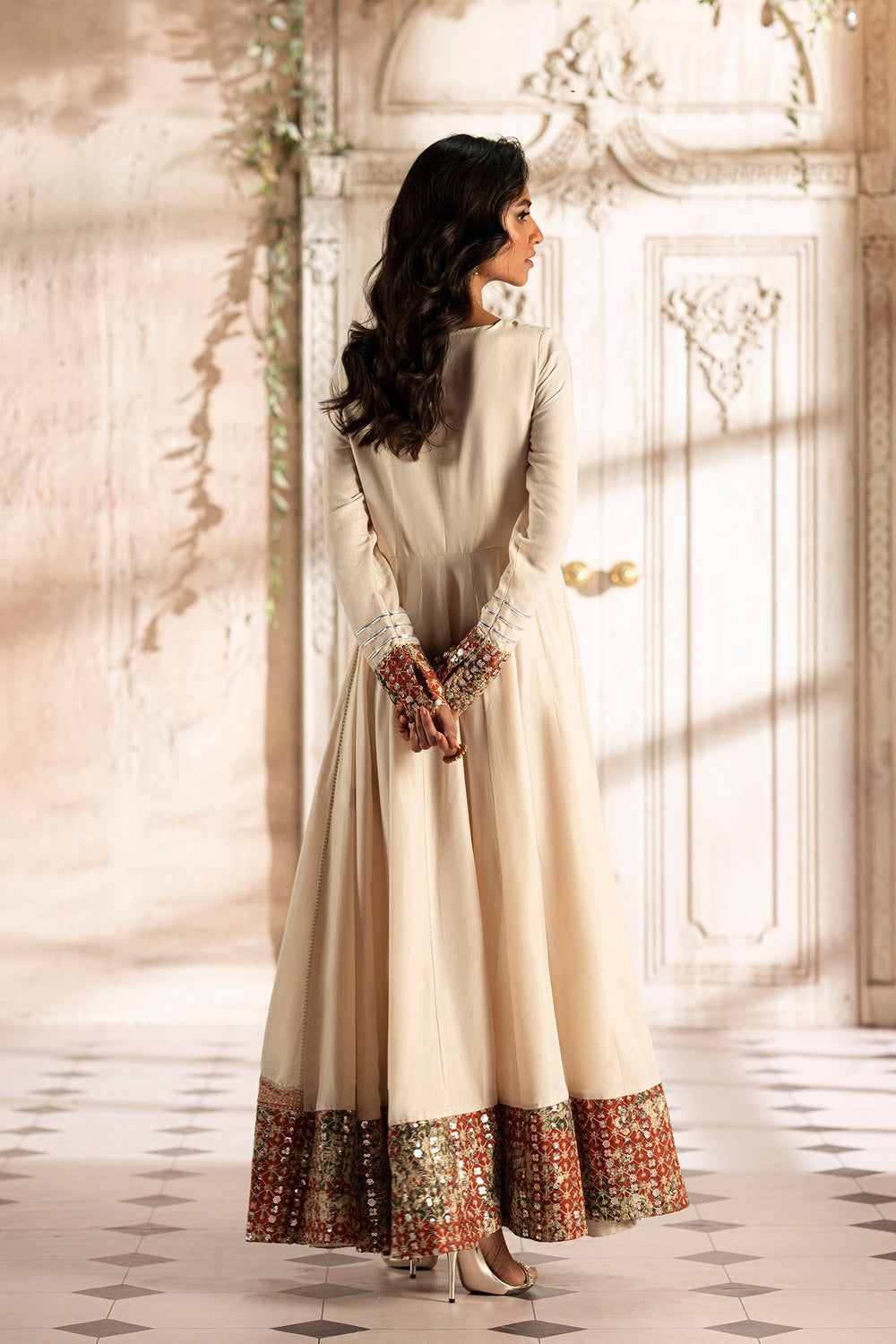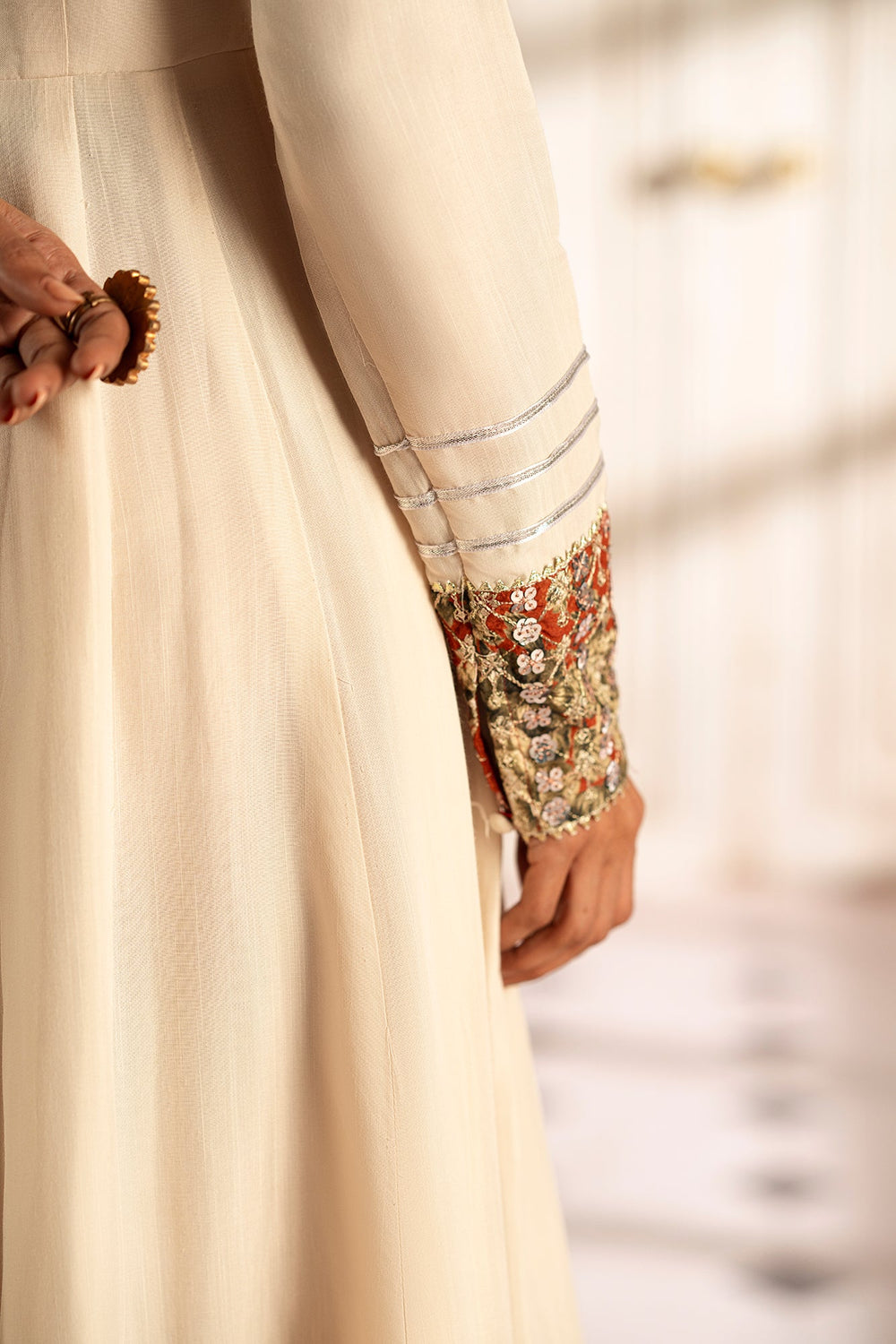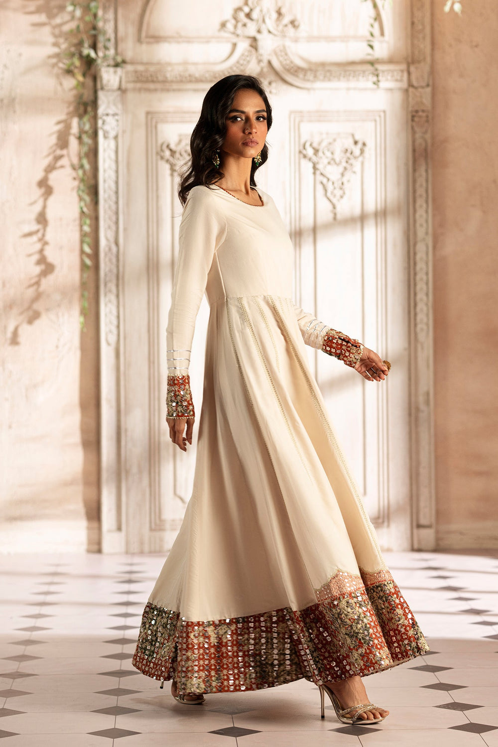 This sophisticated pishwas features a modern design, with a flattering flared silhouette with panels below yoke portrayed in a creamy of white color. It is embellished with stunning floral printed border at bottom and sleeves opening in vibrant hues and enriched with scintillating embellishments, adding a touch of grace and elegance. Perfect for special occasions, this outfit is sure to make a statement with its traditionally rich design.