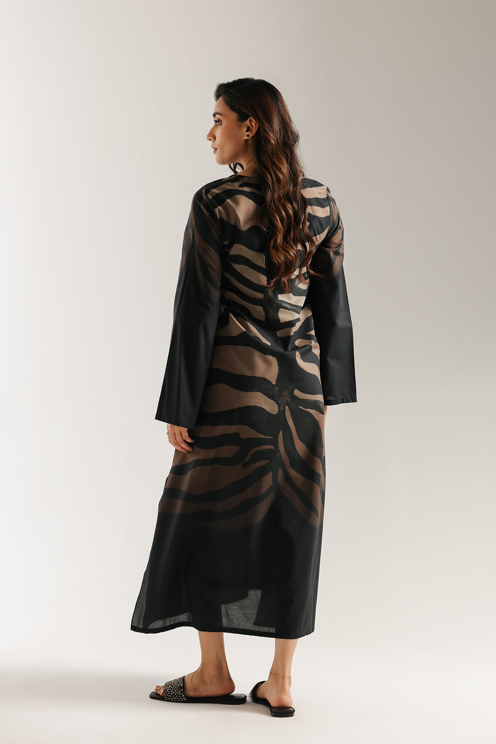 Make a statement with this bold printed dress. This striking black maxi dress features a contemporary animal print in warm brown tones that creates a powerful and dynamic look. The dress has a long, fluid silhouette with side slits for effortless movement. With its stylish embellished neckline and comfortable fit, it's a perfect choice for a confident and modern aesthetic.