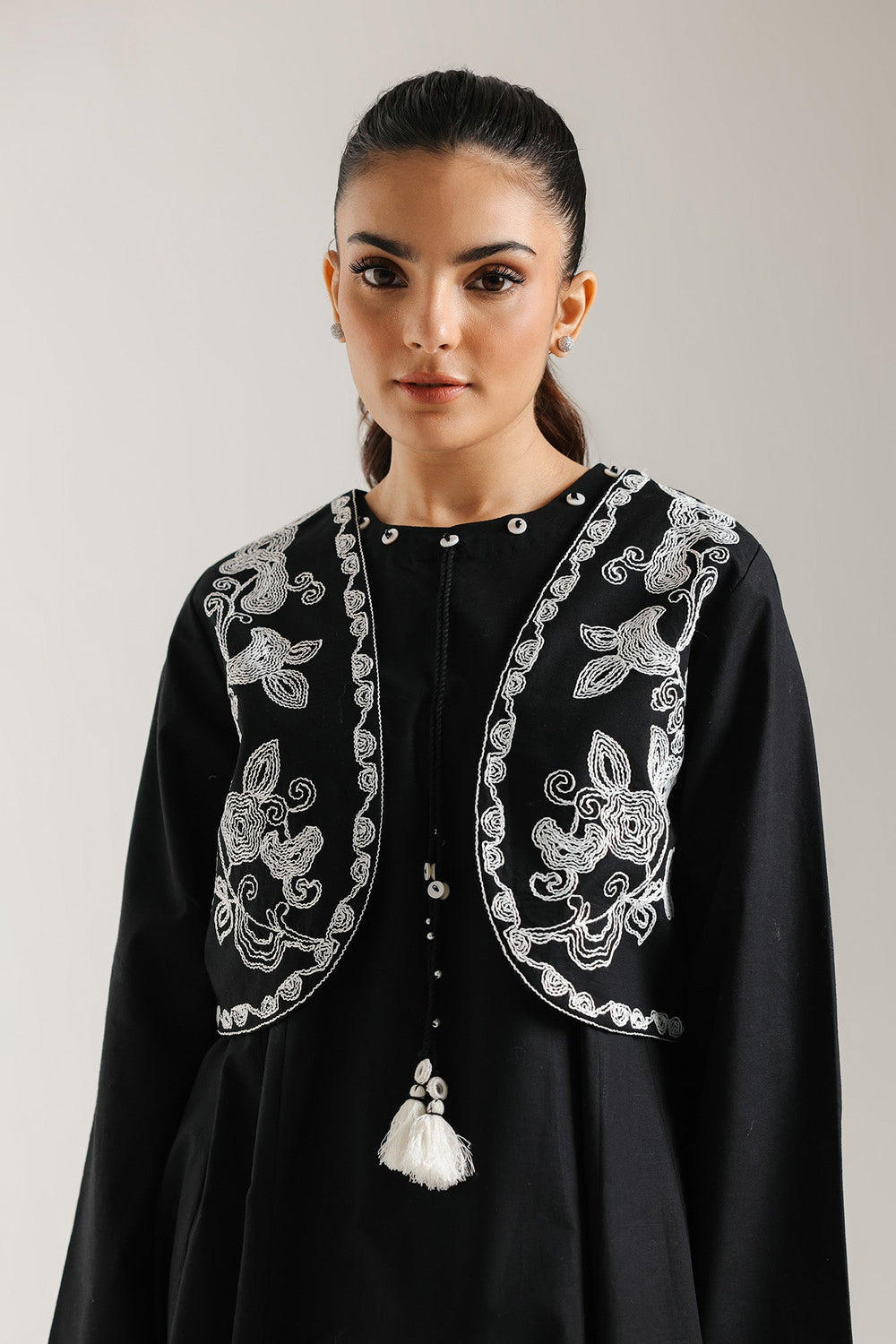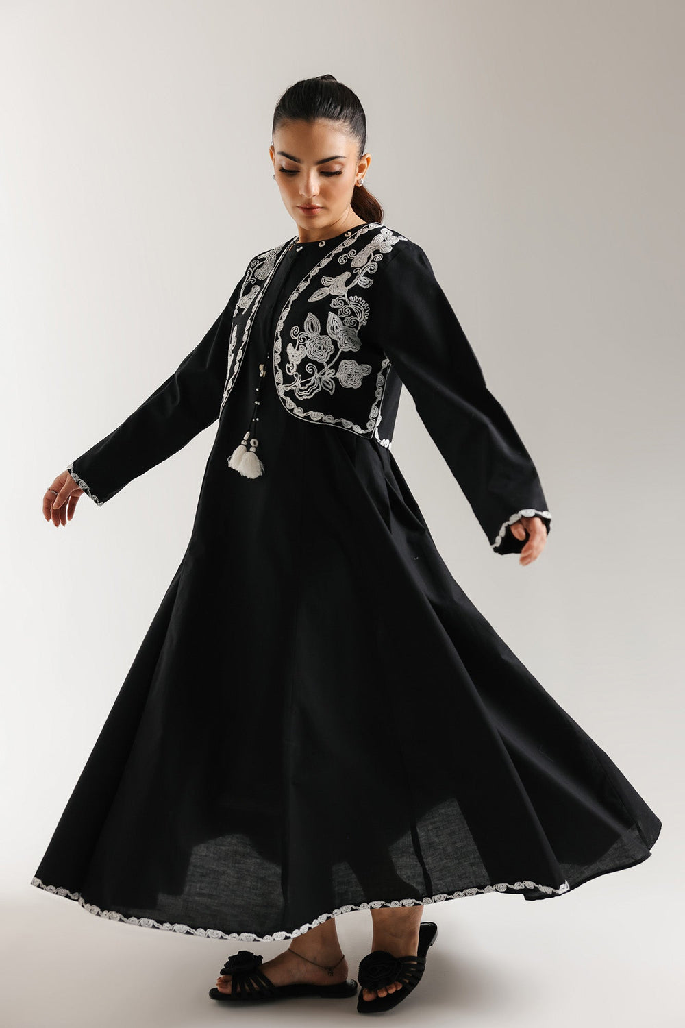 Embrace elegant contrast and artisanal flair with this stunning black embroidered dress featuring a coordinating waistcoat. This ensemble features a flowing full-length black dress with a graceful A-line silhouette. The dress has long sleeves and is subtly detailed with a delicate scalloped white trim along the hemline. The look is perfectly completed by the striking short black waistcoat. The waistcoat is richly embellished with bold white floral embroidery and features delicate white tassels at the center front. This two-piece set offers a sophisticated, dramatic statement with a touch of traditional embroidery.