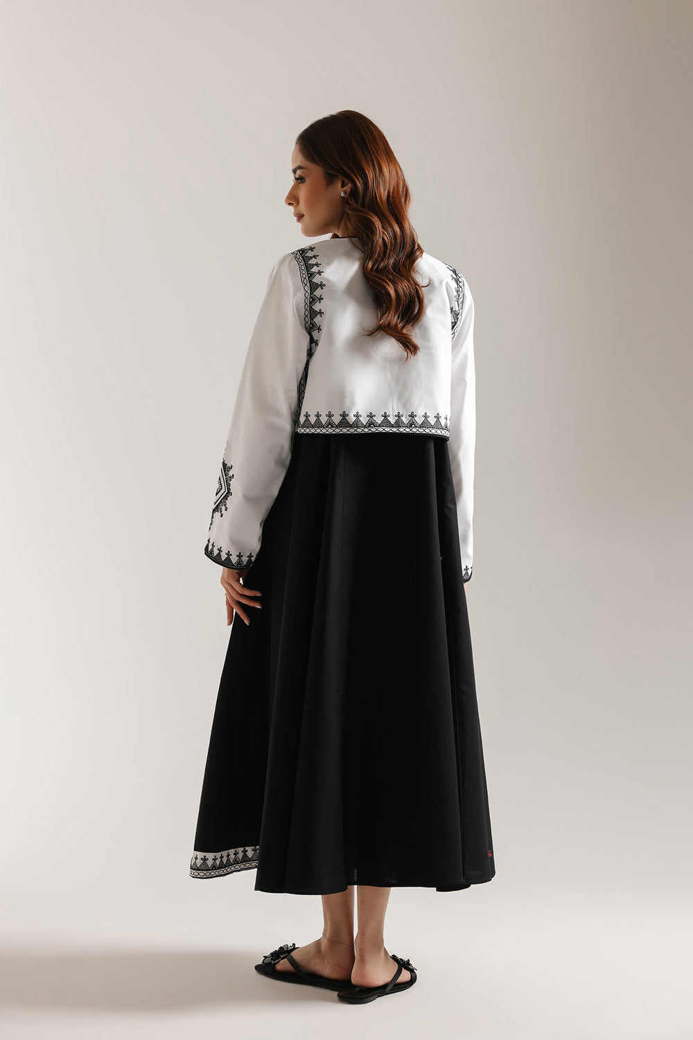 Twirl with dramatic flair in this striking black and white embroidered dress. This stunning maxi-length dress features a long, flowing skirt made from a solid black fabric. The drama comes from the fitted white waistcoat adorned with bold black geometric embroidery and tassels. The long sleeves are made of a white fabric and also feature the graphic black embroidery. The monochrome design is finished with a delicate Border along the hem, creating a mesmerizingly chic and high-contrast look.