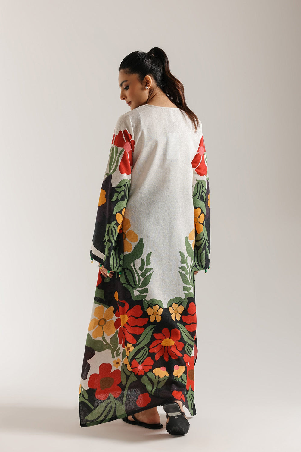 Make a show-stopping entrance in this exceptionally bold printed dress. This dramatic, long-length dress is a feast of vivid color and striking design. It is crafted from a white-based fabric adorned with large, stylized floral motifs in powerful shades of red, green, mustard yellow, and black. The garment features bold vertical black and white stripes bordering the neckline, which visually lengthens the silhouette. Adding a playful touch, small pom-pom embellishments accent the wide sleeves and neckline. This piece is the perfect choice for those who love color, pattern, and making a memorable impression.