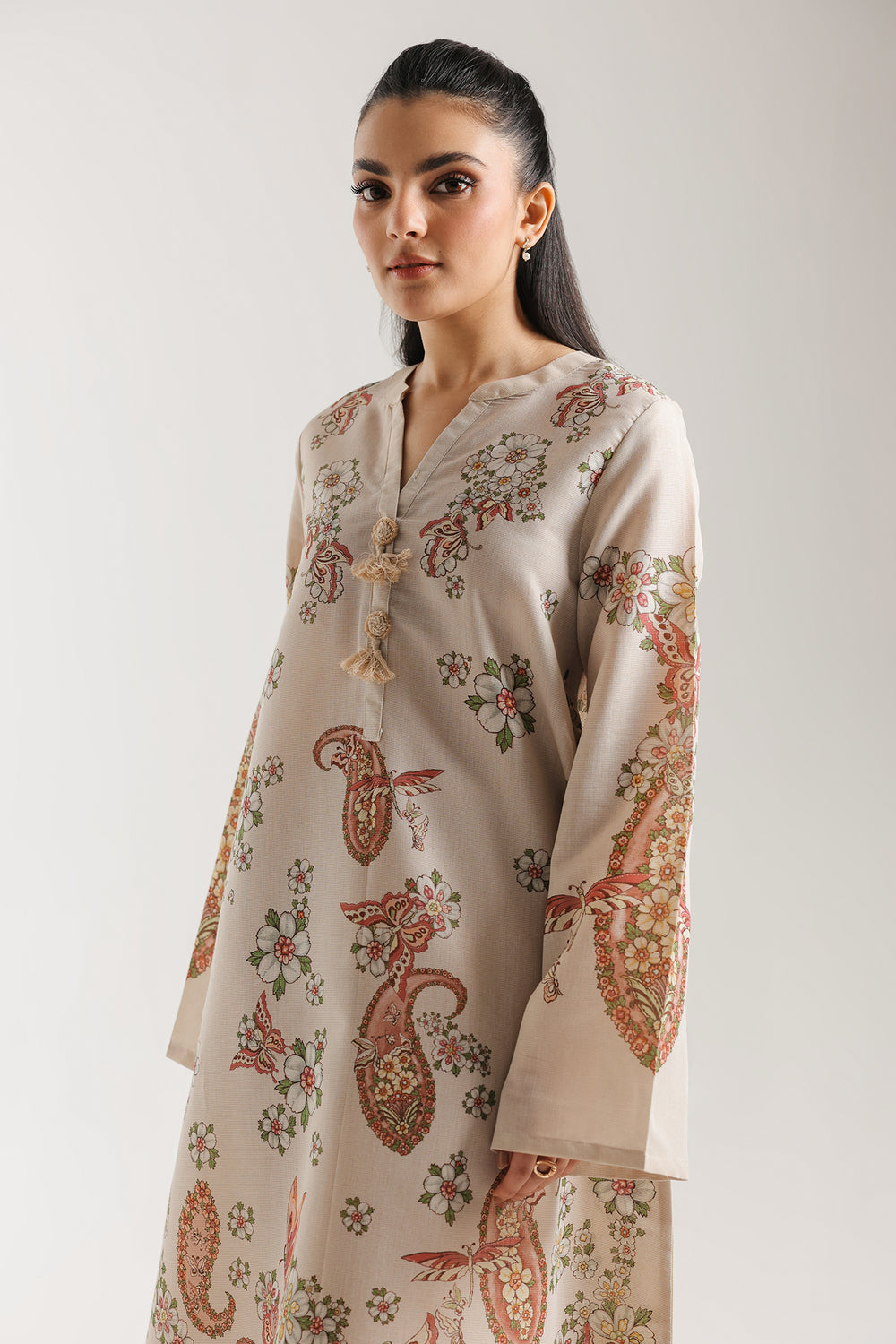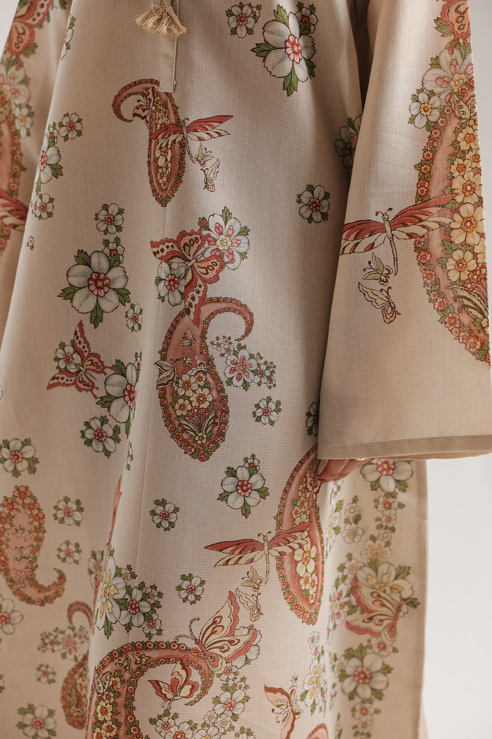 Radiate effortless charm in this ethereal printed dress, a masterpiece of fluid grace and artistic detail. Bathed in a serene ivory hue, the floor-length silhouette serves as a canvas for sprawling, vintage-inspired paisley and botanical motifs in soft terra-cotta and sage green. The delicate V-neckline is accented with elegant button detailing and playful tassels, while the voluminous wide sleeves add a touch of dramatic flair. Designed for both comfort and high-fashion impact, this dress is the ultimate statement piece for garden soirées or sophisticated summer escapes.