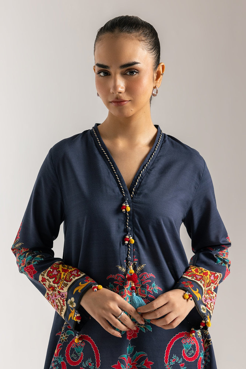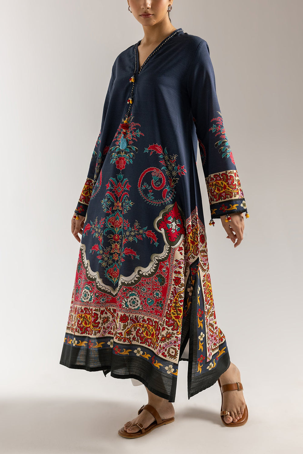 A canvas of vibrant color and design, this navy blue tunic makes a striking statement. The long silhouette is adorned with an intricate, artistic print of red, yellow, and blue floral and abstract motifs. Multi-colored tassels at the V-neckline add a playful, bohemian touch, while the decorative border on the hem and sleeves brings a final layer of sophisticated detail. This piece is a perfect blend of comfort and captivating style.