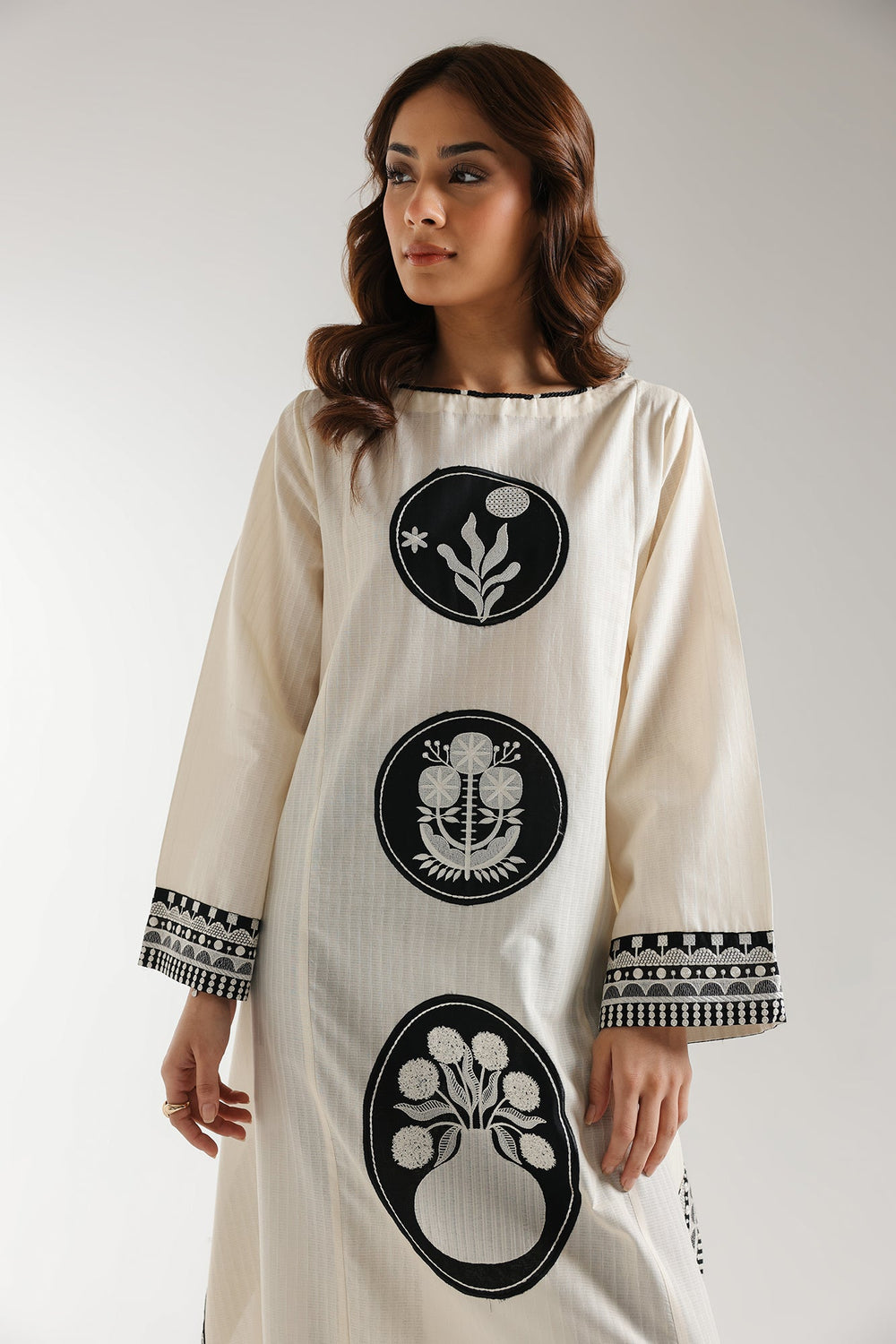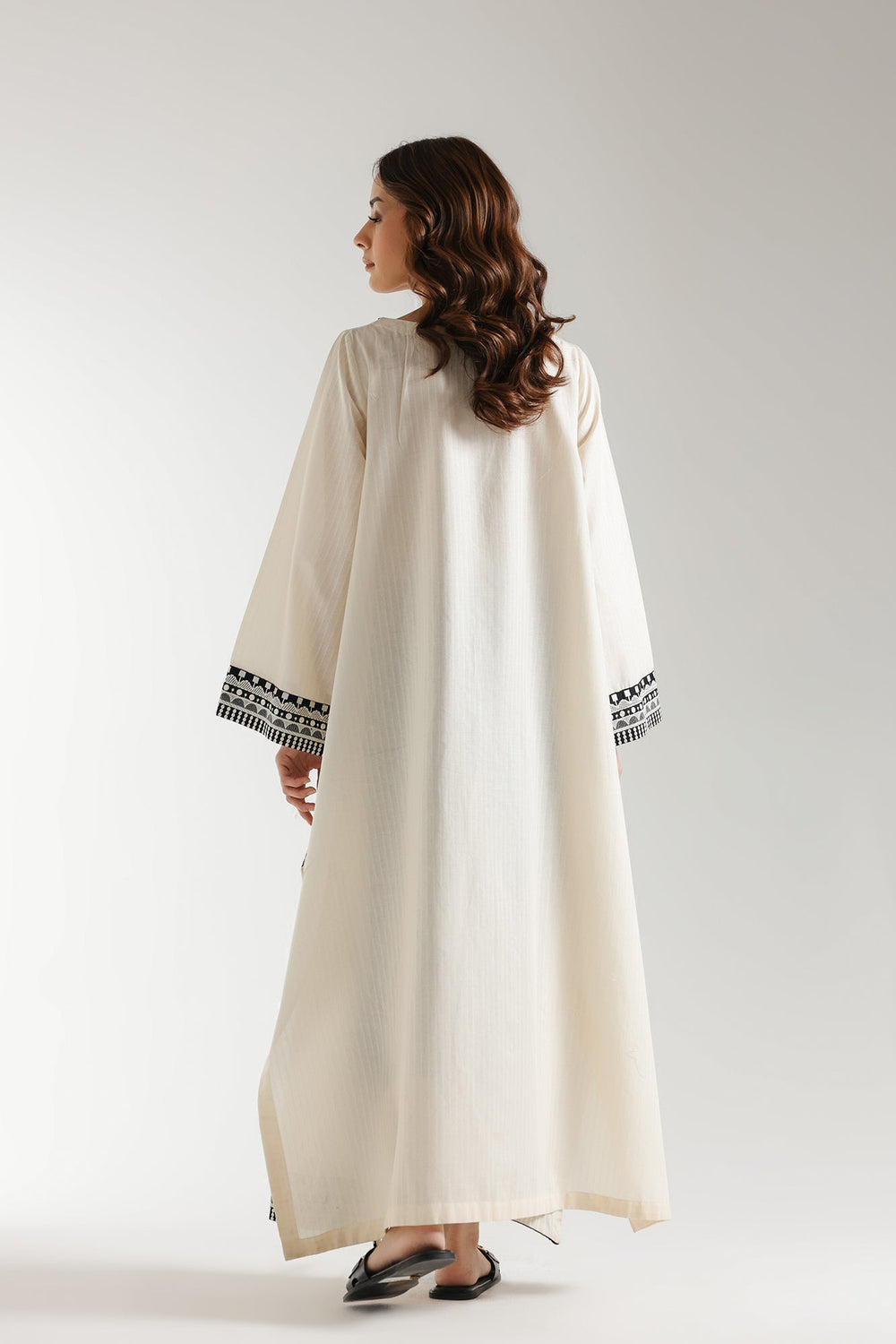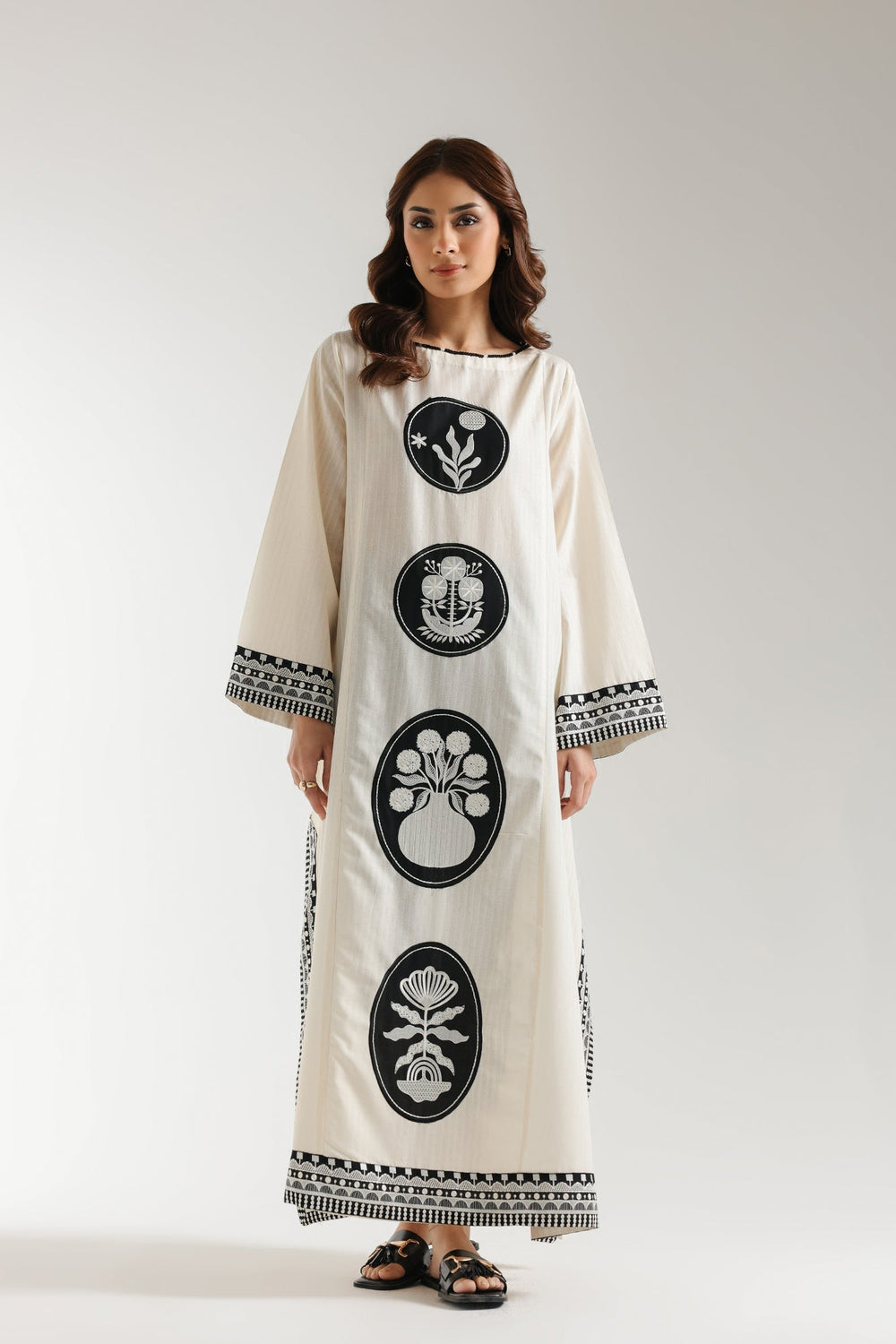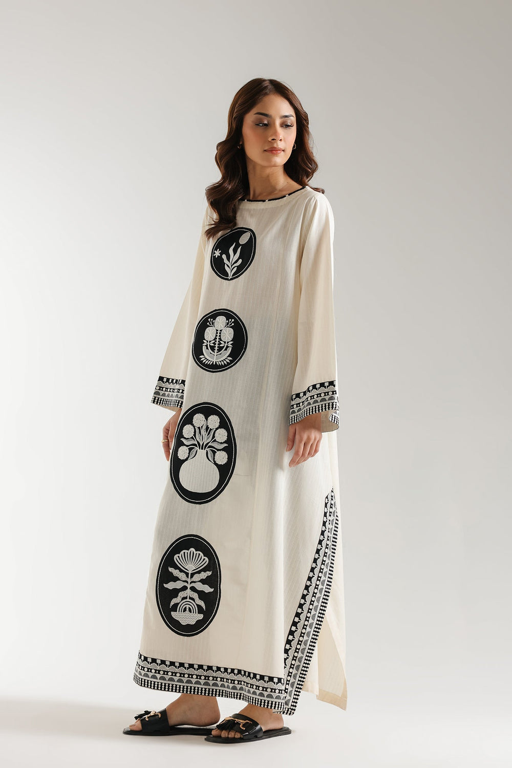 This stylish dress features an elegant elongated silhouette and intricate embroidery with exquisite floral patterns in contrasting black tones. Its mesmerizing off-white color is enhanced with a contemporary geometric pattern A-line hem, making it a fashionable choice for casual occasions during the summer season.