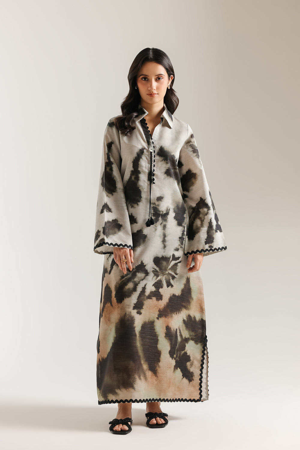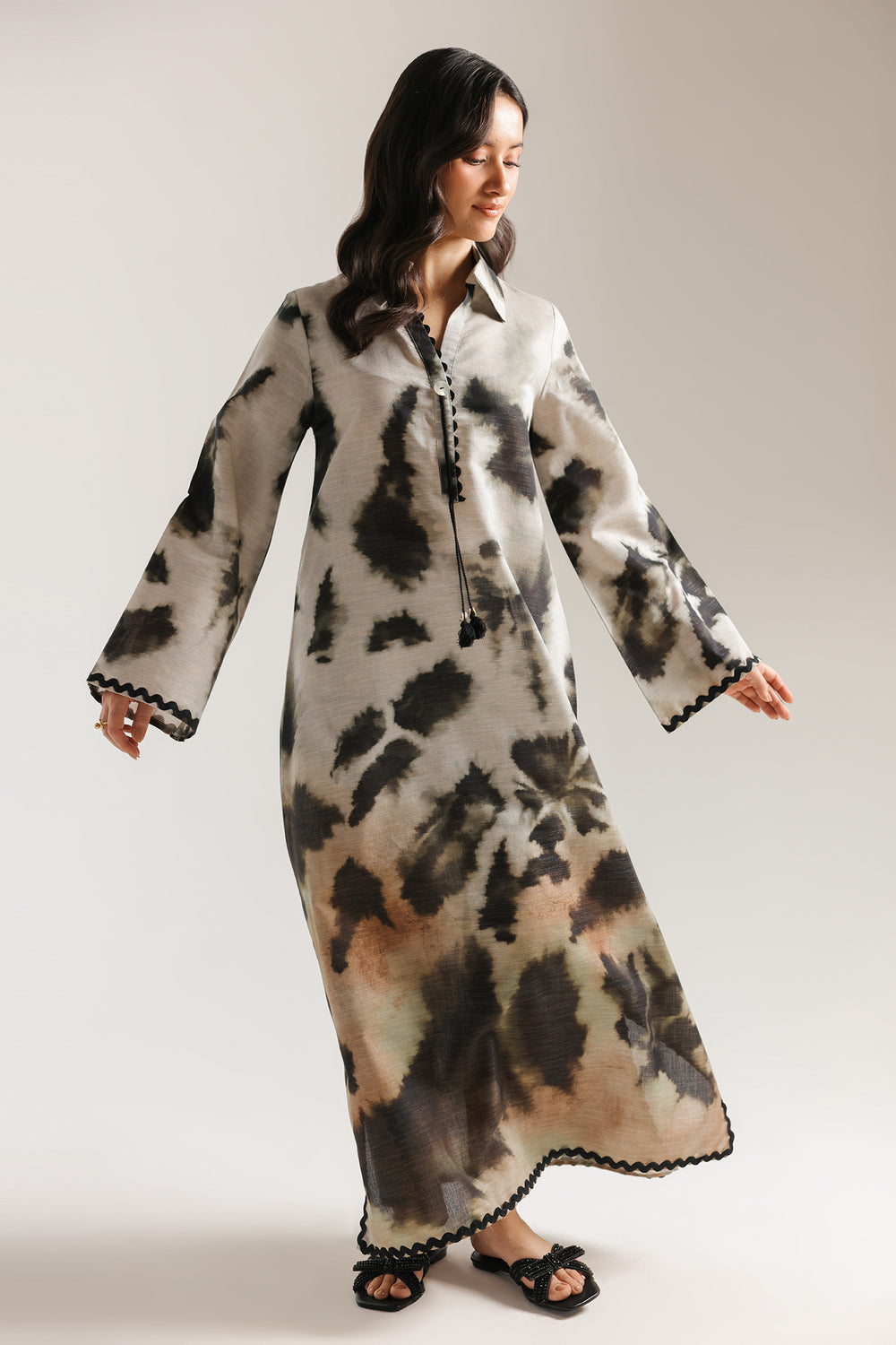 Exude effortless bohemian luxury in this printed kaftan-style tunic, a perfect marriage of fluid silhouette and artistic design. The jet black and stone-grey tie-dye inspired print is complemented by a sophisticated collared neckline and a decorative button placket finished with a dainty tassel drop. Wide, flared sleeves and a straight-cut hem are accented with a delicate black scalloped trim, adding a refined textural finish to the light, airy fabric. This high-fashion piece is designed for the woman who seeks a relaxed, contemporary look without compromising on high-fashion details.