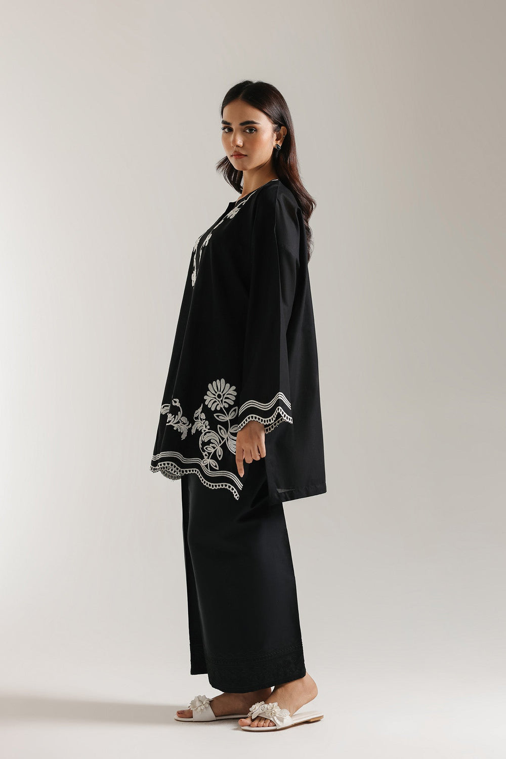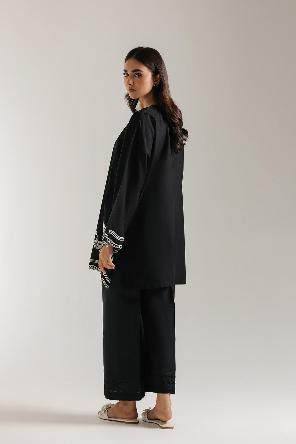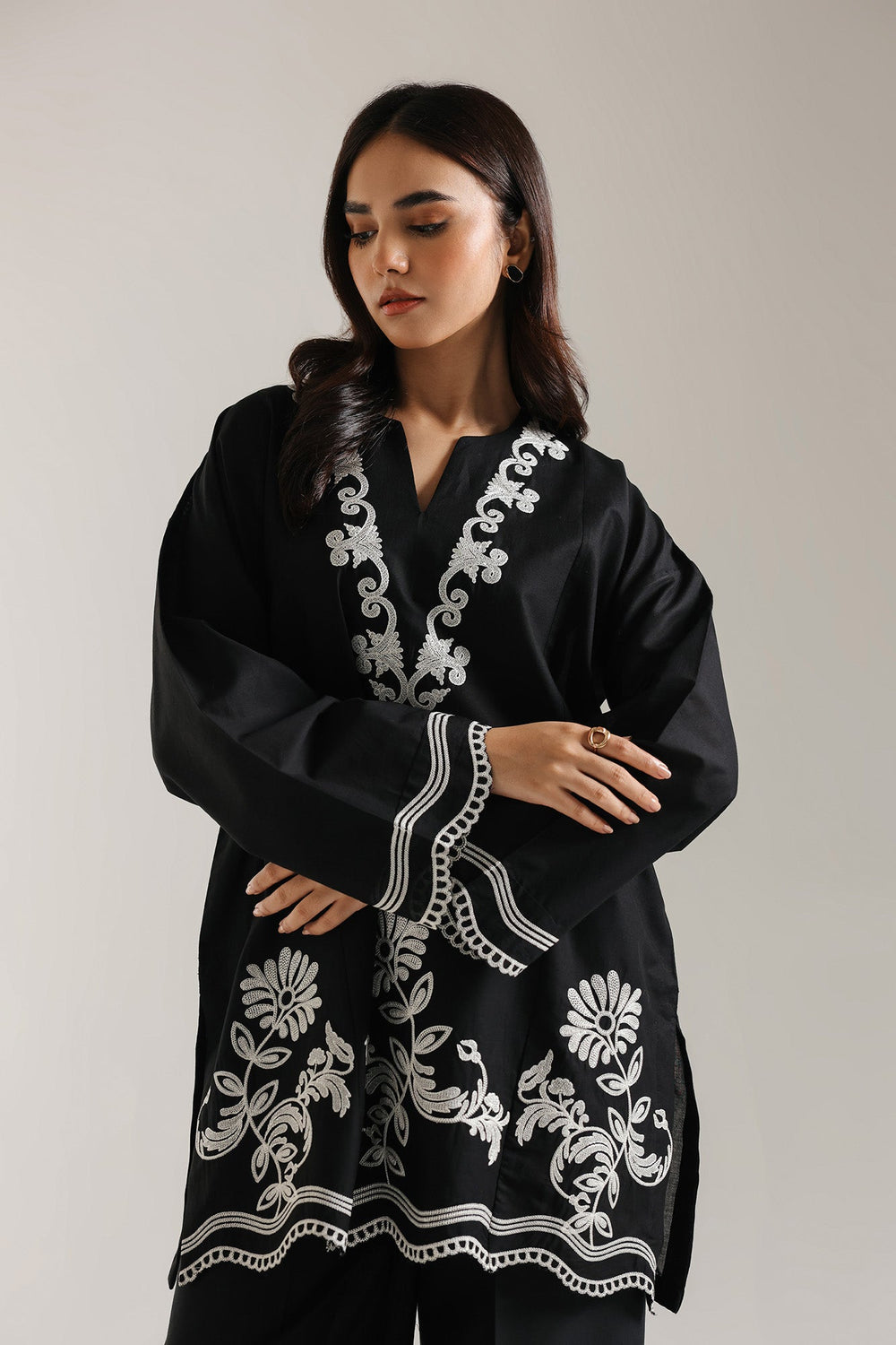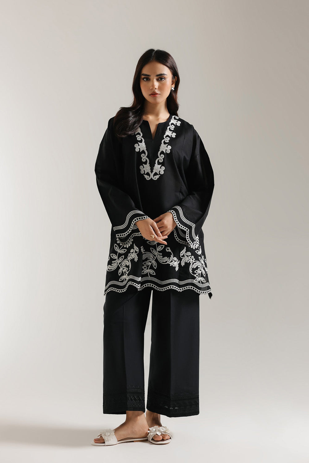 Make a statement with this classic black kurti, featuring exquisite white embroidery along the V-neckline, cuffs, and hem. Pair it with matching black trousers to complete the look. Perfect for both special occasions and adding a touch of refinement to your everyday wardrobe.