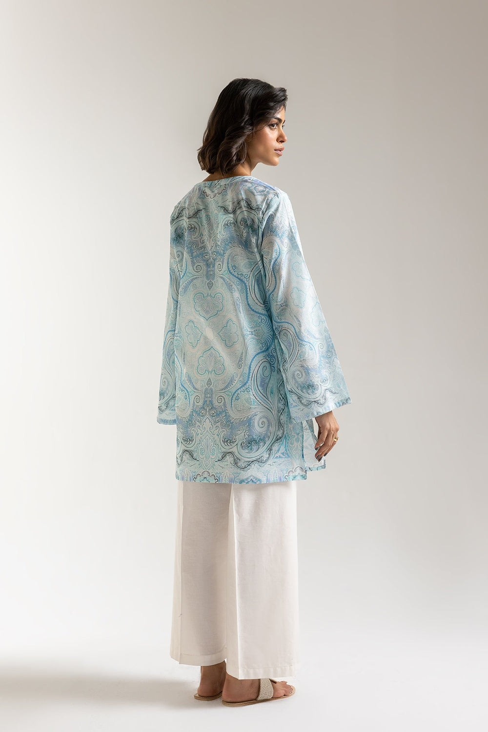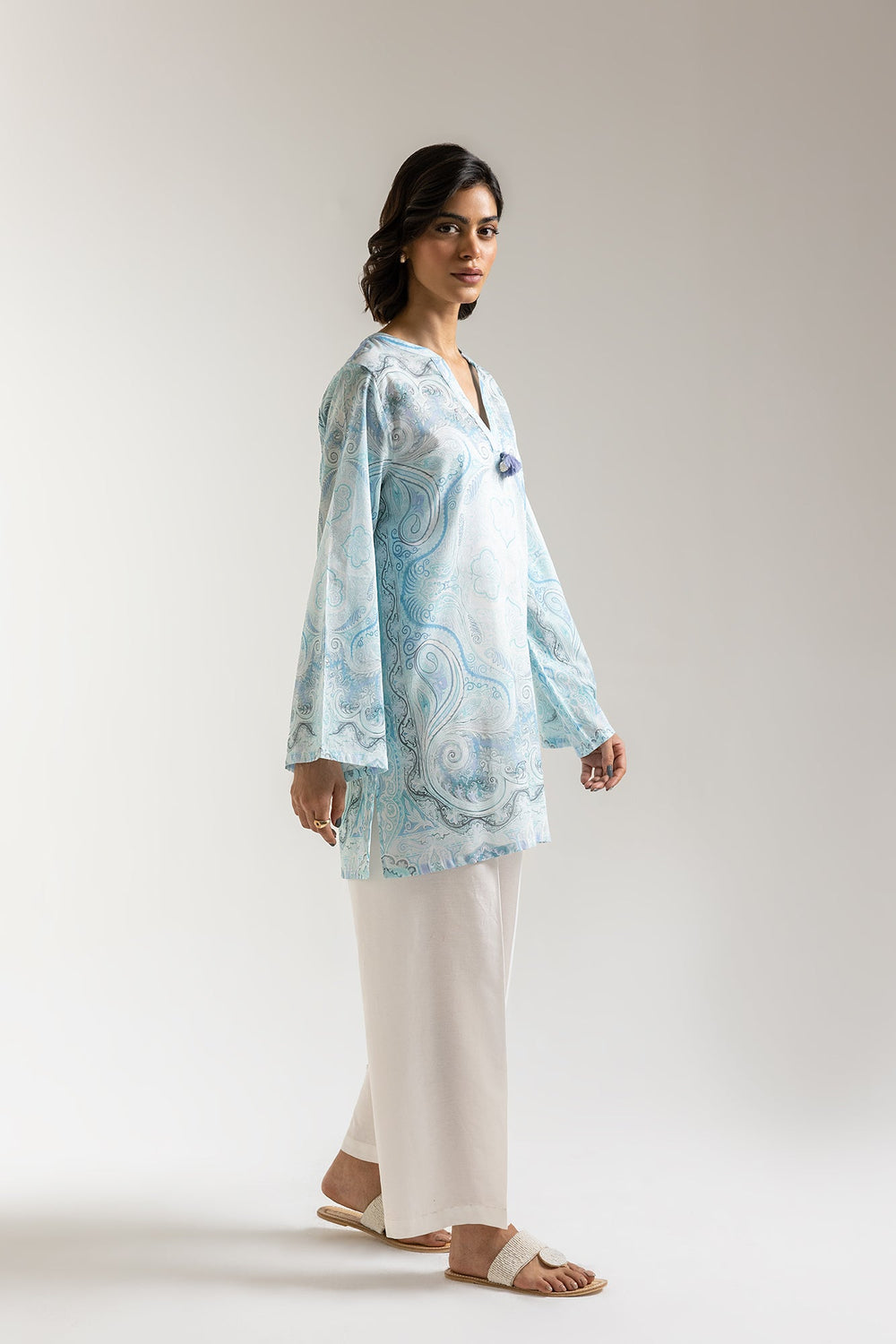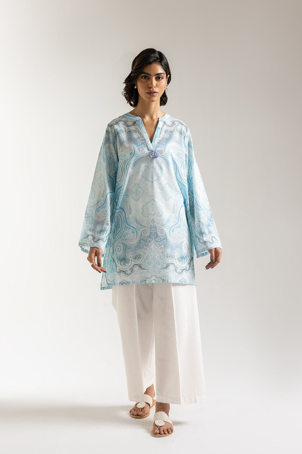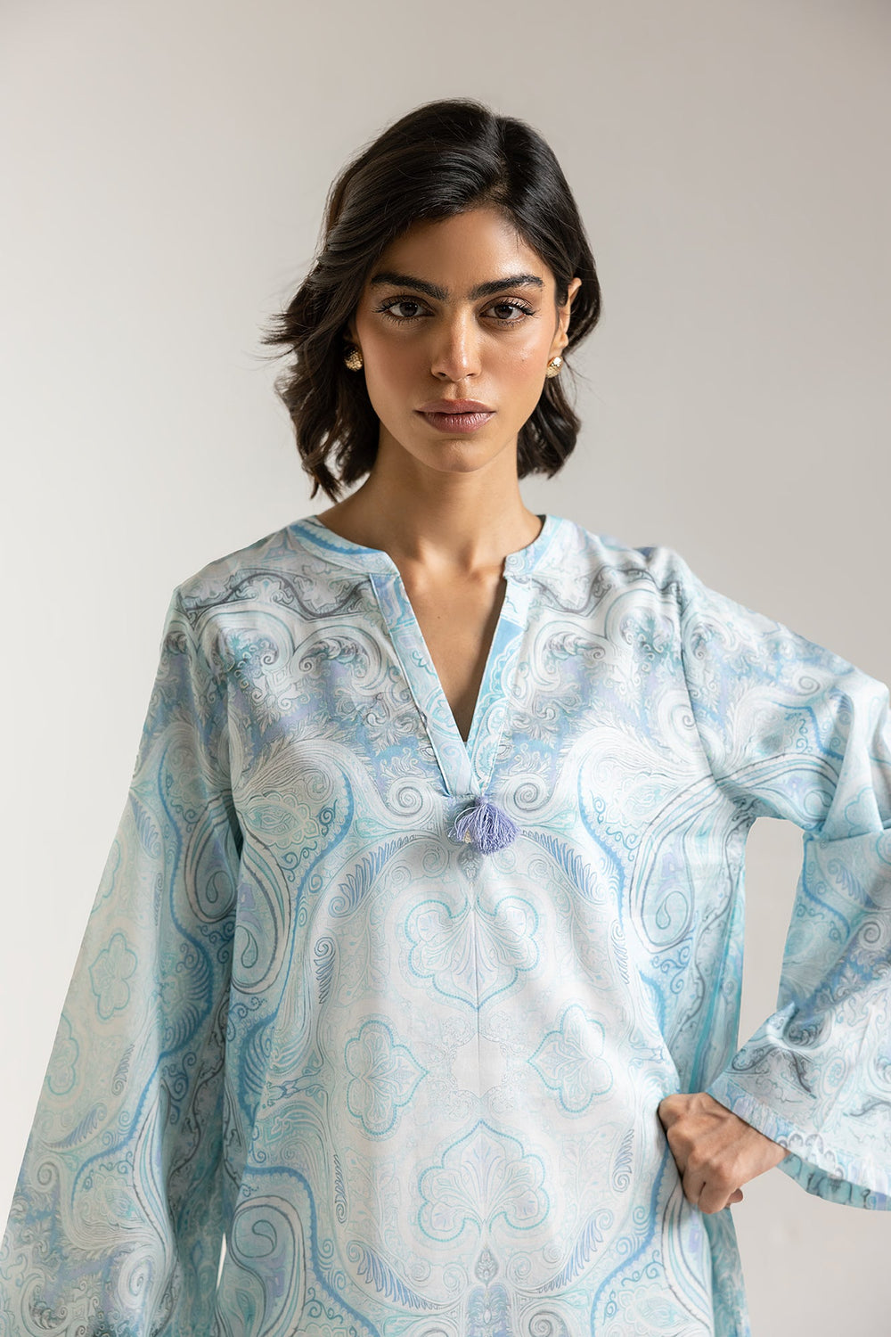 Dive into the tranquil allure of aqua hues with our printed shirt featuring mesmerizing all-over print of delicate paisleys and swirling patterns, reminiscent of gentle ocean currents. The flattering V-neckline, subtly adorned with a central embellishment, adds a touch of refined elegance. Crafted for ultimate comfort and breathability, its relaxed fit and graceful silhouette make it an ideal choice for any day.
