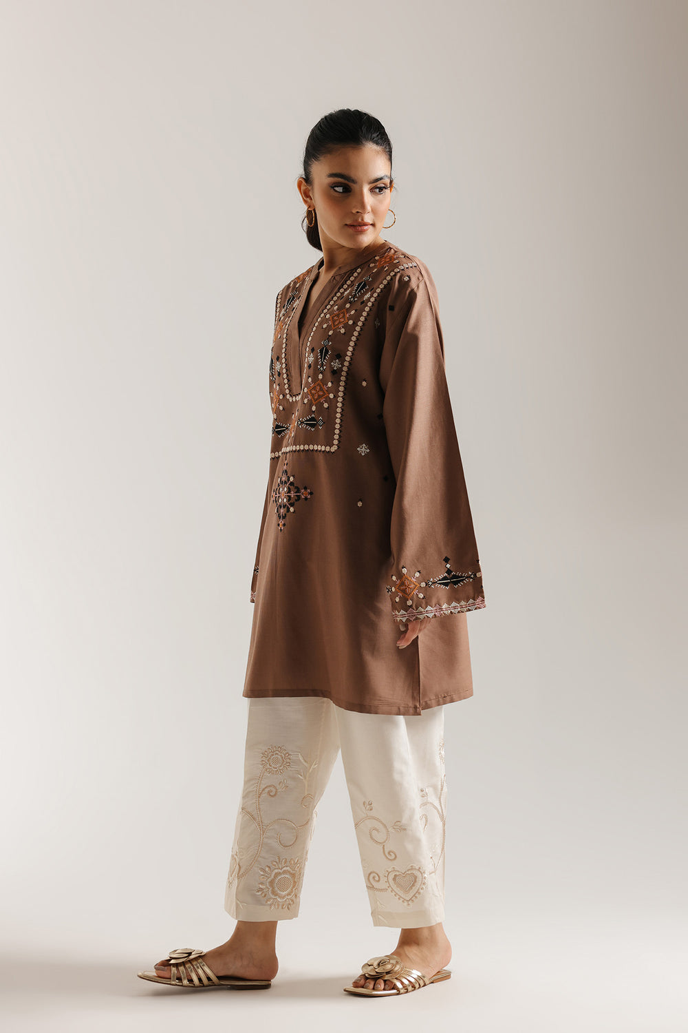 Exude simple elegance with this charming dark brown embroidered kurti. It is delicately embellished with geometric embroidery in terracotta, black, and beige tones, focusing around the neckline and on the cuffs of the full-length sleeves. The shirt features a flattering V-neckline with a band collar. Its understated design makes it a versatile piece for effortless everyday style.