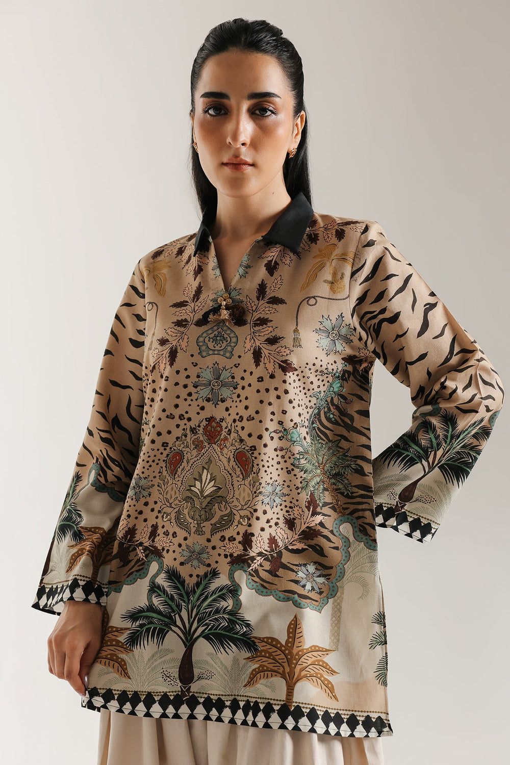 Step out in style with this stunning beige printed kurti. This short, A line-cut shirt is a captivating canvas, featuring a sophisticated wildlife-inspired print. The design showcases a mix of bold tiger stripes across the shoulders and back, transitioning into detailed botanical motifs, including palm trees and traditional paisleys in rich brown, green, and black tones. It has a v-slit neckline with a black collar and is finished with a graphic black and white checkered border at the hem.
