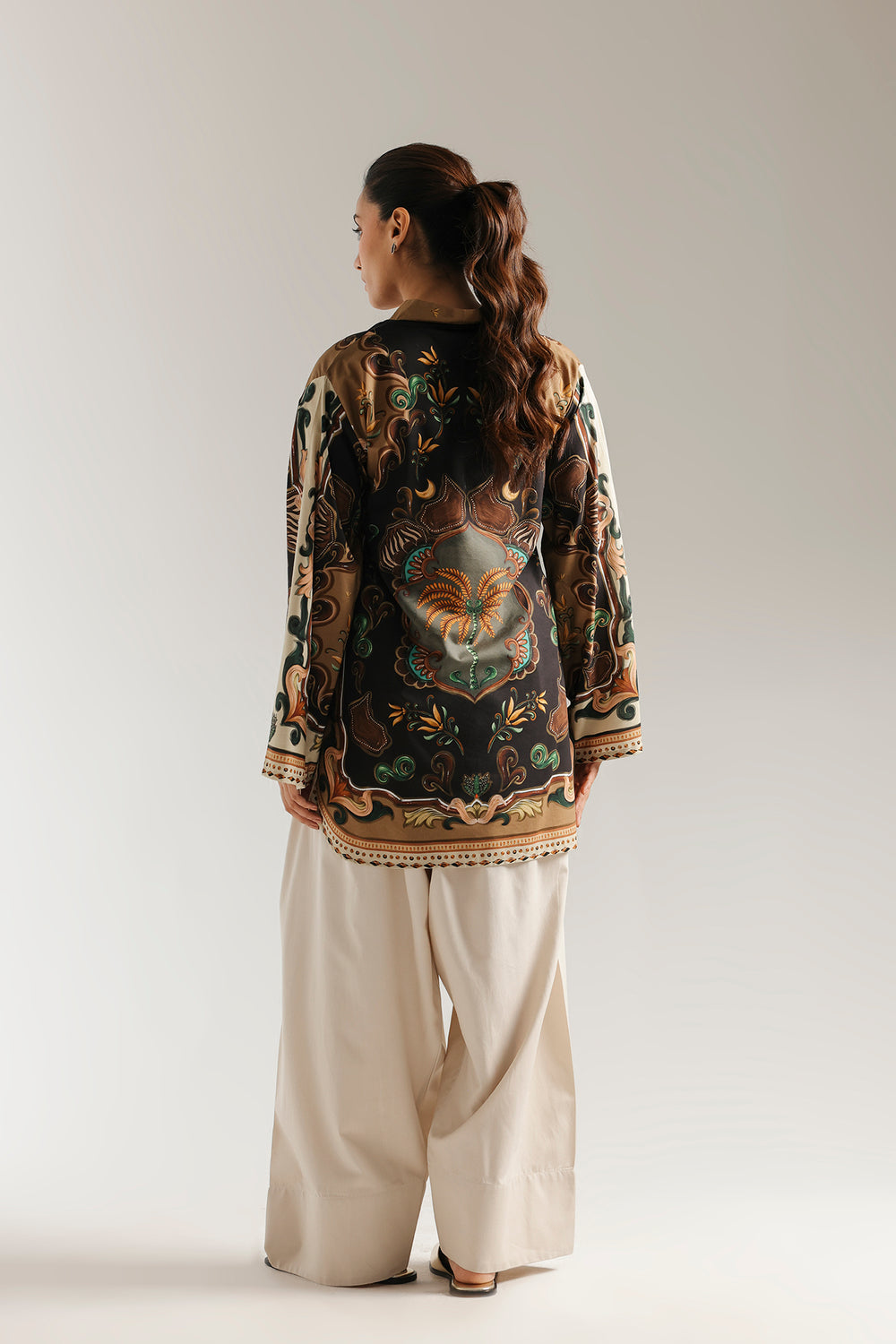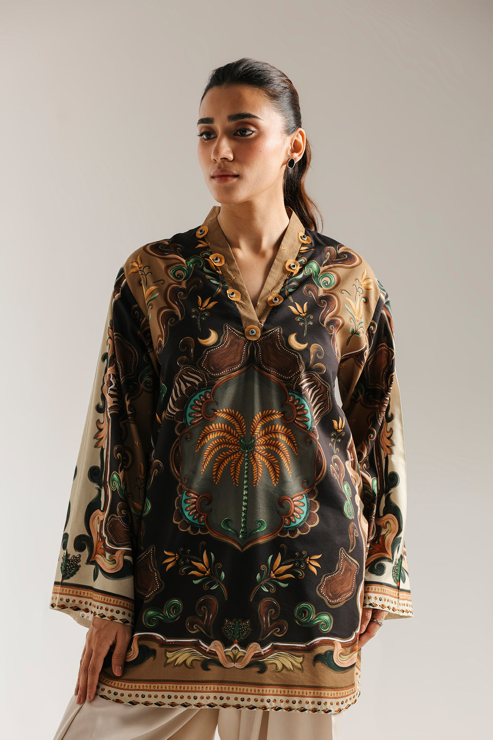 An artistic journey on fabric, this captivating printed kurti is a true statement piece. The deep black base is a canvas for an intricate and bold print featuring a striking palm-like motif and detailed borders in a rich palette of deep green, mustard yellow, and beige. Its elegant silhouette makes it a perfect choice for a unique and sophisticated look.