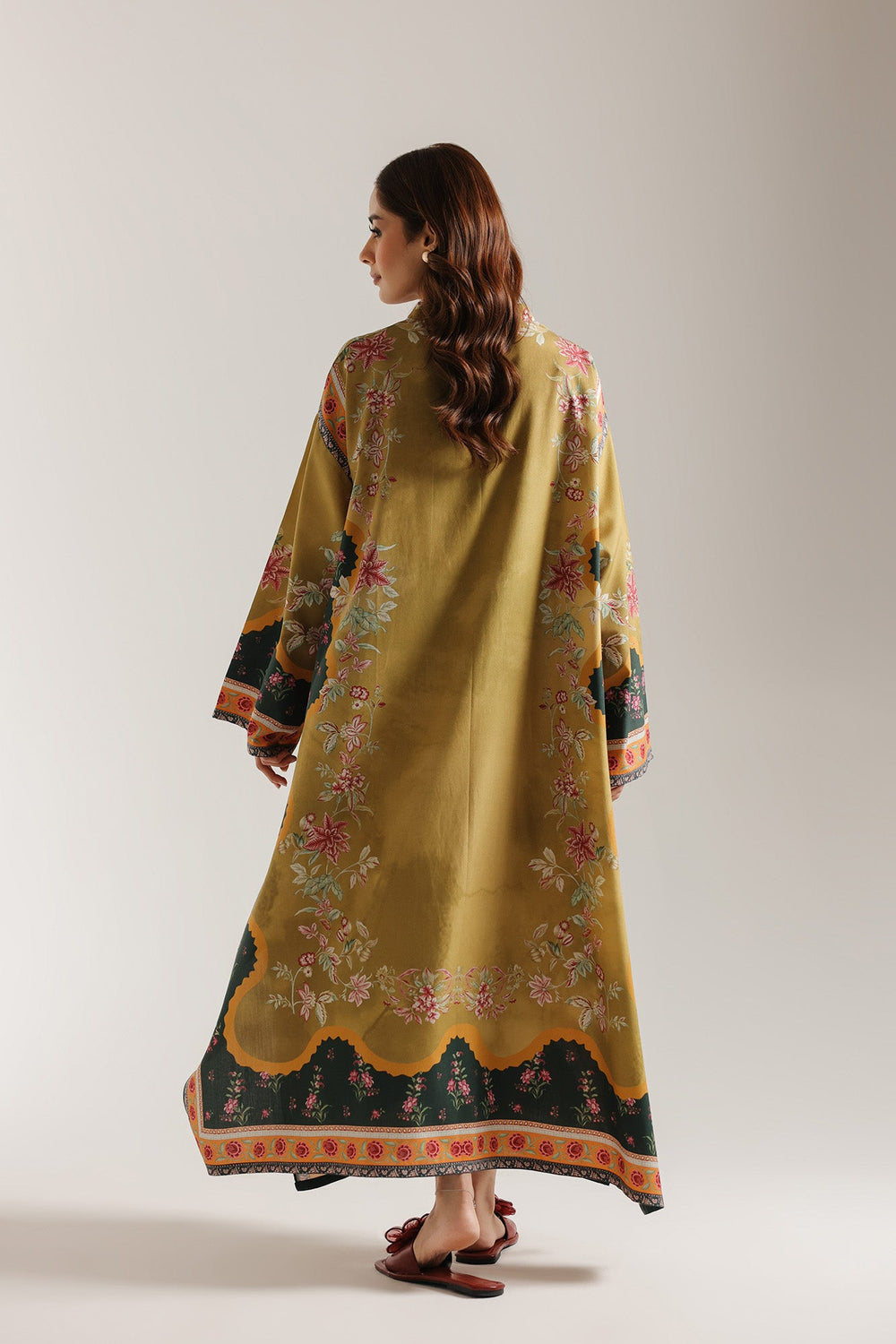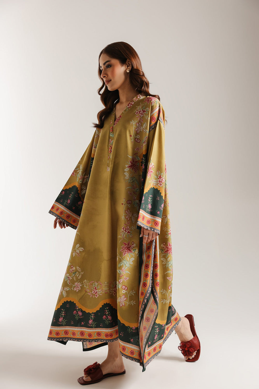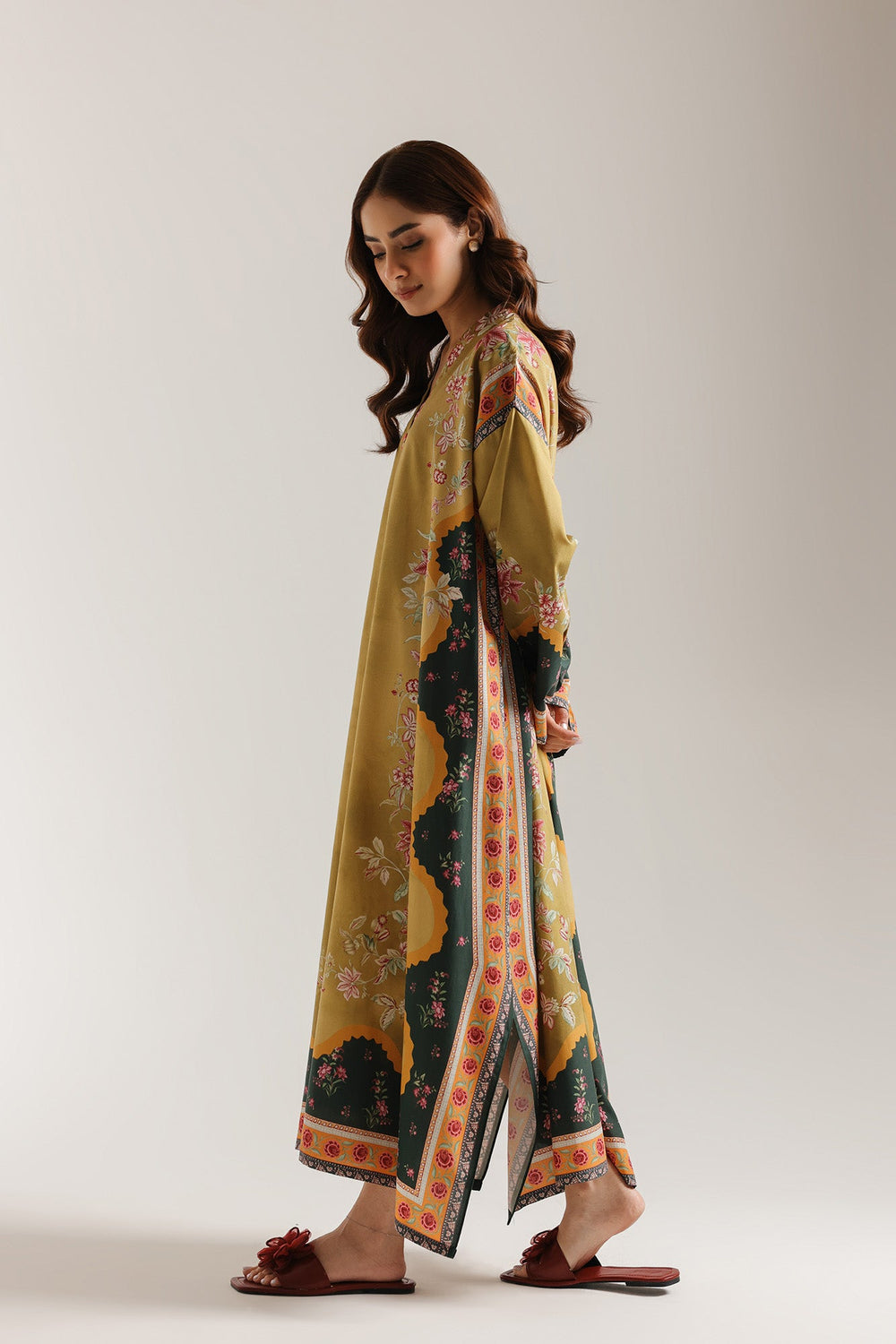 Indulge in the rich, earthy tones of this elegant printed kurti. This long, flowing kurti is crafted from a fabric in a sophisticated mustard yellow hue. It is beautifully decorated with an all-over floral and vine print in shades of pink, pale green, and dark green. The design is accented by a striking border along the hemline and sleeves, providing a luxurious finish. The shirt features a classic V-neckline with a short placket. This piece is a perfect blend of comfort and vivid traditional artistry for a refined daytime look.