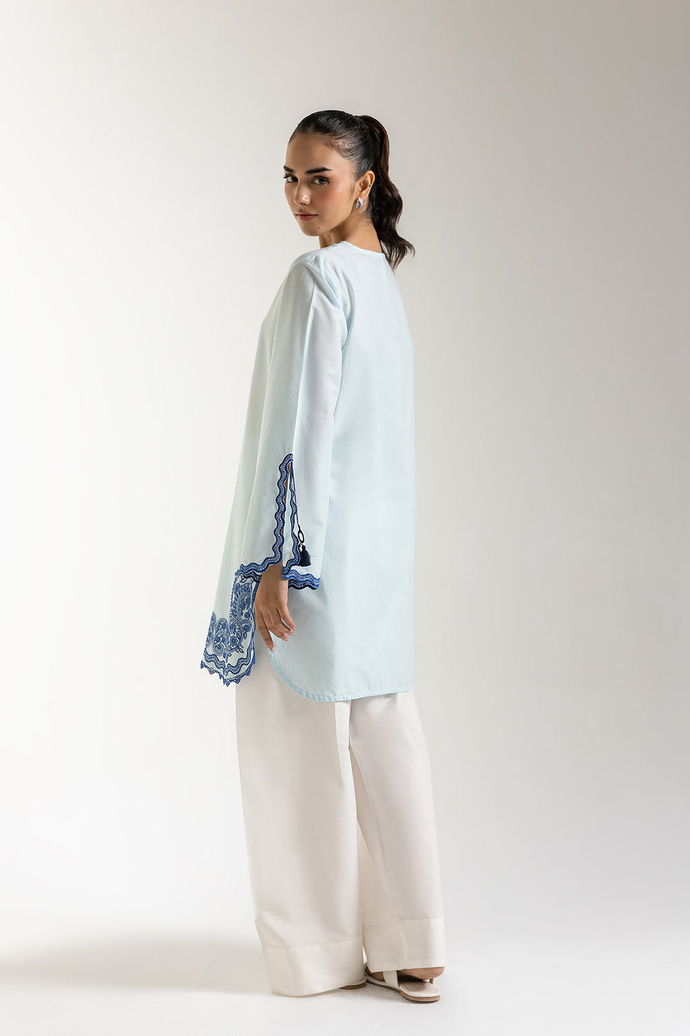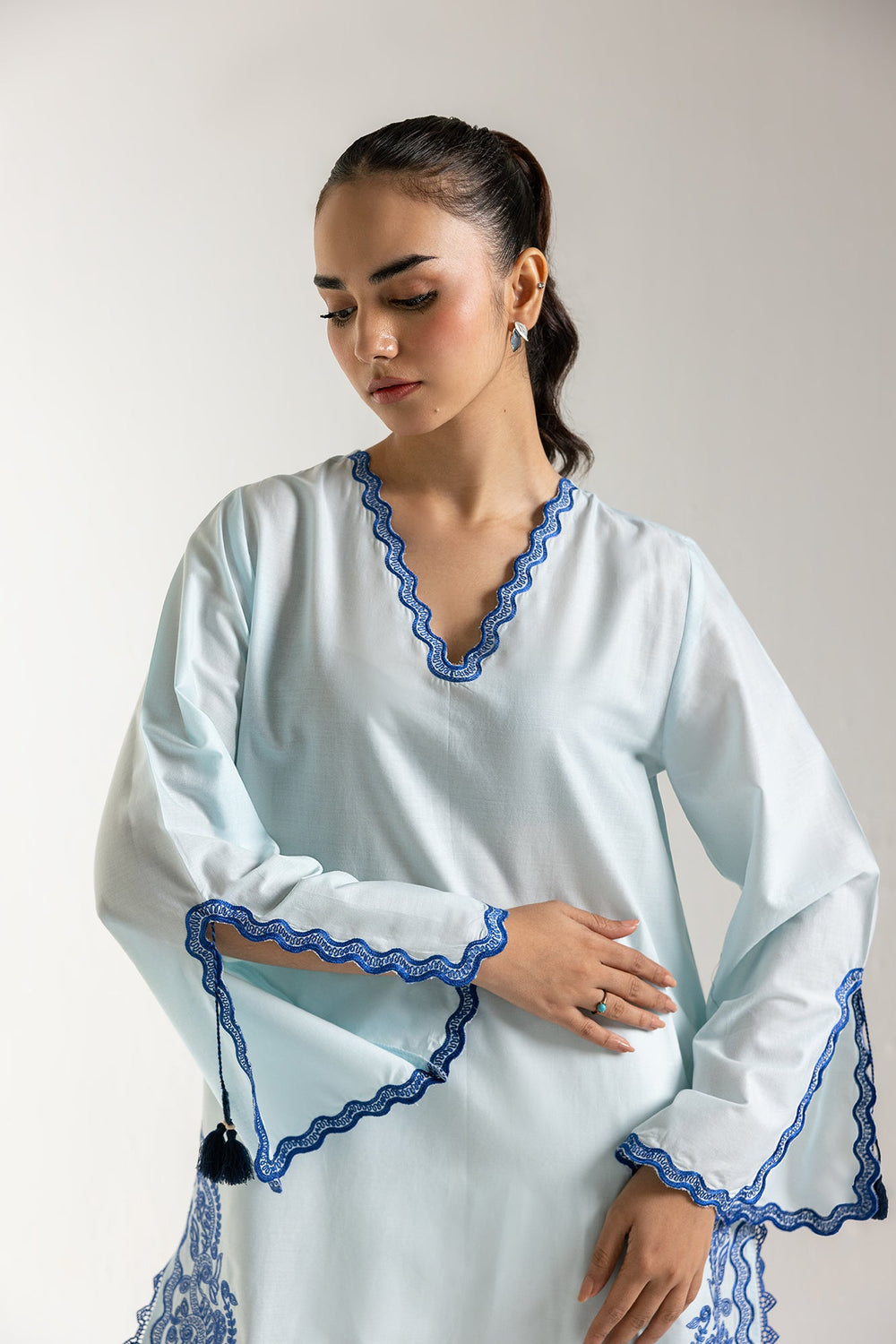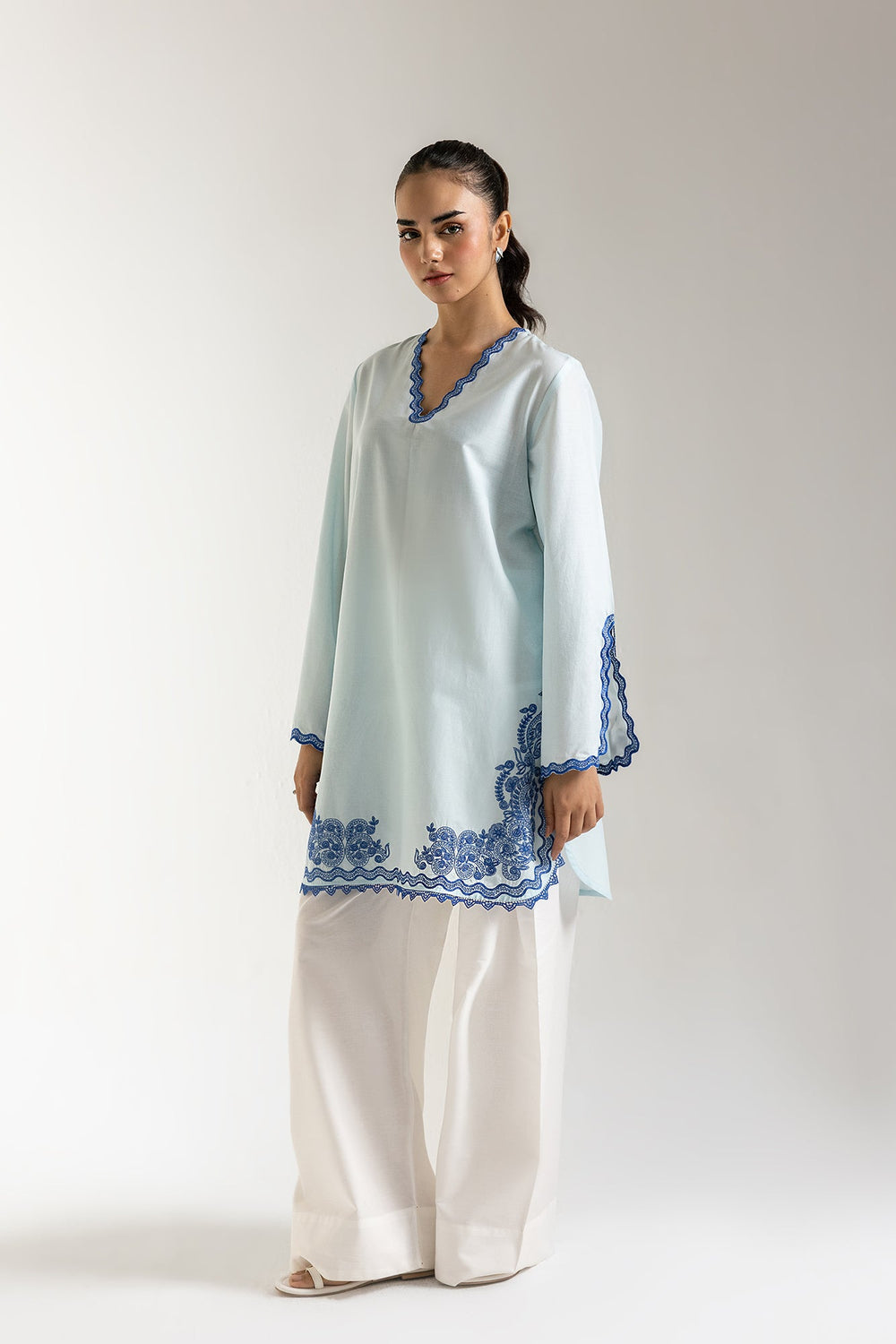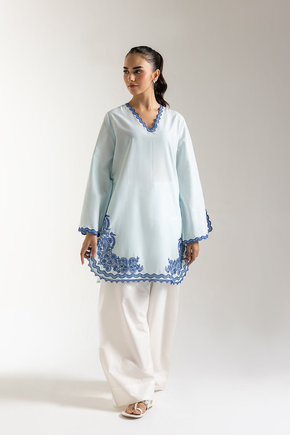 Step into effortless elegance with our azure bloom embroidered tunic, a chic essential for your wardrobe. Crafted in a serene light blue hue, this comfortable tunic features a classic V-neckline adorned with delicate scalloped trim. The standout detail is the intricate, contrasting blue floral embroidery gracing the lower border and cuffs, adding a touch of sophisticated artistry. With its relaxed yet refined silhouette, this versatile shirt is perfect for pairing with white trousers or culottes for a fresh daytime look, or dressing up for casual gatherings.