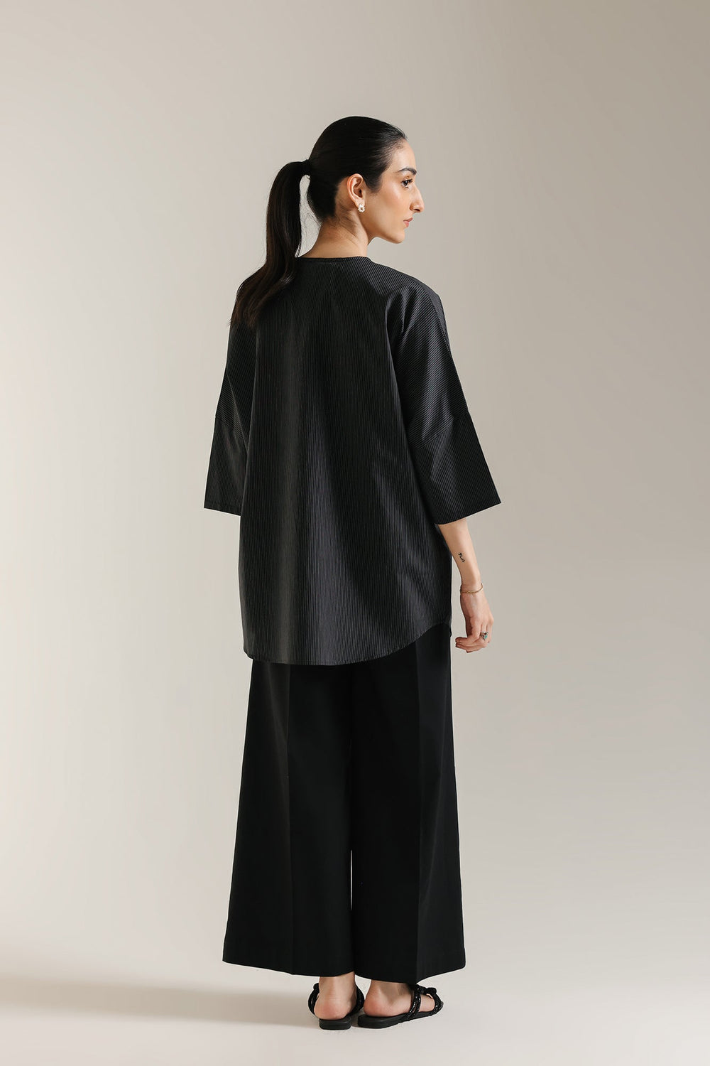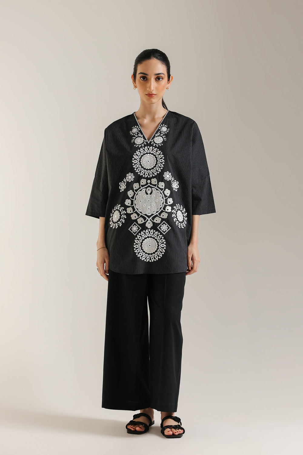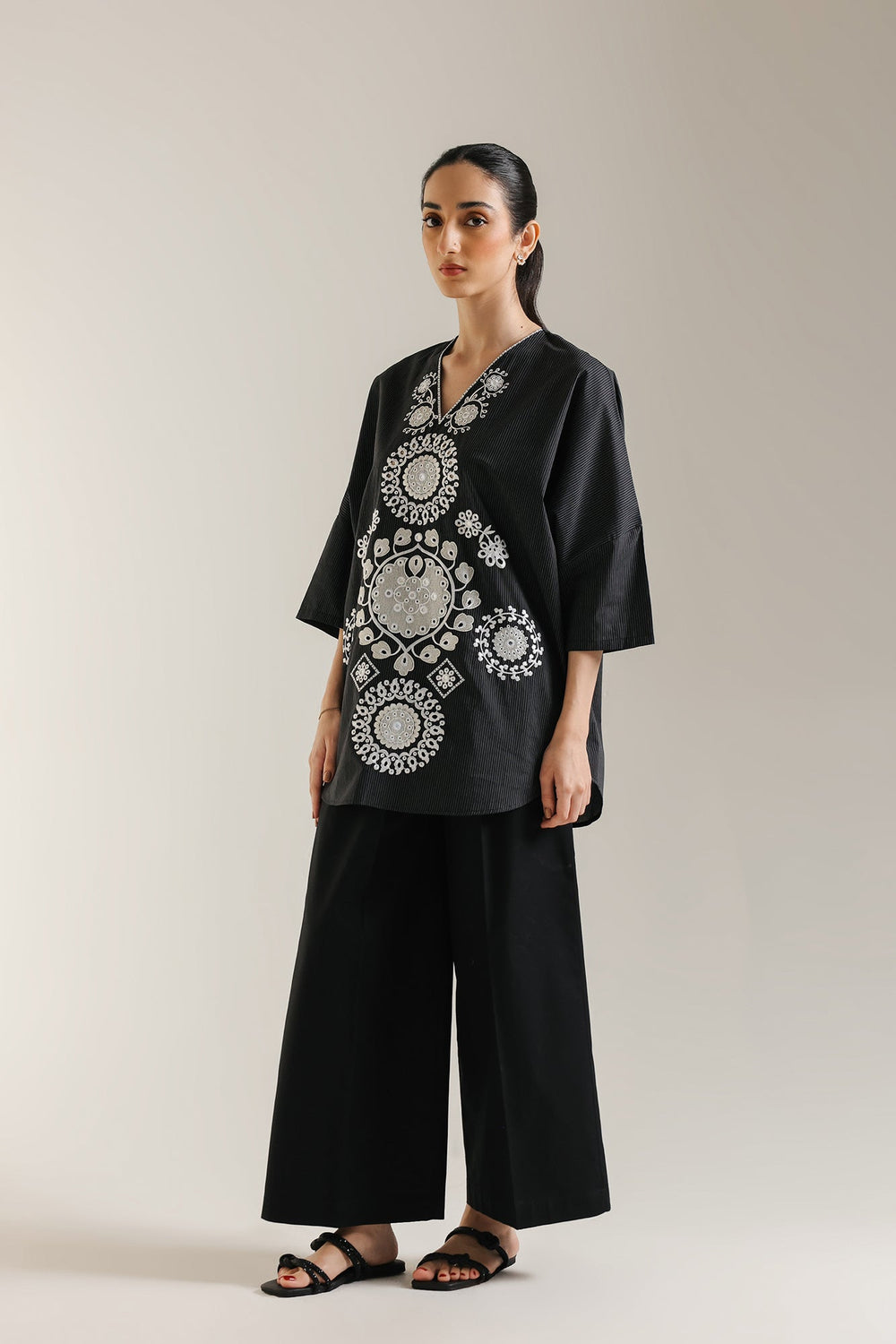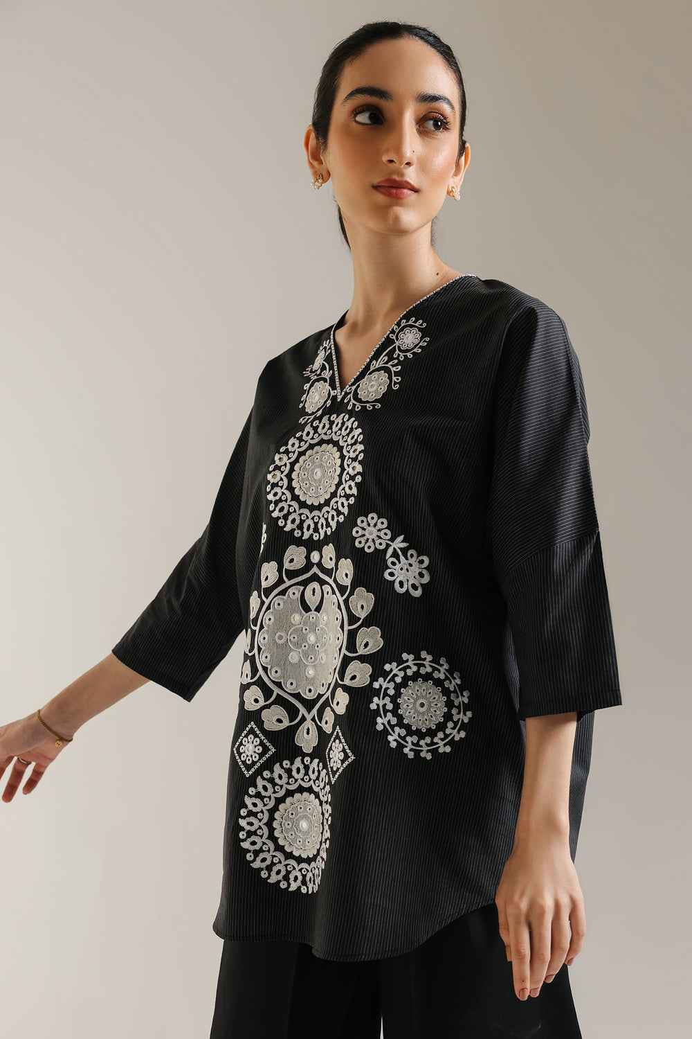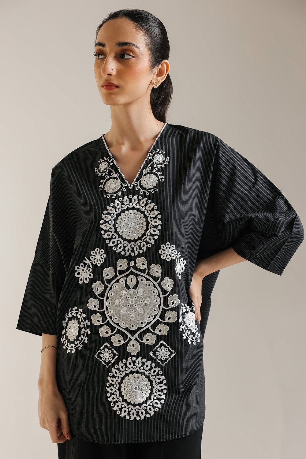 Step into sophisticated elegance with this striking black shirt, a perfect fusion of classic black and dazzling embellishments. The chic black kurta features subtle vertical stripes and is beautifully adorned with intricate white embroidery, forming elaborate floral and medallion motifs that shimmer across the bodice and neckline. Pair it with a complementing black trouser to complete the look.